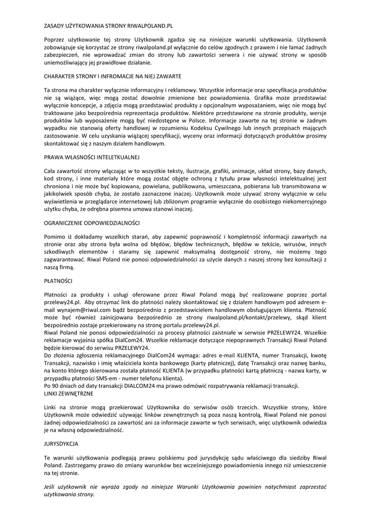 ZASADY UŻYTKOWANIA STRONY RIWALPOLAND.PL Poprzez użytkowanie tej strony Użytkownik zgadza się na niniejsze warunki użytkowania. Użytkownik zobowiązuje się korzystać ze strony riwalpoland.pl wyłącznie do celów zgodnych z prawem i nie łamać żadnych zabezpieczeń, nie wprowadzać zmian do strony lub zawartości serwera i nie używać strony w sposób uniemożliwiający jej prawidłowe działanie. CHARAKTER STRONY I INFROMACJE NA NIEJ ZAWARTE Ta strona ma charakter wyłącznie informacyjny i reklamowy. Wszystkie informacje oraz specyfikacja produktów nie są wiążące, więc mogą zostać dowolnie zmienione bez powiadomienia. Grafika może przedstawiać wyłącznie koncepcje, a zdjęcia mogą przedstawiać produkty z opcjonalnym wyposażaniem, więc nie mogą być traktowane jako bezpośrednia reprezentacja produktów. Niektóre przedstawione na stronie produkty, wersje produktów lub wyposażenie mogą być niedostępne w Polsce. Informacje zawarte na tej stronie w żadnym wypadku nie stanowią oferty handlowej w rozumieniu Kodeksu Cywilnego lub innych przepisach mających zastosowanie. W celu uzyskania wiążącej specyfikacji, wyceny oraz informacji dotyczących produktów prosimy skontaktować się z naszym działem handlowym. PRAWA WŁASNOŚCI INTELETKUALNEJ Cała zawartość strony włączając w to wszystkie teksty, ilustracje, grafiki, animacje, układ strony, bazy danych, kod strony, i inne materiały które mogą zostać objęte ochroną z tytułu praw własności intelektualnej jest chroniona i nie może być kopiowana, powielana, publikowana, umieszczana, pobierana lub transmitowana w jakikolwiek sposób chyba, że zostało zaznaczone inaczej. Użytkownik może używać strony wyłącznie w celu wyświetlenia w przeglądarce internetowej lub zbliżonym programie wyłącznie do osobistego niekomercyjnego użytku chyba, że odrębna pisemna umowa stanowi inaczej. OGRANICZENIE ODPOWIEDZIALNOŚCI Pomimo iż dokładamy wszelkich starań, aby zapewnić poprawność i kompletność informacji zawartych na stronie oraz aby strona była wolna od błędów, błędów technicznych, błędów w tekście, wirusów, innych szkodliwych elementów i staramy się zapewnić maksymalną dostępność strony, nie możemy tego zagwarantować. Riwal Poland nie ponosi odpowiedzialności za użycie danych z naszej strony bez konsultacji z naszą firmą. PŁATNOŚCI Płatności za produkty i usługi oferowane przez Riwal Poland mogą być realizowane poprzez portal przelewy24.pl. Aby otrzymać link do płatności należy skontaktować się z działem handlowym pod adresem email [email protected] bądź bezpośrednio z przedstawicielem handlowym obsługującym klienta. Płatność może być również zainicjowana bezpośrednio ze strony riwalpoland.pl/kontakt/przelewy, skąd klient bezpośrednio zostaje przekierowany na stronę portalu przelewy24.pl. Riwal Poland nie ponosi odpowiedzialności za procesy płatności zaistniałe w serwisie PRZELEWY24. Wszelkie reklamacje wyjaśnia spółka DialCom24. Wszelkie reklamacje dotyczące niepoprawnych Transakcji Riwal Poland będzie kierować do serwisu PRZELEWY24. Do złożenia zgłoszenia reklamacyjnego DialCom24 wymaga: adres e-mail KLIENTA, numer Transakcji, kwotę Transakcji, nazwisko i imię właściciela konta bankowego (karty płatniczej), datę Transakcji oraz nazwę banku, na konto którego skierowana została płatność KLIENTA (w przypadku płatności kartą płatniczą - nazwa karty, w przypadku płatności SMS-em - numer telefonu klienta). Po 90 dniach od daty transakcji DIALCOM24 ma prawo odmówić rozpatrywania reklamacji transakcji. LINKI ZEWNĘTRZNE Linki na stronie mogą przekierować Użytkownika do serwisów osób trzecich. Wszystkie strony, które Użytkownik może odwiedzić używając linków zewnętrznych są poza naszą kontrolą, Riwal Poland nie ponosi żadnej odpowiedzialności za zawartość ani za informacje zawarte w tych serwisach, więc użytkownik odwiedza je na własną odpowiedzialność. JURYSDYKCJA Te warunki użytkowania podlegają prawu polskiemu pod jurysdykcję sądu właściwego dla siedziby Riwal Poland. Zastrzegamy prawo do zmiany warunków bez wcześniejszego powiadomienia innego niż umieszczenie na tej stronie. Jeśli użytkownik nie wyraża zgody na niniejsze Warunki Użytkowania powinien natychmiast zaprzestać użytkowania strony.