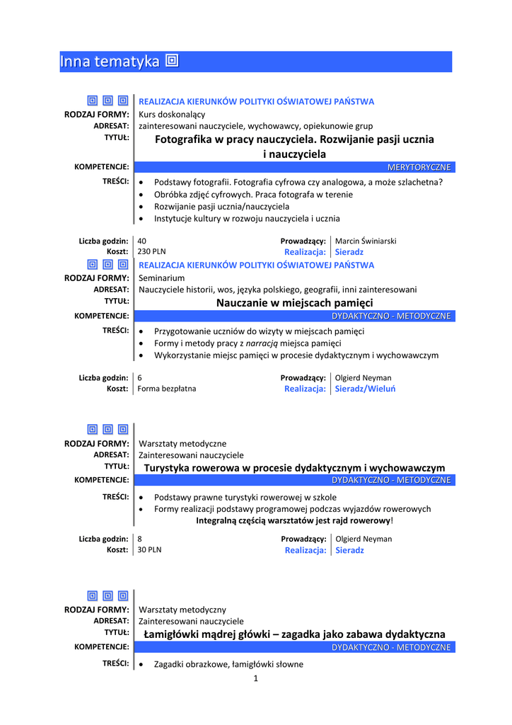 IInnnnaa tteem maattyykkaa RODZAJ FORMY: ADRESAT: TYTUŁ: REALIZACJA KIERUNKÓW POLITYKI OŚWIATOWEJ PAŃSTWA Kurs doskonalący zainteresowani nauczyciele, wychowawcy, opiekunowie grup Fotografika w pracy nauczyciela. Rozwijanie pasji ucznia i nauczyciela KOMPETENCJE: TREŚCI: Liczba godzin: Koszt: RODZAJ FORMY: ADRESAT: TYTUŁ: MERYTORYCZNE Podstawy fotografii. Fotografia cyfrowa czy analogowa, a może szlachetna? Obróbka zdjęć cyfrowych. Praca fotografa w terenie Rozwijanie pasji ucznia/nauczyciela Instytucje kultury w rozwoju nauczyciela i ucznia 40 230 PLN Prowadzący: Realizacja: Sieradz REALIZACJA KIERUNKÓW POLITYKI OŚWIATOWEJ PAŃSTWA Seminarium Nauczyciele historii, wos, języka polskiego, geografii, inni zainteresowani Nauczanie w miejscach pamięci KOMPETENCJE: TREŚCI: Liczba godzin: Koszt: Marcin Świniarski DYDAKTYCZNO - METODYCZNE Przygotowanie uczniów do wizyty w miejscach pamięci Formy i metody pracy z narracją miejsca pamięci Wykorzystanie miejsc pamięci w procesie dydaktycznym i wychowawczym 6 Forma bezpłatna Prowadzący: Olgierd Neyman Realizacja: Sieradz/Wieluń RODZAJ FORMY: ADRESAT: TYTUŁ: Warsztaty metodyczne Zainteresowani nauczyciele Turystyka rowerowa w procesie dydaktycznym i wychowawczym KOMPETENCJE: TREŚCI: DYDAKTYCZNO - METODYCZNE Liczba godzin: Koszt: Podstawy prawne turystyki rowerowej w szkole Formy realizacji podstawy programowej podczas wyjazdów rowerowych Integralną częścią warsztatów jest rajd rowerowy! 8 30 PLN Prowadzący: Olgierd Neyman Realizacja: Sieradz RODZAJ FORMY: ADRESAT: TYTUŁ: Warsztaty metodyczny Zainteresowani nauczyciele Łamigłówki mądrej główki – zagadka jako zabawa dydaktyczna KOMPETENCJE: TREŚCI: DYDAKTYCZNO - METODYCZNE Zagadki obrazkowe, łamigłówki słowne 1 Liczba godzin: Koszt: Propozycje ćwiczeń usprawniających logiczne myślenie 8 30 PLN Prowadzący: Dorota Chrzanowska-Czechowicz Realizacja: Sieradz/Wieluń RODZAJ FORMY: ADRESAT: TYTUŁ: Warsztaty metodyczny Zainteresowani nauczyciele Mów do mnie jeszcze … – ćwiczenia z emisji głosu dla nauczycieli KOMPETENCJE: TREŚCI: DYDAKTYCZNO - METODYCZNE Liczba godzin: Koszt: Ćwiczenia dykcyjne i intonacyjne dla nauczycieli Materiały tekstowe do ćwiczeń praktycznych 8 30 PLN Prowadzący: Dorota Chrzanowska-Czechowicz Realizacja: Sieradz/Wieluń RODZAJ FORMY: ADRESAT: TYTUŁ: Warsztaty metodyczne Zainteresowani nauczyciele Kiedy dzieci się nudzą … są gazety do czytania i do zabaw kreowania. Pomysły na gry i zabawy KOMPETENCJE: TREŚCI: DYDAKTYCZNO - METODYCZNE Liczba godzin: Koszt: Propozycje wykorzystania gazety jako narzędzia do różnego rodzaju zabaw (np. świetlicowych) w różnym przedziale wiekowym Gazeta w grach językowych, ruchowych, manualnych Zabawy ruchowe, umysłowe, manualne 12 40 PLN Prowadzący: Dorota Chrzanowska-Czechowicz Realizacja: Sieradz/Wieluń RODZAJ FORMY: ADRESAT: TYTUŁ: Seminarium Zainteresowani nauczyciele Wyjdź z ławki. Propozycje zabaw ruchowych dla uczniów szkoły podstawowej KOMPETENCJE: TREŚCI: Liczba godzin: Koszt: DYDAKTYCZNO - METODYCZNE Propozycje zabaw ruchowych dla dzieci w różnym przedziale wiekowym Zabawy orientacyjno – porządkowe, wyścigi na wesoło, zabawy z muzyką 6 Forma bezpłatna Prowadzący: Dorota Chrzanowska-Czechowicz Realizacja: Sieradz/Wieluń 2