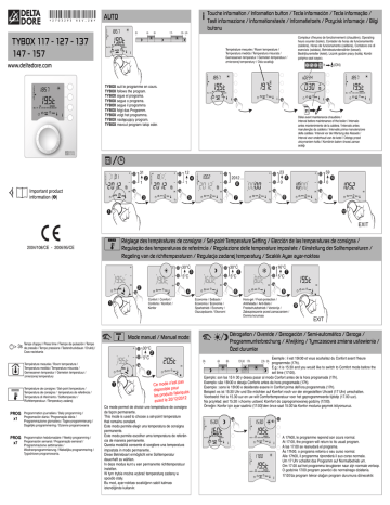 *2703293_Rev.2b* i AUTO 0h 6h 8h 17h Touche information / Information button / Tecla información / Tecla informação / Tasti informazione / Informationstaste / Informatietoets / Przycisk informacje / Bilgi butonu 23h 24h TYBOX 117 - 127 - 137 147 - 157 Compteur d’heures de fonctionnement (chaudière), Operating hours counter (boiler), Contador de horas de funcionamiento (caldera), Horas de funcionamento (caldeira), Contatore ore di esercizio (caldaia), Betriebsstundenzähler (kessel), Bedrijfsurenteller (ketel), Licznik godzin pracy (kotła), Kombi çalışma saat sayacı. Température mesurée / Room temperature / Temperatura medida / Temperatura misurata / Gemessenen temperatur / Gemeten temperatuur / zmierzonej temperatury / Oda sıcaklığı www.deltadore.com 0 2 3 TYBOX suit le programme en cours. TYBOX follows the program. TYBOX sigue el programa. TYBOX segue o programa. TYBOX segue il programma TYBOX folgt das Programm. TYBOX volgt het programma. TYBOX następujący program. TYBOX mevcut programı takip eder. 31 Important product information (➍) h (ON) Délai avant maintenance chaudière / Interval before maintenance of the boiler / Intervalo antes mantenimiento de la caldera / Intervalo antes manutenção da caldeira / Intervallo prima manutenzione della caldaia / Interval vor der Wartung des Kessels / Interval voor onderhoud van de ketel / Odstęp przed utrzymaniem kotła / Kombinin bakım öncesi zaman aralığı 23 12 2 1 3 5 59 8 2012 ... 6 4 1 4 5 10 0 0 9 7 11 1 12 EXIT Réglage des températures de consigne / Set-point Temperature Setting / Elección de las temperaturas de consigna / Regulação das temperaturas de referência / Regolazione delle temperature impostate / Einstellung der Solltemperaturen / Regeling van de richttemperaturen / Regulacja zadanej temperatury / Sıcaklık Ayarı ayar-noktası 2004/108/CE - 2006/95/CE 2 30°C 3 5°C 30°C 5 5°C 4 6 Confort / Comfort / Conforto / Komfort / Konfor 1 Temps d’appui / Press time / Tiempo de pulsación / Tempo de pressão / Tempo pressione / Tastendruckdauer / Druktij / Czas naciskania 30°C 2 5°C Température mesurée / Room temperature / Temperatura medida / Temperatura misurata / Gemessenen temperatur / Gemeten temperatuur / zmierzonej temperatury Economie / Setback / Economía / Economia / Sparbetrieb / Economy / Oszczędzanie / Ekonomi 1 Température de consigne / Set-point temperature / Temperatura de consigna / temperatura de referência / Temperatura di riferimento / Solltemperatur / Richttemperatuur / Temperatury zadanej PROG x1 Programmation journalière / Daily programming / Programación diaria / Programação diária / Programmazione giornaliera / Tages-programmierung / Dagelijks programmering / Dzienne programowania PROG x7 Programmation hebdomadaire / Weekly programming / Programación semanal / Programação semanal / Programmazione settimanale / Wochenprogrammierung / Wekelijks programmering / Tygodniowe programowania. t pas Ce mode n'es ur po le ib on disp briqués les produits fa 2012 2/ /1 20 le t an av Ce mode permet de choisir une température de consigne de façon permanente. This mode is used to choose a set-point temperature that remains constant. Este modo permite elegir una temperatura de consigna permanente. Este modo permite escolher uma temperatura de referência de maneira permanente. Questa modalità consente di scegliere una temperatura impostata in modo permanente. Diese Betriebsart ermöglicht eine Solltemperatur dauerhaft zu wählen. In deze modus kunt u een permanente richttemperatuur instellen. W tym trybie można wybrać temperaturę zadaną w sposób stały. Bu mod, ayar-noktası sıcaklığının sabit kalması istendiğinde kullanılır. 9 EXIT Dérogation / Override / Derogación / Semi-automàtico / Deroga / Programmunterbrechung / Afwijking / Tymczasowa zmiana ustawienia / Özel durumlar Exemple : il est 15h30 et vous souhaitez du Confort avant l'heure programmée (17h). E.g.: it is 15:30 and you would like to switch to Comfort mode before the set time (17:00). Ejemplo: son las 15 h 30 y desea pasar al modo Confort antes de la hora programada (17h). Exemplo: são 15h30 e deseja Conforto antes da hora programada (17h). Esempio : sono le 15h30 e desiderate essere in Confort prima dell’ora programmata (17h). Beispiel: es ist 15:30 Uhr und Sie möchten auf Komfort noch vor der eingestellten Uhrzeit (17 Uhr) umschalten. Voorbeeld: Het is 15.30 uur en uw wilt Comforttemperatuur voor het geprogrammeerde tijdstip (17.00 uur). Na przykład: jest 15.30 i chcemy ustawić Komfort do zaprogramowanej godziny (17.00). Örneğin: Konfor için ayar saatiniz (17:00)’den önce saat 15:30’da Konfor moduna geçmek istiyorsunuz. 0h 3 8 Hors-gel / Frost-protection / Antihelada / Anti-Gelo / Frostschutzbetrieb / Vorstvrije / Zabezpieczenie przed zamarzaniem / Donma koruması Mode manuel / Manual mode > 3s 16°C 7 5°C 6h 8h 15h30 17h 23h 0h A 17h00, le programme reprend son cours normal. At 17:00, the program will return to its usual program. A las 17.00 se reanudará el programa. Às 17h00, o programa retoma o seu curso normal. Alle 17h00, il programma riprenderà il suo corso normale. Um 17 Uhr schaltet das Programm auf Normalbetrieb um. Om 17.00 zal het programma terugkeren naar zijn normale verloop. O godzinie 17.00 program powróci do normalnego działania. 17:00’da program tekrar olağan program durumuna dönecektir. PROG 0h 6h 8h 23h 24h 17h Exemple : Confort de 6h à 8h et de 17h à 23h E.g. Comfort from 6:00 to 8:00 and from 17:00 to 23:00 Ejemplo : Confort de 6.00 a 8.00 y de 17.00 a 23.00h Exemplo: Conforto das 6h às 8h e das 17h às 23h Esempio : Confort dalle 6h alle 8h e dalle 17h alle 23h Beispiel: Komfortbetrieb von 6 bis 8 Uhr und von 17 bis 23 Uhr Voorbeeld: Comfort van 6.00 tot 8.00 uur en van 17.00 tot 23.00 uur Na przykład: Komfort od 6h do 8h i od 17h do 23h Örneğin: 6:00’dan 8:00’e ve 17:00’dan 23:00 Konfor PROG x1 Période d’économie Setback per