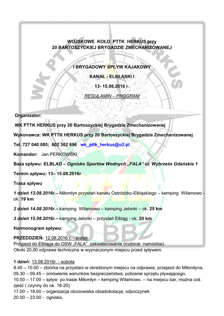WOJSKOWE KOŁO PTTK HERKUS przy 20 BARTOSZYCKIEJ BRYGADZIE ZMECHANIZOWANEJ I BRYGADOWY SPŁYW KAJAKOWY KANAŁ - ELBŁĄSKI I 13- 15.08.2016 r. REGULAMIN – PROGRAM Organizator: WK PTTK HERKUS przy 20 Bartoszyckiej Brygadzie Zmechanizowanej Wykonawca: WK PTTK HERKUS przy 20 Bartoszyckiej Brygadzie Zmechanizowanej Tel. 727 040 085; 602 362 696 [email protected] Komandor: Jan PERKOWSKI Baza spływu: ELBLAG – Ognisko Sportów Wodnych „FALA” ul. Wybrzeże Gdańskie 1 Termin spływu: 13– 15.08.2016r. Trasa spływu 1 dzień 13.08.2016r.– Miłomłyn przystań kanału Ostródzko-Elbląskiego – kemping Wilamowo ok. 19 km 2 dzień 14.08.2016r.– kamping Wilamowo – kamping Jelonki – ok. 25 km 3 dzień 15.08.2016r.– kamping Jelonki – przystań Elbląg - ok. 20 km Harmonogram spływu: PRZEDDZIEŃ: 12.08.2016 r. - piątek Przyjazd do Elbląga do OSW „FALA” zakwaterowanie (rozbicie namiotów). Około 20,00 odprawa techniczna w wyznaczonym miejscu przed spływem. 1 dzień: 13.08.2016r. - sobota 8.45 – 10.00 – zbiórka na przystani w określonym miejscu na odprawie, przejazd do Miłomłyna, 09.30 – 09.45 – omówienie warunków bezpieczeństwa, pobranie sprzętu pływającego, 10.00 – 17.00 – spływ po trasie Miłomłyn – kemping Wilamowo. – na miejscu bar, można coś zjeść ( czynny do ok. 18-20) 17.00 – 18.00 – organizacja obozowiska obiadokolacja, odpoczynek 20.00 – 23.00 - ognisko. 2 dzień : 14.08.2016r. - niedziela 09.00 – 9.30 - zbiórka przy kajakach 09.30 – 09.45 - likwidacja obozowiska omówienie warunków bezpieczeństwa, zejście na wodę 9.45 – 18.00 - spływ po trasie kemping Wilamowo- przez 4 pochylnie (Buczyniec-Kąty-OleśnicaJelenie) 18.00 – 18.10 - lądowanie na kempingu Jelonki 18.10 - 19.30 - organizacja obozowiska , obiadokolacja, odpoczynek 20.30 – 23.00 - ognisko. 3 dzień: 15.08.2016r. - poniedziałek 09.00 – 9.30 - zbiórka przy kajakach 09.30 – 09.45 - likwidacja obozowiska omówienie warunków bezpieczeństwa, zejście na wodę 09.45 – 17.00 - spływ po trasie kemping Jelonki – pochylnia Całuny Nowe – Jezioro DruznoOSW „FALA” Elbląg 17.00 – 19.00 - rozliczenie kajaków uregulowanie płatności, załatwienie wszystkich formalności 19.00 - Oficjalne zakończenie spływu. Warunki uczestnictwa w spływie oraz zgłoszenia. 1. W spływie mogą brać udział członkowie kół klubów PTTK z posiadający ważną legitymację oraz inne osoby z opłaconym ubezpieczeniem (członkowie PTTK są ubezpieczeni z urzędu) uczestnicy z nieopłaconym ubezpieczeniem biorą na siebie pełną odpowiedzialność za możliwe wypadki popełnione z własnej winy. 2. Ilość przewidywanych uczestników ograniczona ok. 15-20 osób ( do 10 kajaków). 3. Po dokonaniu zgłoszenia telefonicznego należy uiścić przedpłatę 100 zł od osoby do organizatora spływu. Jan PERKOWSKI ul Kardynała Wyszyńskiego 9/7 11-200 BARTOSZYCE mBank - 08 1140 2004 0000 3502 4529 7842 4. Zgłoszenie uczestnictwa w spływie dokonywać telefonicznie bądź drogą mailową do zarządu PTTK Herkus 6. Przy zgłoszeniu elektronicznym należy podać następujące dane: imię i nazwisko uczestnika, adres, PESEL i nr kontaktowy telefonu na adres mailowy: [email protected] (nie dotyczy członków PTTK Herkus) 7. Ostateczny termin nadsyłania zgłoszeń upływa z dniem 1 sierpnia 2016 r. W razie rezygnacji z udziału w spływie po 3 sierpnia 2016r. opłaty nie będą zwracane. Koszty 1. Przewidywalny koszt uczestnictwa w spływie wynosi : - Wynajem kajaka dwuosobowego 40 zł/doba - Wynajem kajaka jednoosobowego 35 zł/doba - Transport busa 2 zł za km (przejazd z Elbląga do Miłomłyna-transport kajaków) - pole namiotowe – rozbicie namiotu małego (2 osobowego) ok. 10 zł - pole namiotowe – rozbicie namiotu dużego (2 osobowego +) ok. 15 zł - opłata za śluzowanie 4 zł za kajak 1 pochylnia (5 pochylni x 4) 20 zł śluzowanie 1 kajaka Dodatkowe informacje. 1. Noclegi przed startem i po spływie można załatwić we własnym zakresie (po wcześniejszym powiadomieniu organizatora), w pobliżu jest dość dobra baza noclegowa. 2. Pole namiotowe : I-biwak - dociągnięty jest prąd i woda; sanitariaty. II-biwak - dociągnięty jest prąd i woda; sanitariaty. 3. Wykonawca spływu zapewnia: wpis do książeczek kajakowych (potwierdzenie udziału w spływie) znaczki okolicznościowe (button). 4. Posiłki uczestnicy zapewniają we własnym zakresie. 5. Uczestnicy we własnym zakresie zabezpieczają namioty i sprzęt biwakowy. Postanowienia końcowe. 1. W czasie trwania spływu uczestnicy winni przestrzegać praw i zasad obowiązujących na wodach oraz postanowień organizatora. 2. Uczestnicy biorą udział w spływie na własną odpowiedzialność. Za osoby niepełnoletnie odpowiedzialność ponoszą ich prawni opiekunowie lub upoważnione do opieki osoby pełnoletnie. 3. Organizator nie bierze odpowiedzialności za ewentualne straty materialne poniesione przez uczestnika w czasie trwania spływu. 4. Uczestnicy pokrywają koszty wszelkich strat materialnych spowodowanych na rzecz organizatora lub osób trzecich. 5. Spływ odbędzie się bez względu na warunki atmosferyczne. 6. Spożywanie alkoholu przed zejściem na wodę i w czasie płynięcia jest zabronione. W wypadku stwierdzenia stanu uczestnika wskazującego na upojenie alkoholowe bądź innym środkiem odurzającym zastrzega sobie prawo do niedopuszczenia danej osoby do uczestnictwa w spływie bez zwrotu poniesionych kosztów. 7. Kierownictwo spływu ze względu na bezpieczeństwo uczestników i warunki pogodowe może zmienić, skrócić a nawet odwołać poszczególne etapy spływu bez prawa rekompensat dla uczestników. 8. Podany reżim godzinowy może ulec zmianie ze względu na warunki nieprzewidziane podczas spływu. ŚLUZOWANIE : Parę słów na temat formalności związanych z pochylniami: 1. Zanim zaczniemy się śluzować (taki termin obowiązuje na pochylniach) musimy udać się na górę do