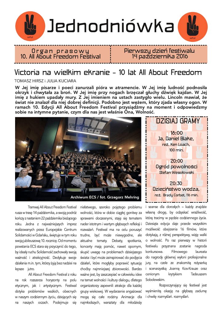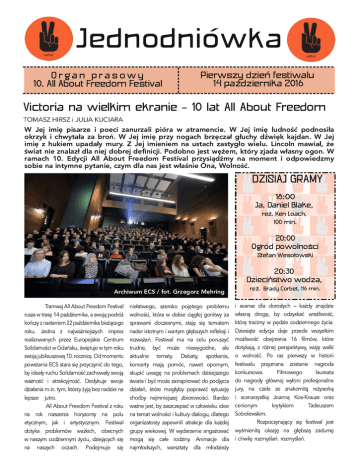 Jednodniówka O rga n p ra s o w y 10. All About Freedom Festival Pierwszy dzien festiwalu 14 pazdziernika 2016 Victoria na wielkim ekranie - 10 lat All About Freedom TOMASZ HIRSZ i JULIA KUCIARA W Jej imię pisarze i poeci zanurzali pióra w atramencie. W Jej imię ludność podnosiła okrzyk i chwytała za broń. W Jej imię przy nogach brzęczał głuchy dźwięk kajdan. W Jej imię z hukiem upadały mury. Z Jej imieniem na ustach zastygło wielu. Lincoln mawiał, że świat nie znalazł dla niej dobrej definicji. Podobno jest wężem, który zjada własny ogon. W ramach 1 0. Edycji All About Freedom Festival przysiądźmy na moment i odpowiedzmy sobie na intymne pytanie, czym dla nas jest właśnie Ona, Wolność. DZISIAJ GRAMY 18: 00 Ja, Daniel Blake, rez. Ken Loach, 100 min. 20:00 Ogród powolnosci Stefan Wesolowski 20:30 Dziecinstwo wodza, Archiwum ECS / fot. Grzegorz Mehring Tramwaj All About Freedom Festival rusza w trasę 1 4 października, a swoją podróż kończy z nastaniem 22 października bieżącego roku. Jedna z najważniejszych imprez realizowanych przez Europejskie Centrum Solidarności w Gdańsku, świętuje w tym roku swoją jubileuszową 1 0. rocznicę. Od momentu powstania ECS stara się przyczynić do tego, by ideały ruchu Solidarność zachowały swoją ważność i atrakcyjność. Dedykuje swoje działania m.in. tym, którzy żyją bez nadziei na lepsze jutro. All About Freedom Festival z roku na rok rozszerza horyzonty na polu etycznym, jak i artystycznym. Festiwal dotyka problemów ważkich, obecnych w naszym codziennym życiu, dziejących się na naszych oczach. Podejmuje się niełatwego, szeroko pojętego problemu wolności, która w dobie ciągłej gonitwy za sprawami doczesnymi, staję się tematem nader istotnym i wartym głębszych refleksji i rozważań. Festiwal ma na celu poruszyć trudne, być może niewygodne, ale aktualne tematy. Debaty, spotkania, koncerty mają pomóc, nawet opornym, skupić uwagę na problemach dzisiejszego świata i być może zainspirować do podjęcia działań, które mogłyby poprawić sytuację choćby najmniejszej zbiorowości. Bardzo ważne jest, by zaszczepiać w człowieku idee na temat wolności i kultury dialogu, dlatego organizatorzy zapewnili atrakcje dla każdej grupy wiekowej. W wydarzenie angażować mogą się całe rodziny. Animacje dla najmłodszych, warsztaty dla młodzieży rez. Brady Corbet, 116 min. i seanse dla dorosłych – każdy znajdzie własną drogę, by odzyskać wrażliwość, którą tracimy w pędzie codziennego życia. Dziesiąta edycja daje przede wszystkim możliwość obejrzenia 1 6 filmów, które dotykają, z różnej perspektywy, wizję walki o wolność. Po raz pierwszy w historii festiwalu przyznana zostanie nagroda konkursowa. Filmowego laureata do nagrody głównej wyłoni profesjonalne jury, na czele ze znakomitą reżyserką i scenarzystką Joanną Kos-Krauze oraz cenionym krytykiem Tadeuszem Sobolewskim. Rozpoczynający się festiwal jest wyśmienitą okazję na głębszą zadumę i chwilę rozmyślań. rozmyślań. Wloska robota REPORTAŻ MONIKI KUCZYŃSKIEJ-BARCZEWSKIEJ Przygotowanie na brzegach sofy. Tu w kawiarni Rozmowę trzy razy przerwie nam też wszystko robił sam, oprócz Rachel. Nazywa się tak jak położenia kabli elektrycznych. bohaterka serialu Przyjaciele, - A jak fachowiec tu pracował, a my siedzimy na pomarańczowej to ja byłem jak jego duch, jak sofie w kawiarni w gdańskiej koszmar, zawsze tu byłem, Oliwie, identycznej jak Central patrzyłem. Czasem zleciłem coś Perk. Francesco przeprasza komuś, a potem i tak zrobiłem na chwilę i odchodzi na bok. sam. Ale przez to wiem, gdzie jest Widzę jak przygotowuje chleb – każdy przewód – wspomina pone pizza. Piecze go specjalnie trochę żartobliwie. dla niego kolega z Sycylii, który ma restaurację we Wrzeszczu. Przyjmę zamówienie Takiego chleba nie znajdziesz Francesco jest w Polsce w sklepie, jest robiony z włoskiej od sześciu lat. Własną kawiarnię mąki. mają z Olą dopiero od trzech miesięcy. To na początku była Przepis na Rachel rudera, do kapitalnego remontu. Na chleb nakłada awokado, Momentami żałowali, że się mozarellę, sałatę lodową, zdecydowali. Roboty i wydatków pomidora, świeżą bazylię, było dwa razy więcej niż planowali majeranek. Na to ocet i teraz jest duży dług, który trzeba balsamiczny, majonez, sól, będzie spłacać. Francesco mówi oregano. Kanapka jest ciepła, trochę ironicznie, że jest tu pachnąca ziołami i chrupiąca. w Polsce od sześciu lat ciągle w pracy: Po swojemu - Z dni tygodnia odróżniam tylko W ofercie jest sześć rodzajów poniedziałek, bo wtedy lokal jest kanapek, ale dziś w czasie naszej zamknięty. Ale lubię taką pracę. rozmowy najpopularniejsza jest Tam skąd pochodzę, z Alghero na Rachel. Francesco kupuje do nich Sardynii, jest to normalne, że wędliny i sery sprowadzane od siedemnastego roku życia z Włoch, najlepszy gatunek każdy w sezonie pracuje warzyw. Lubi wszystko zrobić sam, w restauracjach, hotelach, przy mówi: zbiorze owoców i warzyw. - Jestem taka wasza Zosia- Uczyłem się na elektronika, ale samosia. I kawę w lokalu wolę latem dorabiałem w gastronomii przygotować sam, i kanapkę i hotelarstwie. Byłem barmanem, zrobić sam. Jak zrobię sam, kelnerem, pracowałem w piekarni, to wiem, co zrobiłem i co tam jako pizza-szef. jest. Ola, jego żona, uważa, że Po przyjeździe do Polski od razu jest perfekcjonistą, ale on mówi, zaczął pracę we włoskiej że do perfekcji mu daleko. restauracji w Sopocie, najpierw W czasie naszej rozmowy na sali, chociaż wcale nie znał poprawia serwetnik, który języka. Podchodził do klienta przestawiłam i wyciera kurz z jednym zdaniem: „Mówię tylko STRONA 2 trochę po polsku”, a potem dopowiadał i po włosku, i po angielsku. Ludzie to doceniali i mówili, że jest w restauracji włoski klimat. Ola woła, że jest zamówienie na Rachel. Danie główne i
