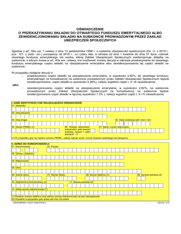 OŚWIADCZENIE O PRZEKAZYWANIU SKŁADKI DO OTWARTEGO FUNDUSZU EMERYTALNEGO ALBO ZEWIDENCJONOWANIU SKŁADKI NA SUBKONCIE PROWADZONYM PRZEZ ZAKŁAD UBEZPIECZEŃ SPOŁECZNYCH Zgodnie z art. 39a ust. 1 ustawy z dnia 13 października 1998 r. o systemie ubezpieczeń społecznych (Dz. U. z 2015 r. poz. 121, z późn. zm.) począwszy od 2016 r., co cztery lata, w okresie od dnia 1 kwietnia do dnia 31 lipca, członek otwartego funduszu emerytalnego lub osoba, której Zakład Ubezpieczeń Społecznych ewidencjonuje składkę na subkoncie, o którym mowa w art. 40a ww. ustawy, ma możliwość zmiany decyzji w zakresie przekazywania do otwartego funduszu emerytalnego części składki na ubezpieczenie emerytalne albo zewidencjonowania tej części składki na subkoncie. W przypadku podjęcia decyzji o: - przekazywaniu części składki na ubezpieczenie emerytalne, w wysokości 2,92%, do otwartego funduszu emerytalnego (w konsekwencji na subkoncie prowadzonym przez Zakład Ubezpieczeń Społecznych będzie ewidencjonowana część składki w wysokości 4,38%), należy wypełnić część I, II i III oświadczenia, albo - zewidencjonowaniu części składki na ubezpieczenie emerytalne, w wysokości 2,92%, na subkoncie prowadzonym przez Zakład Ubezpieczeń Społecznych (w konsekwencji na subkoncie będzie ewidencjonowana część składki w łącznej wysokości 7,3% ), należy wypełnić część I, II i IV oświadczenia. I. DANE IDENTYFIKACYJNE SKŁADAJĄCEGO OŚWIADCZENIE 01. Nazwisko 02. Imię pierwsze 03. Imię drugie 04. Data urodzenia (dd / mm / rrrr) 06. Rodzaj dokumentu tożsamości: jeśli dowód osobisty, wpisać 1, jeśli paszport - 2 05. Numer PESEL (1) 07. Seria i numer dokumentu (1) W przypadku gdy nie nadano numeru PESEL, należy wpisać serię i numer dowodu osobistego lub paszportu. II. ADRES DO KORESPONDENCJI 01. Kod pocztowy 02. Poczta 03. Gmina / Dzielnica 04. Miejscowość 05. Ulica 06. Numer domu 07. Numer lokalu 10. Zagraniczny kod pocztowy (2) 08. Numer telefonu (1) 09. Symbol państwa (2) 11. Nazwa państwa (2) 12. Adres poczty elektronicznej (1) (1) Podanie numeru telefonu oraz adresu poczty elektronicznej nie jest obowiązkowe. (2) Wypełnić w przypadku gdy adres jest inny niż polski. Identyfikator wzoru dokumentu strona: 1/2 III. OŚWIADCZENIE O PRZEKAZYWANIU CZĘŚCI SKŁADKI DO OTWARTEGO FUNDUSZU EMERYTALNEGO Na podstawie art. 39a ust. 1 pkt 1 ustawy z dnia 13 października 1998 r. o systemie ubezpieczeń społecznych oświadczam, że chcę, aby część składki na ubezpieczenie emerytalne, o której mowa w art. 22 ust. 3 pkt 1 lit. a ww. ustawy, począwszy od składki opłaconej za lipiec, była przekazywana do: - otwartego funduszu emerytalnego, którego jestem członkiem albo - otwartego funduszu emerytalnego wskazanego poniżej (należy wypełnić w przypadku zamiaru zawarcia pierwszej umowy z otwartym funduszem emerytalnym albo zamiaru zmiany otwartego funduszu emerytalnego): AEGON OFE Generali OFE Pekao OFE Allianz Polska OFE MetLife OFE PKO BP Bankowy OFE Aviva OFE Aviva BZ WBK NationaleNederlanden OFE OFE Pocztylion AXA OFE Nordea OFE OFE PZU „Złota Jesień” Należy wpisać X w polu z prawej strony .. podpis składającego oświadczenie W przypadku złożenia oświadczenia o zamiarze zawarcia pierwszej umowy z otwartym funduszem emerytalnym albo zamiarze zmiany otwartego funduszu emerytalnego przepisy rozdziału 7 ustawy z dnia 28 sierpnia 1997 r. o organizacji i funkcjonowaniu funduszy emerytalnych (Dz. U. z 2013 r. poz. 989, z późn.zm.) stosuje się odpowiednio. W przypadku gdy oświadczenie składa ubezpieczony, którego składka była ewidencjonowana na subkoncie i który nie był członkiem otwartego funduszu emerytalnego, stosuje się odpowiednio art. 39 ust. 1 i 1a ustawy z dnia 13 października 1998 r. o systemie ubezpieczeń społecznych, z tym, że termin 4 miesięcy na zawarcie umowy z otwartym funduszem emerytalnym liczy się od dnia złożenia oświadczenia. Jeżeli ubezpieczony w tym terminie nie zawrze umowy z otwartym funduszem emerytalnym składka, o której mowa w art. 22 ust. 3 pkt 2 ustawy z dnia 13 października 1998 r. o systemie ubezpieczeń społecznych, jest ewidencjonowana na subkoncie. W przypadku gdy ubezpieczony wskaże nazwę innego otwartego funduszu emerytalnego, niż ten, którego jest członkiem, i nie zawrze umowy ze wskazanym otwartym funduszem emerytalnym składka, o której mowa w art. 22 ust. 3 pkt 1 lit. a ustawy z dnia 13 października 1998 r. o systemie ubezpieczeń społecznych, jest przekazywana do otwartego funduszu emerytalnego, którego ubezpieczony jest członkiem. IV. OŚWIADCZENIE O ZEWIDENCJONOWANIU CZĘŚCI SKŁADKI NA SUBKONCIE PROWADZONYM PRZEZ ZAKŁAD UBEZPIECZEŃ SPOŁECZNYCH Na podstawie art. 39a ust. 1 pkt 2 ustawy z dnia 13 października 1998 r. o systemie ubezpieczeń społecznych oświadczam, że chcę, aby część składki na ubezpieczenie emerytalne, o ktorej mowa w art. 22 ust. 3 pkt 2 ww. ustawy, była zewidencjonowana na subkoncie, o którym mowa w art. 40a tej ustawy, począwszy od składki opłaconej za miesiąc, w którym składam oświadczenie. podpis składającego oświadczenie Identyfikator wzoru dokumentu strona: 2/2