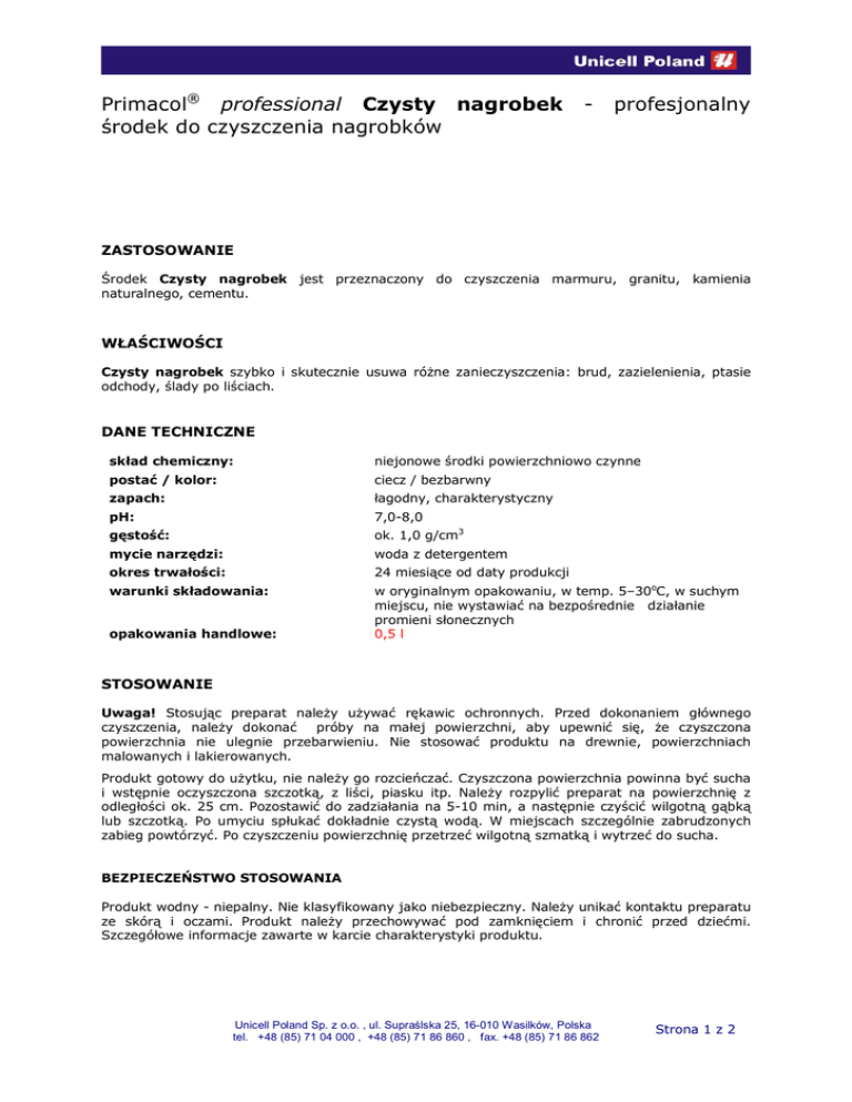 Primacol® professional Czysty nagrobek środek do czyszczenia nagrobków - profesjonalny ZASTOSOWANIE Środek Czysty nagrobek jest przeznaczony do czyszczenia marmuru, granitu, kamienia naturalnego, cementu. WŁAŚCIWOŚCI Czysty nagrobek szybko i skutecznie usuwa różne zanieczyszczenia: brud, zazielenienia, ptasie odchody, ślady po liściach. DANE TECHNICZNE skład chemiczny: niejonowe środki powierzchniowo czynne postać / kolor: ciecz / bezbarwny zapach: łagodny, charakterystyczny pH: 7,0-8,0 gęstość: ok. 1,0 g/cm3 mycie narzędzi: woda z detergentem okres trwałości: 24 miesiące od daty produkcji warunki składowania: w oryginalnym opakowaniu, w temp. 5–30oC, w suchym miejscu, nie wystawiać na bezpośrednie działanie promieni słonecznych 0,5 l opakowania handlowe: STOSOWANIE Uwaga! Stosując preparat należy używać rękawic ochronnych. Przed dokonaniem głównego czyszczenia, należy dokonać próby na małej powierzchni, aby upewnić się, że czyszczona powierzchnia nie ulegnie przebarwieniu. Nie stosować produktu na drewnie, powierzchniach malowanych i lakierowanych. Produkt gotowy do użytku, nie należy go rozcieńczać. Czyszczona powierzchnia powinna być sucha i wstępnie oczyszczona szczotką, z liści, piasku itp. Należy rozpylić preparat na powierzchnię z odległości ok. 25 cm. Pozostawić do zadziałania na 5-10 min, a następnie czyścić wilgotną gąbką lub szczotką. Po umyciu spłukać dokładnie czystą wodą. W miejscach szczególnie zabrudzonych zabieg powtórzyć. Po czyszczeniu powierzchnię przetrzeć wilgotną szmatką i wytrzeć do sucha. BEZPIECZEŃSTWO STOSOWANIA Produkt wodny - niepalny. Nie klasyfikowany jako niebezpieczny. Należy unikać kontaktu preparatu ze skórą i oczami. Produkt należy przechowywać pod zamknięciem i chronić przed dziećmi. Szczegółowe informacje zawarte w karcie charakterystyki produktu. Unicell Poland Sp. z o.o. , ul. Supraślska 25, 16-010 Wasilków, Polska tel. +48 (85) 71 04 000 , +48 (85) 71 86 860 , fax. +48 (85) 71 86 862 Strona 1 z 2 INFORMACJE PRAWNE Wszystkie informacje i dane zawarte tutaj są podane w dobrej wierze i w zgodzie z posiadaną przez nasze laboratoria wiedzą. Muszą jednak być przyjęte jako oznaczenia bez gwarancji, jeżeli produkt znajduje się poza naszą kontrolą. Informacja techniczna nie jest świadectwem jakości produktu ani też ofertą. Producent nie odpowiada za niewłaściwe użycie informacji zawartych na tej karcie, ani też za konsekwencje z tego wynikające. W przypadku wątpliwości zawsze należy przeprowadzić próbę. Producent zastrzega sobie prawo do zmiany powyższych danych bez powiadamiania klienta. Zapraszamy na www.primacol.pl. nasze strony internetowe: www.unicell.pl, www.dekorujemydom.pl, Wydanie Autor: Elżbieta Michałowska Data: 29. 04. 2011r. Unicell Poland Sp. z o.o. , ul. Supraślska 25, 16-010 Wasilków, Polska tel. +48 (85) 71 04 000 , +48 (85) 71 86 860 , fax. +48 (85) 71 86 862 Strona 2 z 2