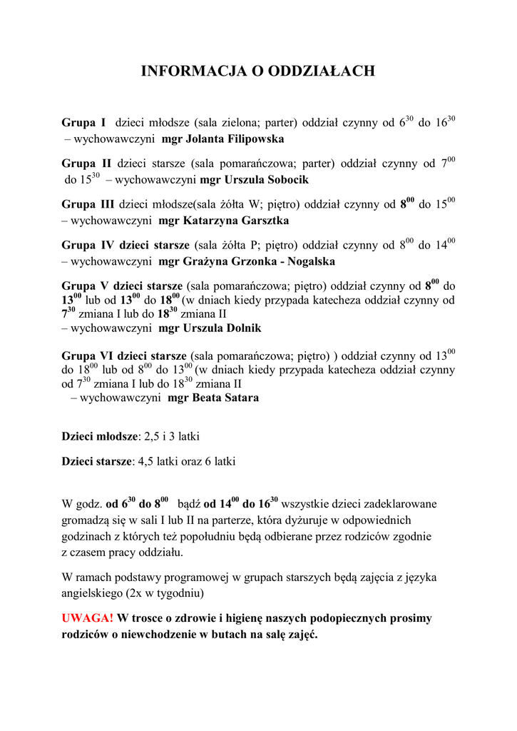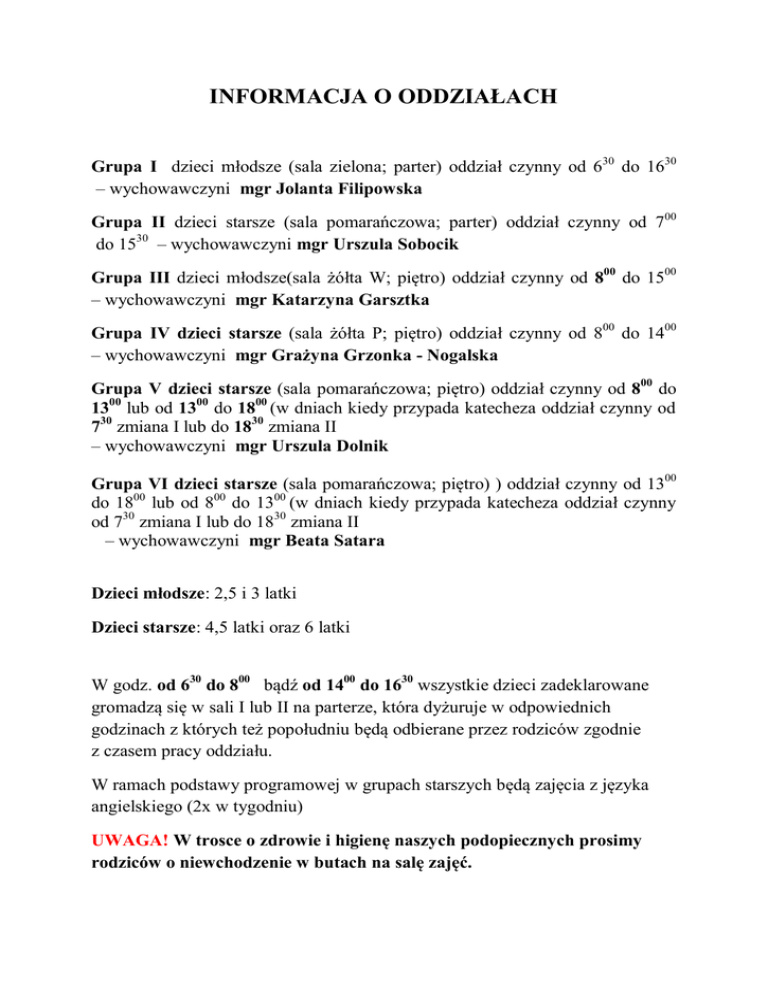 INFORMACJA O ODDZIAŁACH Grupa I dzieci młodsze (sala zielona; parter) oddział czynny od 630 do 1630 – wychowawczyni mgr Jolanta Filipowska Grupa II dzieci starsze (sala pomarańczowa; parter) oddział czynny od 700 do 1530 – wychowawczyni mgr Urszula Sobocik Grupa III dzieci młodsze(sala żółta W; piętro) oddział czynny od 800 do 1500 – wychowawczyni mgr Katarzyna Garsztka Grupa IV dzieci starsze (sala żółta P; piętro) oddział czynny od 800 do 1400 – wychowawczyni mgr Grażyna Grzonka - Nogalska Grupa V dzieci starsze (sala pomarańczowa; piętro) oddział czynny od 800 do 1300 lub od 1300 do 1800 (w dniach kiedy przypada katecheza oddział czynny od 730 zmiana I lub do 1830 zmiana II – wychowawczyni mgr Urszula Dolnik Grupa VI dzieci starsze (sala pomarańczowa; piętro) ) oddział czynny od 1300 do 1800 lub od 800 do 1300 (w dniach kiedy przypada katecheza oddział czynny od 730 zmiana I lub do 1830 zmiana II – wychowawczyni mgr Beata Satara Dzieci młodsze: 2,5 i 3 latki Dzieci starsze: 4,5 latki oraz 6 latki W godz. od 630 do 800 bądź od 1400 do 1630 wszystkie dzieci zadeklarowane gromadzą się w sali I lub II na parterze, która dyżuruje w odpowiednich godzinach z których też popołudniu będą odbierane przez rodziców zgodnie z czasem pracy oddziału. W ramach podstawy programowej w grupach starszych będą zajęcia z języka angielskiego (2x w tygodniu) UWAGA! W trosce o zdrowie i higienę naszych podopiecznych prosimy rodziców o niewchodzenie w butach na salę zajęć. Realizacja podstawy programowej w godz. od 800 do 1300 (dla II zmiany od 1300 do 1800). W dniach kiedy zaplanowana jest katecheza podstawa wydłuża się o pół godziny. Stawka za każdą rozpoczętą godzinę poza podstawą programową wynosi 1 zł. Rodzice zobowiązani są do opłacenia faktury za usługi zgodnie z czasem zadeklarowanym w umowie cywilno – prawnej z dołu do dnia 15 każdego miesiąca. (przykładowo za m-c wrzesień faktura płatna do 15 października br.). Faktury wydawane będą u Intendenta do dnia 5 każdego miesiąca. ŻYWIENIE Wydawanie posiłków dla dzieci przedszkolnych 830 – śniadanie 1200 - obiad (1330 dla grupy popołudniowej) 1400- podwieczorek (1600 dla grupy popołudniowej) Koszt posiłków: Śniadanie – 1 zł Obiad - 3 zł Podwieczorek - 1 zł WAŻNE! O nieobecności dziecka w przedszkolu Rodzic powinien poinformować placówkę najpóźniej do godz 800 (niezależnie od zmiany), w przeciwnym razie naliczone zostaną stosowne opłaty.
