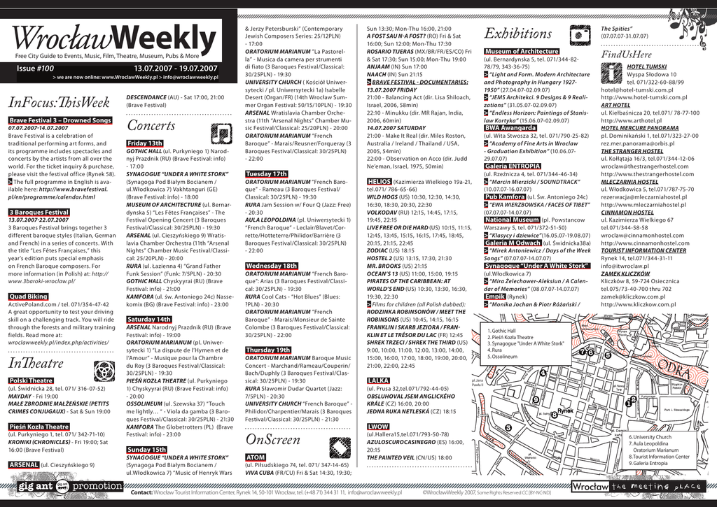 WrocławWeekly Free City Guide to Events, Music, Film, Theatre, Museum, Pubs & More Issue #100 13.07.2007 - 19.07.2007 > we are now online: www.WroclawWeekly.pl > [email protected] InFocus:ThisWeek Brave Festival 3 – Drowned Songs 07.07.2007-14.07.2007 Brave Festival is a celebration of traditional performing art forms, and its programme includes spectacles and concerts by the artists from all over the world. For the ticket inquiry & purchase, please visit the festival office (Rynek 58). > The full programme in English is available here: http://www.bravefestival. pl/en/programme/calendar.html 3 Baroques Festival 13.07.2007-22.07.2007 3 Baroques Festival brings together 3 different baroque styles (Italian, German and French) in a series of concerts. With the title “Les Fêtes Françaises,” this year’s edition puts special emphasis on French Baroque composers. For more information (in Polish) at: http:// www.3baroki-wroclaw.pl/ Quad Biking ActivePoland.com / tel. 071/354-47-42 A great opportunity to test your driving skill on a challenging track. You will ride through the forests and military training fields. Read more at: wroclawweekly.pl/index.php/activities/ InTheatre Polski Theatre (ul. Świdnicka 28, tel. 071/ 316-07-52) Mayday - Fri 19:00 Małe zbrodnie małżeńskie (Petits crimes conjugaux) - Sat & Sun 19:00 Pieśń Kozła Theatre (ul. Purkyniego 1, tel. 071/ 342-71-10) Kroniki (Chronicles) - Fri 19:00; Sat 16:00 (Brave Festival) ARSENAL (ul. Cieszyńskiego 9) Descendance (AU) - Sat 17:00, 21:00 (Brave Festival) Concerts Friday 13th GOTHIC HALL (ul. Purkyniego 1) Narodnyj Prazdnik (RU) (Brave Festival: info) - 17:00 SYNAGOGUE “UNDER A WHITE STORK” (Synagoga Pod Białym Bocianem / ul.Włodkowica 7) Vakhtanguri (GE) (Brave Festival: info) - 18:00 MUSEUM OF ARCHITECTURE (ul. Bernardynska 5) “Les Fêtes Françaises” - The Festival Opening Cencert (3 Baroques Festival/Classical: 30/25PLN) - 19:30 ARSENAL (ul. Cieszyńskiego 9) Wratislavia Chamber Orchestra (11th “Arsenal Nights” Chamber Music Festival/Classical: 25/20PLN) - 20:00 RURA (ul. Łazienna 4) “Grand Father Funk Session” (Funk: 7/5PLN) - 20:30 GOTHIC HALL Chyskyyrai (RU) (Brave Festival: info) - 21:00 KAMFORA (ul. św. Antoniego 24c) Nassekomix (BG) (Brave Festival: info) - 23:00 Saturday 14th ARSENAL Narodnyj Prazdnik (RU) (Brave Festival: info) - 19:00 ORATORIUM MARIANUM (pl. Uniwersytecki 1) “La dispute de l’Hymen et de l’Amour” - Musique pour la Chambre du Roy (3 Baroques Festival/Classical: 30/25PLN) - 19:30 Pieśń Kozła Theatre (ul. Purkyniego 1) Chyskyyrai (RU) (Brave Festival: info) - 20:00 OSSOLINEUM (ul. Szewska 37) “Touch me lightly… “ - Viola da gamba (3 Baroques Festival/Classical: 30/25PLN) - 21:30 KAMFORA The Globetrotters (PL) (Brave Festival: info) - 23:00 Sunday 15th SYNAGOGUE “UNDER A WHITE STORK” (Synagoga Pod Białym Bocianem / ul.Włodkowica 7) “Music of Henryk Wars & Jerzy Petersburski” (Contemporary Jewish Composers Series: 25/12PLN) - 17:00 ORATORIUM MARIANUM ”La Pastorella” - Musica da camera per strumenti di fiato (3 Baroques Festival/Classical: 30/25PLN) - 19:30 UNIVERSITY CHURCH ( Kościół Uniwersytecki / pl. Uniwersytecki 1a) Isabelle Desert (Organ/FR) (14th Wrocław Summer Organ Festival: 50/15/10PLN) - 19:30 ARSENAL Wratislavia Chamber Orchestra (11th “Arsenal Nights” Chamber Music Festival/Classical: 25/20PLN) - 20:00 ORATORIUM MARIANUM “French Baroque” - Marais/Reusner/Forqueray (3 Baroques Festival/Classical: 30/25PLN) - 22:00 Tuesday 17th ORATORIUM MARIANUM “French Baroque” - Rameau (3 Baroques Festival/ Classical: 30/25PLN) - 19:30 RURA Jam Session w/ Four Q (Jazz: Free) - 20:30 AULA LEOPOLDINA (pl. Uniwersytecki 1) “French Baroque” - Leclair/Blavet/Corrette/Hotteterre/Philidor/Barrière (3 Baroques Festival/Classical: 30/25PLN) - 22:00 Wednesday 18th ORATORIUM MARIANUM “French Baroque”: Arias (3 Baroques Festival/Classical: 30/25PLN) - 19:30 RURA Cool Cats - “Hot Blues” (Blues: ?PLN) - 20:30 ORATORIUM MARIANUM “French Baroque” - Marais/Monsieur de Sainte Colombe (3 Baroques Festival/Classical: 30/25PLN) - 22:00 Thursday 19th ORATORIUM MARIANUM Baroque Music Concert - Marchand/Rameau/Couperin/ Bach/Duphly (3 Baroques Festival/Classical: 30/25PLN) - 19:30 RURA Sławomir Dudar Quartet (Jazz: 7/5PLN) - 20:30 UNIVERSITY CHURCH “French Baroque” Philidor/Charpentier/Marais (3 Baroques Festival/Classical: 30/25PLN) - 21:30 OnScreen ATOM Exhibitions Sun 13:30; Mon-Thu 16:00, 21:00 A Fost sau n-a fost? (RO) Fri & Sat 16:00; Sun 12:00; Mon-Thu 17:30 Rosario Tijeras (MX/BR/FR/ES/CO) Fri & Sat 17:30; Sun 15:00; Mon-Thu 19:00 Anjaam (IN) Sun 17:00 Naach (IN) Sun 21:15 > Brave Festival - Documentaries: 13.07.2007 Friday 21:00 - Balancing Act (dir. Lisa Shiloach, Israel, 2006, 58min) 22:10 - Minukku (dir. MR Rajan, India, 2006, 60min) 14.07.2007 Saturday 21:00 - Make It Real (dir. Miles Roston, Australia / Ireland / Thailand / USA, 2005, 54min) 22:00 - Observation on Acco (dir. Judd Ne’eman, Israel, 1975, 50min) Museum of Architecture (ul. Bernardynska 5, tel. 071/344-8278/79, 343-36-75) > “Light and Form. Modern Architecture and Photography in Hungary 19271950” (27.04.07-02.09.07) > “JEMS Architekci. 9 Designs & 9 Realizations” (31.05.07-02.09.07) > “Endless Horizon: Paintings of Stanislaw Kortyka” (15.06.07-02.09.07) BWA Awangarda (ul. Wita Stwosza 32, tel. 071/790-25-82) > “Academy of Fine Arts in Wroclaw - Graduation Exhibition” (10.06.0729.07.07) Galeria ENTROPIA (ul. Rzeźnicza 4, tel. 071/344-46-34) > “Marcin Mierzicki / SOUNDTRACK” (10.07.07-16.07.07) Pub Kamfora (ul. Św. Antoniego 24c) > “Ewa Wierzbowska / Faces of Tibet” (07.07.07-14.07.07) National Museum (pl. Powstancow Warszawy 5, tel. 071/372-51-50) > “Klasycy i dziewice”(16.05.07-19.08.07) Galeria M Odwach (ul. Świdnicka38a) > “Mirek Antoniewicz / Days of the Week Songs” (07.07.07-14.07.07) HELIOS (Kazimierza Wielkiego 19