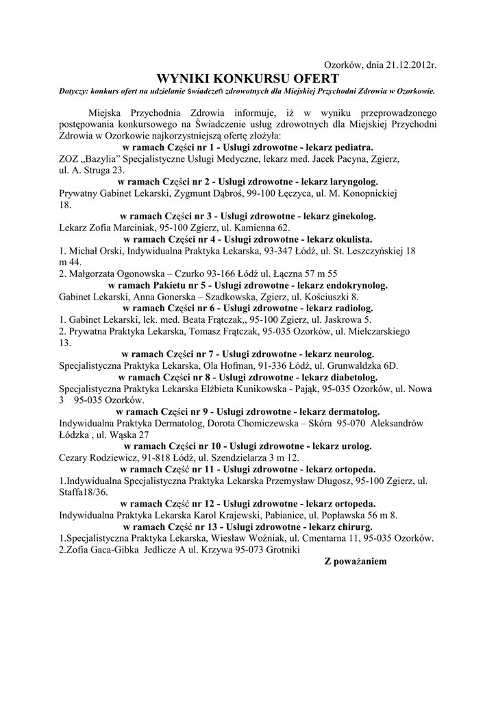 Ozorków, dnia 21.12.2012r. WYNIKI KONKURSU OFERT Dotyczy: konkurs ofert na udzielanie świadczeń zdrowotnych dla Miejskiej Przychodni Zdrowia w Ozorkowie. Miejska Przychodnia Zdrowia informuje, iŜ w wyniku przeprowadzonego postępowania konkursowego na Świadczenie usług zdrowotnych dla Miejskiej Przychodni Zdrowia w Ozorkowie najkorzystniejszą ofertę złoŜyła: w ramach Części nr 1 - Usługi zdrowotne - lekarz pediatra. ZOZ „Bazylia” Specjalistyczne Usługi Medyczne, lekarz med. Jacek Pacyna, Zgierz, ul. A. Struga 23. w ramach Części nr 2 - Usługi zdrowotne - lekarz laryngolog. Prywatny Gabinet Lekarski, Zygmunt Dąbroś, 99-100 Łęczyca, ul. M. Konopnickiej 18. w ramach Części nr 3 - Usługi zdrowotne - lekarz ginekolog. Lekarz Zofia Marciniak, 95-100 Zgierz, ul. Kamienna 62. w ramach Części nr 4 - Usługi zdrowotne - lekarz okulista. 1. Michał Orski, Indywidualna Praktyka Lekarska, 93-347 Łódź, ul. St. Leszczyńskiej 18 m 44. 2. Małgorzata Ogonowska – Czurko 93-166 Łódź ul. Łączna 57 m 55 w ramach Pakietu nr 5 - Usługi zdrowotne - lekarz endokrynolog. Gabinet Lekarski, Anna Gonerska – Szadkowska, Zgierz, ul. Kościuszki 8. w ramach Części nr 6 - Usługi zdrowotne - lekarz radiolog. 1. Gabinet Lekarski, lek. med. Beata Frątczak,, 95-100 Zgierz, ul. Jaskrowa 5. 2. Prywatna Praktyka Lekarska, Tomasz Frątczak, 95-035 Ozorków, ul. Mielczarskiego 13. w ramach Części nr 7 - Usługi zdrowotne - lekarz neurolog. Specjalistyczna Praktyka Lekarska, Ola Hofman, 91-336 Łódź, ul. Grunwaldzka 6D. w ramach Części nr 8 - Usługi zdrowotne - lekarz diabetolog. Specjalistyczna Praktyka Lekarska ElŜbieta Kunikowska - Pająk, 95-035 Ozorków, ul. Nowa 3 95-035 Ozorków. w ramach Części nr 9 - Usługi zdrowotne - lekarz dermatolog. Indywidualna Praktyka Dermatolog, Dorota Chomiczewska – Skóra 95-070 Aleksandrów Łódzka , ul. Wąska 27 w ramach Części nr 10 - Usługi zdrowotne - lekarz urolog. Cezary Rodziewicz, 91-818 Łódź, ul. Szendzielarza 3 m 12. w ramach Część nr 11 - Usługi zdrowotne - lekarz ortopeda. 1.Indywidualna Specjalistyczna Praktyka Lekarska Przemysław Długosz, 95-100 Zgierz, ul. Staffa18/36. w ramach Część nr 12 - Usługi zdrowotne - lekarz ortopeda. Indywidualna Praktyka Lekarska Karol Krajewski, Pabianice, ul. Popławska 56 m 8. w ramach Część nr 13 - Usługi zdrowotne - lekarz chirurg. 1.Specjalistyczna Praktyka Lekarska, Wiesław Woźniak, ul. Cmentarna 11, 95-035 Ozorków. 2.Zofia Gaca-Gibka Jedlicze A ul. Krzywa 95-073 Grotniki Z powaŜaniem