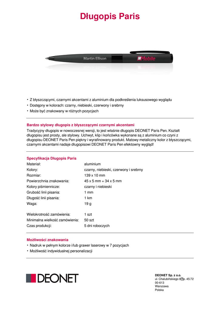 Długopis Paris . Z błyszczącymi, czarnymi akcentami z aluminium dla podkreślenia luksusowego wyglądu . Dostępny w kolorach: czarny, niebieski, czerwony i srebrny . Może być znakowany w różnych pozycjach Bardzo stylowy długopis z błyszczącymi czarnymi akcentami Tradycyjny długopis w nowoczesnej wersji, to jest właśnie długopis DEONET Paris Pen. Kształt długopisu jest prosty, ale stylowy. Uchwyt, klip i końcówka wykonane są z aluminium co czyni z długopisu DEONET Paris Pen piękny i wyrafinowany produkt. Matowy metaliczny kolor z błyszczącymi, czarnymi akcentami nadaje długopisowi DEONET Paris Pen efektowny wygląd! Specyfikacja Długopis Paris Materiał: aluminium Kolory: czarny, niebieski, czerwony i srebrny Rozmiar: 139 x 10 mm Powierzchnia znakowania: 45 x 5 mm + 34 x 5 mm Kolory piśmiennicze: czarny i niebieski Grubość linii pisania: 1 mm Długość linii pisania: 1 km Waga: 19 g Wielokrotność zamówienia: 1 szt Minimalna wielkość zamówienia: 50 szt Czas produkcji: 5 dni roboczych Możliwości znakowania . Nadruk w pełnym kolorze i/lub grawer laserowy w 7 pozycjach . Możliwość indywidualnej personalizacji DEONET Sp. z o.o. ul. Chalubiñskiego 8 p. 45:72 00-613 Warszawa Polska Opakowania Pudełko Frame Etui na długopis Pudełko Tube Pudełko na długopis DEONET Sp. z o.o. ul. Chalubiñskiego 8 p. 45:72 00-613 Warszawa Polska Powered by TCPDF (www.tcpdf.org)