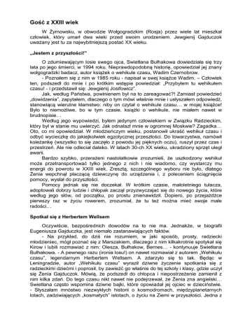 Gość z XXIII wiek W Żyrnowsku, w obwodzie Wołgogradzkim (Rosja) przez wiele lat mieszkał człowiek, który umarł dwa wieki przed swoim urodzeniem. Jewgienij Gajduczok uważany jest tu za najwybitniejszą postać XX wieku. „Jestem z przyszłości!” O zdumiewającym losie swego ojca, Swietłana Bułhakowa dowiedziała się trzy lata po jego śmierci, w 1994 roku. Nieprawdopodobną historię, opowiedział jej znany wołgogradzki badacz, autor książek o wehikule czasu, Wadim Czernobrow. - Poznałem się z nim w 1985 roku - napisał w swej książce Wadim. – Człowiek ten, podszedł do mnie i po krótkim wstępie powiedział: „Przybyłem tu wehikułem czasu! - i przedstawił się: Jewgienij Josifowicz”. Jak, według Państwa, powinienem był na to zareagować?! Zamiast powiedzieć „dowidzenia”, zapytałem, dlaczego o tym mówi właśnie mnie i usłyszałem odpowiedź, stanowiącą wierutne kłamstwo: niby on czytał o wehikule czasu… w mojej książce! Było to niemożliwe, bo w tym czasie, książki o wehikule, nie miałem nawet w brudnopisie… Według jego wypowiedzi, byłem jedynym człowiekiem w Związku Radzieckim, który był w stanie mu uwierzyć. Jak odnalazł mnie w ogromnej Moskwie? Zagadka… Oto, co mi opowiedział. W młodzieńczym wieku, postanowił ukraść wehikuł czasu i odbyć wycieczkę do jakiejkolwiek egzotycznej przeszłości. Do towarzystwa, namówił koleżankę (wszystko to się zaczęło z powodu jej pięknych oczu), ruszył przez czas i przestrzeń. Ale nie odleciał daleko. W latach 30-ch XX wieku, ukradziony sprzęt uległ awarii. Bardzo szybko, przerażeni nastolatkowie zrozumieli, że uszkodzony wehikuł może przetransportować tylko jednego z nich i nie wiadomo, czy wystarczy mu energii do powrotu w XXIII wiek. Zresztą, szczególnego wyboru nie było, dlatego Żenia wepchnął płaczącą dziewczynę do urządzenia i, z poleceniem ściągnięcia pomocy, wysłał do przyszłości. Pomocy jednak się nie doczekał. W krótkim czasie, małoletniego tułacza, adoptowali dobrzy ludzie i chłopak zaczął przyzwyczajać się do nowego życia, które według jego słów, od początku, po prostu znienawidził. Dopiero, po przejażdżce pierwszy raz w życiu rowerem, zrozumiał, że tu też można mieć swoje małe radości… Spotkał się z Herbertem Wellsem Oczywiście, bezpośrednich dowodów na to nie ma. Jednakże, w biografii Eugeniusza Gajduczka, jest niemało zastanawiających faktów. - Na przykład, do dziś nie rozumiem, w jaki sposób, prosty, radziecki młodzieniec, mógł poznać się z Marszakiem, dlaczego z nim kilkakrotnie spotykał się Kirow i lubili rozmawiać z nim: Olesza, Bułhakow, Bernes… - kontynuuje Swietłana Bułhakowa. - A pewnego razu (ironia losu!) on nawet rozmawiał z autorem „Wehikułu czasu”, legendarnym Herbertem Wellsem. A zdarzyło się to tak. Będąc w Leningradzie, autor „Wehikułu czasu” wyraził dziwne życzenie spotkania się z radzieckimi dziećmi i poprosił, by zawieźć go właśnie do tej szkoły i klasy, gdzie uczył się Żenia Gajduczok. Mówią, że podszedł do chłopca i niepostrzeżenie zamienił z nim kilka zdań. Do tego czasu nikt nawet nie podejrzewał, że Żenia zna angielski… Swietłana często wspomina dziwne bajki, które opowiadał jej ojciec w dzieciństwie. - Słyszałam mnóstwo niezwykłych historii o kosmodromach, międzyplanetarnych lotach, zadziwiających „kosmatych” istotach, o życiu na Ziemi w przyszłości. Jedna z bajek szczególnie utkwiła mi w pamięci - była to historia Urfina Dżusa i jego drewnianych żołnierzy, którą usłyszałam w wieku pięciu lat. Był to rok 1951. Jak wiadomo, dalszy ciąg „Czarodzieja szmaragdowego miasta” Aleksander Wołkow napisał w 1963 r... - Kilka lat po jego śmierci, było kilka zadziwiających zdarzeń - mówi Swietłana. Odnalazł się kolega z wojska, który opowiedział kilka epizodów, w których ojciec wystąpił w roli jasnowidza. Na przykład, kilka dni przed wybuchem wojny, zakomunikował szykującym się do demobilizacji kolegom z wojska, że „W niedzielę, wyparuje wam to z głowy”. A po kilku dniach, kiedy jeden z nich zaczął wypytywać Gajduczka o datę zwycięstwa (żołnierz uznał go, za kogoś w rodzaju proroka), wymienił i tą, najbardziej oczekiwaną liczbę. Po czym, momentalnie stracił reputację jasnowidza: wszyscy byli zbyt pewni naszego błyskawicznego zwycięstwa. Podobną przenikliwość zademonstrował w swoim czasie także i Wadimowi Czernobrowowi, „przepowiadając” prezydenturę Jelcyna, rozpad ZSSR, ormiańskoazerbejdżański konflikt, Gruzję, Czeczenię, Jugosławię… „Wstęga czasu” W czasie wojny, Eugeniusz Gajduczok, znalazł się najpierw w Stalingradzie, potem w Żyrnowsku, gdzie stworzył i kierował muzeum etnograficznym, którego unikalne eksponaty przyjeżdżali oglądać nawet zagraniczni goście. Właśnie, w latach 1970-80, w jednej z sal muzeum wisiała długaśna „Wstęga czasu” – wielometrowy, papierowy zwój z zapisem najważniejszych zdarzeń w światowej historii – od epoki kamiennej… do XX wieku włącznie! Według córki Eugeniusza, w muzeum nadal przechowywane są gazety z lat 70. Już wtedy, dziennikarze takich poważnych wydawnictw, jak: „Prawda”, „Komunista”, „Czerwona gwiazda”, bez skrępowania nazywali Eugeniusza Gajduczoka jasnowidzem. Na przykład, artykuł z opisem Żyrnowska XXI wieku, napisał w 1980 roku. Jego wierszy o telefonii komórkowej i Internecie, wtedy nawet zagorzali fantaści nie brali na serio… Zgodnie ze słowami bliskich i przyjaciół, Gajduczoka czasami coś „nachodziło” i wówczas opowiadał o tym, jak wygląda Ziemia z kosmosu, jak zmienia się postrzeganie astronauty, przemierzającego głębiny Wszechświata, jak adaptują się kosmici do naszych warunków i o mnóstwie innych „jak”. „Fantasta” - mówili jedni, „Dziwak” - zapewniali drudzy, „Niesamowity!” - za