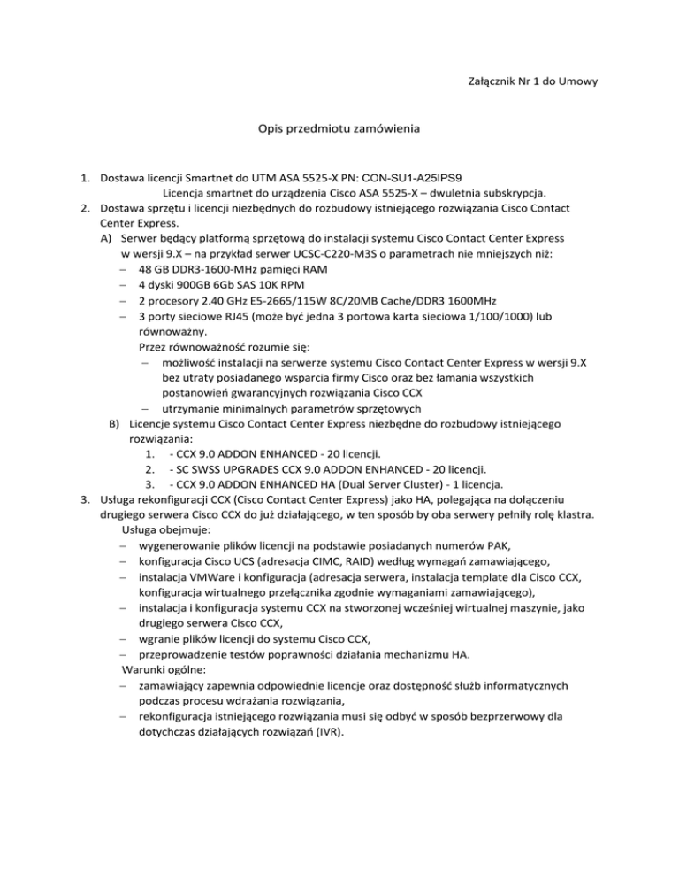 Załącznik Nr 1 do Umowy Opis przedmiotu zamówienia 1. Dostawa licencji Smartnet do UTM ASA 5525-X PN: CON-SU1-A25IPS9 Licencja smartnet do urządzenia Cisco ASA 5525-X – dwuletnia subskrypcja. 2. Dostawa sprzętu i licencji niezbędnych do rozbudowy istniejącego rozwiązania Cisco Contact Center Express. A) Serwer będący platformą sprzętową do instalacji systemu Cisco Contact Center Express w wersji 9.X – na przykład serwer UCSC-C220-M3S o parametrach nie mniejszych niż: 48 GB DDR3-1600-MHz pamięci RAM 4 dyski 900GB 6Gb SAS 10K RPM 2 procesory 2.40 GHz E5-2665/115W 8C/20MB Cache/DDR3 1600MHz 3 porty sieciowe RJ45 (może być jedna 3 portowa karta sieciowa 1/100/1000) lub równoważny. Przez równoważność rozumie się: możliwość instalacji na serwerze systemu Cisco Contact Center Express w wersji 9.X bez utraty posiadanego wsparcia firmy Cisco oraz bez łamania wszystkich postanowień gwarancyjnych rozwiązania Cisco CCX utrzymanie minimalnych parametrów sprzętowych B) Licencje systemu Cisco Contact Center Express niezbędne do rozbudowy istniejącego rozwiązania: 1. - CCX 9.0 ADDON ENHANCED - 20 licencji. 2. - SC SWSS UPGRADES CCX 9.0 ADDON ENHANCED - 20 licencji. 3. - CCX 9.0 ADDON ENHANCED HA (Dual Server Cluster) - 1 licencja. 3. Usługa rekonfiguracji CCX (Cisco Contact Center Express) jako HA, polegająca na dołączeniu drugiego serwera Cisco CCX do już działającego, w ten sposób by oba serwery pełniły rolę klastra. Usługa obejmuje: wygenerowanie plików licencji na podstawie posiadanych numerów PAK, konfiguracja Cisco UCS (adresacja CIMC, RAID) według wymagań zamawiającego, instalacja VMWare i konfiguracja (adresacja serwera, instalacja template dla Cisco CCX, konfiguracja wirtualnego przełącznika zgodnie wymaganiami zamawiającego), instalacja i konfiguracja systemu CCX na stworzonej wcześniej wirtualnej maszynie, jako drugiego serwera Cisco CCX, wgranie plików licencji do systemu Cisco CCX, przeprowadzenie testów poprawności działania mechanizmu HA. Warunki ogólne: zamawiający zapewnia odpowiednie licencje oraz dostępność służb informatycznych podczas procesu wdrażania rozwiązania, rekonfiguracja istniejącego rozwiązania musi się odbyć w sposób bezprzerwowy dla dotychczas działających rozwiązań (IVR).