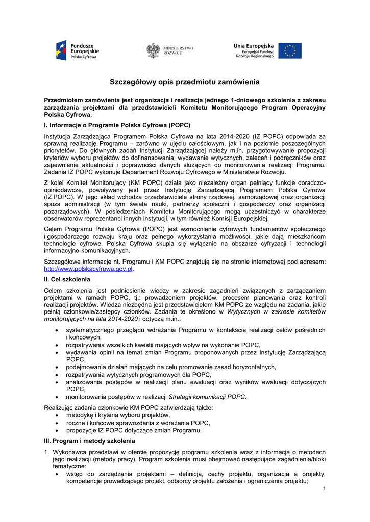Szczegółowy opis przedmiotu zamówienia Przedmiotem zamówienia jest organizacja i realizacja jednego 1-dniowego szkolenia z zakresu zarządzania projektami dla przedstawicieli Komitetu Monitorującego Program Operacyjny Polska Cyfrowa. I. Informacje o Programie Polska Cyfrowa (POPC) Instytucja Zarządzająca Programem Polska Cyfrowa na lata 2014-2020 (IZ POPC) odpowiada za sprawną realizację Programu – zarówno w ujęciu całościowym, jak i na poziomie poszczególnych priorytetów. Do głównych zadań Instytucji Zarządzającej należy m.in. przygotowywanie propozycji kryteriów wyboru projektów do dofinansowania, wydawanie wytycznych, zaleceń i podręczników oraz zapewnienie aktualności i poprawności danych służących do monitorowania realizacji Programu. Zadania IZ POPC wykonuje Departament Rozwoju Cyfrowego w Ministerstwie Rozwoju. Z kolei Komitet Monitorujący (KM POPC) działa jako niezależny organ pełniący funkcje doradczoopiniodawcze, powoływany jest przez Instytucję Zarządzającą Programem Polska Cyfrowa (IZ POPC). W jego skład wchodzą przedstawiciele strony rządowej, samorządowej oraz organizacji spoza administracji (w tym świata nauki, partnerzy społeczni i gospodarczy oraz organizacji pozarządowych). W posiedzeniach Komitetu Monitorującego mogą uczestniczyć w charakterze obserwatorów reprezentanci innych instytucji, w tym również Komisji Europejskiej. Celem Programu Polska Cyfrowa (POPC) jest wzmocnienie cyfrowych fundamentów społecznego i gospodarczego rozwoju kraju oraz pełnego wykorzystania możliwości, jakie dają mieszkańcom technologie cyfrowe. Polska Cyfrowa skupia się wyłącznie na obszarze cyfryzacji i technologii informacyjno-komunikacyjnych. Szczegółowe informacje nt. Programu i KM POPC znajdują się na stronie internetowej pod adresem: http://www.polskacyfrowa.gov.pl. II. Cel szkolenia Celem szkolenia jest podniesienie wiedzy w zakresie zagadnień związanych z zarządzaniem projektami w ramach POPC, tj.: prowadzeniem projektów, procesem planowania oraz kontroli realizacji projektów. Wiedza niezbędna jest przedstawicielom KM POPC ze względu na zadania, jakie pełnią członkowie/zastępcy członków. Zadania te określono w Wytycznych w zakresie komitetów monitorujących na lata 2014-2020 i dotyczą m.in.: systematycznego przeglądu wdrażania Programu w kontekście realizacji celów pośrednich i końcowych, rozpatrywania wszelkich kwestii mających wpływ na wykonanie POPC, wydawania opinii na temat zmian Programu proponowanych przez Instytucję Zarządzającą POPC, podejmowania działań mających na celu promowanie zasad horyzontalnych, rozpatrywania wytycznych programowych dla POPC, analizowania postępów w realizacji planu ewaluacji oraz wyników ewaluacji dotyczących POPC, monitorowania postępów w realizacji Strategii komunikacji POPC. Realizując zadania członkowie KM POPC zatwierdzają także: metodykę i kryteria wyboru projektów, roczne i końcowe sprawozdania z wdrażania POPC, propozycje IZ POPC dotyczące zmian Programu. III. Program i metody szkolenia 1. Wykonawca przedstawi w ofercie propozycję programu szkolenia wraz z informacją o metodach jego realizacji (metody pracy). Program szkolenia musi obejmować następujące zagadnienia/bloki tematyczne: wstęp do zarządzania projektami – definicja, cechy projektu, organizacja a projekty, kompetencje prowadzącego projekt, odbiorcy projektu założenia i ograniczenia projektu; 1 procesy zarządzania projektami – grupa procesów rozpoczęcia i realizacji projektu; obszar wiedzy o zarządzaniu projektami – integracja projektu, zakres, czas, koszty w projekcie, jakość w projekcie; planowanie projektu – zakres, budżet, bilansowanie zasobów, definiowanie produktów projektu; monitorowanie i realizacja projektu – jak osiągnąć zaplanowane rezultaty, zarządzanie zmianami, monitoring realizacji projektu, ocena i monitorowanie wykonania zakresu projektu, zarządzanie zagadnieniami i zmianami w projekcie; zarządzanie ryzykiem – definicja ryzyk i implikacje dla projektu, identyfikacja ryzyka oraz strategie zarządzania ryzykiem, wycena ryzyk; rozliczanie i zamykanie projektu – weryfikacja zakresu i akceptacja, zamknięcie administracyjne, przekazanie wyciągniętych wniosków do przyszłych projektów, rozliczanie projektu i przedstawienie osiągniętych rezultatów. 2. Zakres szkolenia powinien odnosić się do przykładów projektów realizowanych w ramach POPC, tj. dotyczących dostępu do szybkiego internetu, e-usług publicznych oraz cyfrowych kompetencji społeczeństwa. 3. Szkolenie musi łączyć elementy warsztatowe z wykorzystaniem praktycznych ćwiczeń, pozwalających na utrwalenie wiedzy zdobytej podczas zajęć. IV. Trener Wykonawca przedstawi CV trenera, w tym jego wykształcenie oraz doświadczenie zawodowe (zgodnie z pkt. X. 2 SOPZ). V. Uczestnicy szkolenia 1. Grupa maksymalnie 50 osób (członkowie i zastępcy Komitetu Monitorującego Program Polska Cyfrowa). Uczestnicy o zróżnicowanym poziomie wiedzy i doświadczeniu. 2. Zamawiający może zmniejszyć liczbę uczestników szkolenia, informując o tym Wykonawcę najpóźniej na 2 dni robocze przed rozpoczęciem szkolenia. Zgłoszenie zmniejszenia liczby uczestników szkolenia dokonane po ww. terminie nie zostanie uwzględnione przy ustalaniu rzeczywistej liczby uczestników szkolenia. Zamawiający zastrzega sobie prawo do odwołania szkolenia w przypadku zbyt małej liczby uczestników (mniej niż 15 osób). VI. Organizacja szkolenia 1. Szkolenie zostanie zorganizowane w jednym z terminów: 24, 29, 31 marca lub 7 kwietnia 2016 r. 2. Szczegółowy termin szkolenia zostanie ustalony z Zamawiającym po podpisaniu Umowy. 3. Miejsce – sala szkoleniowa zapewniona przez Zamawiającego: Sala szkoleniowa wraz z niezbędną infrastrukturą na terenie Ministerstwa Rozwoju. 4. Godziny szkolenia: 8:30-16:00. Jedna godzina szkoleniowa wynosi 60 min. Przy tworzeniu agendy nale