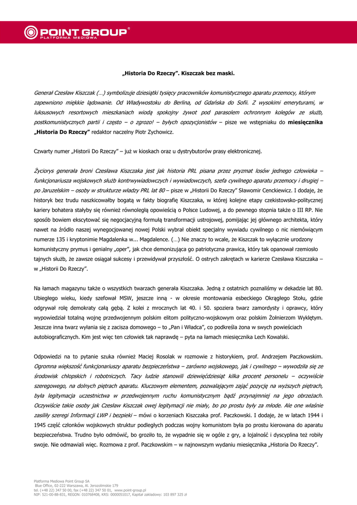 „Historia Do Rzeczy”. Kiszczak bez maski. Generał Czesław Kiszczak (…) symbolizuje dziesiątki tysięcy pracowników komunistycznego aparatu przemocy, którym zapewniono miękkie lądowanie. Od Władywostoku do Berlina, od Gdańska do Sofii. Z wysokimi emeryturami, w luksusowych resortowych mieszkaniach wiodą spokojny żywot pod parasolem ochronnym kolegów ze służb, postkomunistycznych partii i często – o zgrozo! – byłych opozycjonistów – pisze we wstępniaku do miesięcznika „Historia Do Rzeczy” redaktor naczelny Piotr Zychowicz. Czwarty numer „Historii Do Rzeczy” – już w kioskach oraz u dystrybutorów prasy elektronicznej. Życiorys generała broni Czesława Kiszczaka jest jak historia PRL pisana przez pryzmat losów jednego człowieka – funkcjonariusza wojskowych służb kontrwywiadowczych i wywiadowczych, szefa cywilnego aparatu przemocy i drugiej – po Jaruzelskim – osoby w strukturze władzy PRL lat 80 – pisze w „Historii Do Rzeczy” Sławomir Cenckiewicz. I dodaje, że historyk bez trudu naszkicowałby bogatą w fakty biografię Kiszczaka, w której kolejne etapy czekistowsko-politycznej kariery bohatera stałyby się również równoległą opowieścią o Polsce Ludowej, a do pewnego stopnia także o III RP. Nie sposób bowiem ekscytować się negocjacyjną formułą transformacji ustrojowej, pomijając jej głównego architekta, który nawet na źródło naszej wynegocjowanej nowej Polski wybrał obiekt specjalny wywiadu cywilnego o nic niemówiącym numerze 135 i kryptonimie Magdalenka w... Magdalence. (…) Nie znaczy to wcale, że Kiszczak to wyłącznie urodzony komunistyczny prymus i genialny „oper”, jak chce demonizująca go patriotyczna prawica, który tak opanował rzemiosło tajnych służb, że zawsze osiągał sukcesy i przewidywał przyszłość. O ostrych zakrętach w karierze Czesława Kiszczaka – w „Historii Do Rzeczy”. Na łamach magazynu także o wszystkich twarzach generała Kiszczaka. Jedną z ostatnich poznaliśmy w dekadzie lat 80. Ubiegłego wieku, kiedy szefował MSW, jeszcze inną - w okresie montowania esbeckiego Okrągłego Stołu, gdzie odgrywał rolę demokraty całą gębą. Z kolei z mrocznych lat 40. i 50. spoziera twarz zamordysty i oprawcy, który wypowiedział totalną wojnę przedwojennym polskim elitom polityczno-wojskowym oraz polskim Żołnierzom Wyklętym. Jeszcze inna twarz wyłania się z zacisza domowego – to „Pan i Władca”, co podkreśla żona w swych powieściach autobiograficznych. Kim jest więc ten człowiek tak naprawdę – pyta na łamach miesięcznika Lech Kowalski. Odpowiedzi na to pytanie szuka również Maciej Rosolak w rozmowie z historykiem, prof. Andrzejem Paczkowskim. Ogromna większość funkcjonariuszy aparatu bezpieczeństwa – zarówno wojskowego, jak i cywilnego – wywodziła się ze środowisk chłopskich i robotniczych. Tacy ludzie stanowili dziewięćdziesiąt kilka procent personelu – oczywiście szeregowego, na dolnych piętrach aparatu. Kluczowym elementem, pozwalającym zająć pozycję na wyższych piętrach, była legitymacja uczestnictwa w przedwojennym ruchu komunistycznym bądź przynajmniej na jego obrzeżach. Oczywiście takie osoby jak Czesław Kiszczak owej legitymacji nie miały, bo po prostu były za młode. Ale one właśnie zasiliły szeregi Informacji LWP i bezpieki – mówi o korzeniach Kiszczaka prof. Paczkowski. I dodaje, że w latach 1944 i 1945 część członków wojskowych struktur podległych podczas wojny komunistom była po prostu kierowana do aparatu bezpieczeństwa. Trudno było odmówić, bo groziło to, że wypadnie się w ogóle z gry, a lojalność i dyscyplina też robiły swoje. Nie odmawiali więc. Rozmowa z prof. Paczkowskim – w najnowszym wydaniu miesięcznika „Historia Do Rzeczy”. Platforma Mediowa Point Group SA Blue Office, 02-222 Warszawa, Al. Jerozolimskie 179 tel. (+48 22) 347 50 00, fax (+48 22) 347 50 01, www.point-group.pl NIP: 521-00-88-831, REGON: 010768408, KRS: 0000051017, Kapitał zakładowy: 103 897 325 zł W magazynie również o procesie ws. pacyfikacji kopalni Wujek. Po 28 latach i czterech procesach, w których sądy to uniewinniały, to uniewinnienia uchylały, zapadł wreszcie prawomocny wyrok – po kilka lat pozbawienia wolności dla członków plutonu specjalnego ZOMO. Jednak odrębny proces gen. Kiszczaka nadal nie został zakończony. Katowicka prokuratura oskarża go o umyślne sprowadzenie „powszechnego niebezpieczeństwa dla życia i zdrowia ludzi”. To on wysłał 13 grudnia 1981 r. do jednostek milicji szyfrogram zezwalający na użycie broni ostrej. W czerwcu 2012 r. proces generała został wstrzymany ze względu na zły stan zdrowia oskarżonego. Tabloidy wkrótce odkryły, że chory właśnie remontuje swój domek letniskowy. Czy dosięgnie go sprawiedliwość? W „Historii Do Rzeczy” również wywiad z Władimirem Bukowskim. Były radziecki dysydent twierdzi, że rewolucje, do których doszło w 1989 r. w Europie Wschodniej, zostały zorganizowane przez KGB. Miał to być element wielkiej operacji sowieckiego politbiura, która wymknęła się spod kontroli. Dlatego m.in. zginął dyktator Rumunii, Nicolae Ceauşescu. Według Bukowskiego, Ceauşescu za dużo wiedział i nie wykonywał rozkazów. Wszyscy inni przywódcy demoludów posłusznie ustąpili, gdy dostali takie dyrektywy z Kremla. Tak zrobił Jaruzelski, tak zrobił nawet Honecker. A Ceauşescu nie zamierzał się podporządkować Moskwie. Nie chciał być kozłem ofiarnym. Został więc rozstrzelany. Jego proces został zaaranżowany przez KGB – mówi Bukowski. A na pytanie, co w Polsce zrobić z generałem Kiszczakiem i jego kolegami odpowiada zdecydowanie: Powinniście ich wsadzić za kraty. Totalitarne zbrodnie się bowiem nie przedawniają. Na łamach magazynu „Historia Do Rzeczy” także o historii nieco dawniejszej. Żaden europejski kraj nie został pokarany takim zwyrodnialcem jak car Iwan IV 