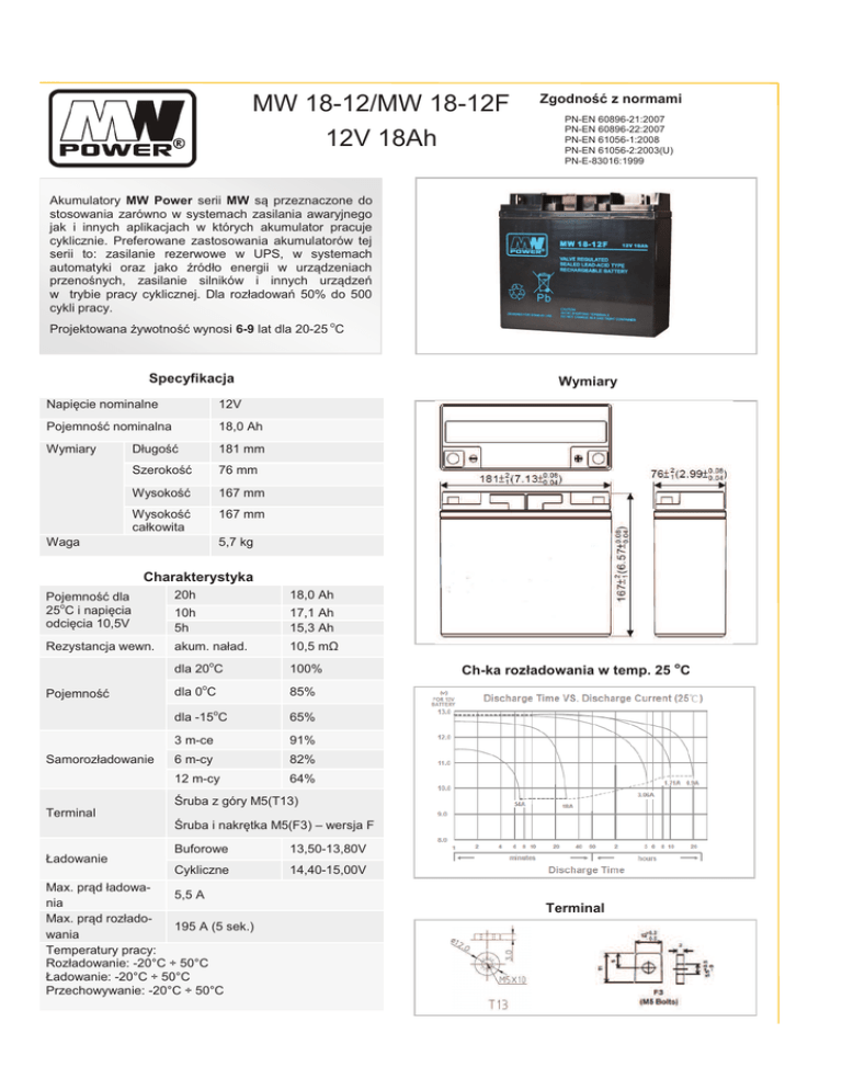 MW 18-12/MW 18-12F 12V 18Ah Zgodność z normami PN-EN 60896-21:2007 PN-EN 60896-22:2007 PN-EN 61056-1:2008 PN-EN 61056-2:2003(U) PN-E-83016:1999 Akumulatory MW Power serii MW są przeznaczone do stosowania zarówno w systemach zasilania awaryjnego jak i innych aplikacjach w których akumulator pracuje cyklicznie. Preferowane zastosowania akumulatorów tej serii to: zasilanie rezerwowe w UPS, w systemach automatyki oraz jako źródło energii w urządzeniach przenośnych, zasilanie silników i innych urządzeń w trybie pracy cyklicznej. Dla rozładowań 50% do 500 cykli pracy. Projektowana żywotność wynosi 6-9 lat dla 20-25 oC Specyfikacja Napięcie nominalne 12V Pojemność nominalna 18,0 Ah Wymiary Długość 181 mm Szerokość 76 mm Wysokość 167 mm Wysokość całkowita 167 mm Waga Wymiary 5,7 kg Charakterystyka Pojemność dla 25oC i napięcia odcięcia 10,5V 20h 18,0 Ah 10h 5h 17,1 Ah 15,3 Ah Rezystancja wewn. akum. naład. o Pojemność Samorozładowanie Terminal Ładowanie 10,5 mΩ dla 20 C 100% dla 0oC 85% dla -15oC 65% 3 m-ce 91% 6 m-cy 82% 12 m-cy 64% Ch-ka rozładowania w temp. 25 oC Śruba z góry M5(T13) Śruba i nakrętka M5(F3) – wersja F Buforowe 13,50-13,80V Cykliczne 14,40-15,00V Max. prąd ładowa5,5 A nia Max. prąd rozłado195 A (5 sek.) wania Temperatury pracy: Rozładowanie: -20°C ÷ 50°C Ładowanie: -20°C ÷ 50°C Przechowywanie: -20°C ÷ 50°C Terminal