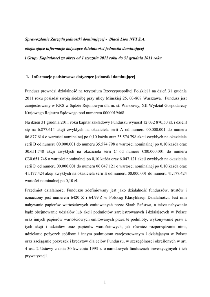 Sprawozdanie Zarządu jednostki dominującej - Black Lion NFI S.A. obejmujące informacje dotyczące działalności jednostki dominującej i Grupy Kapitałowej za okres od 1 stycznia 2011 roku do 31 grudnia 2011 roku 1. Informacje podstawowe dotyczące jednostki dominującej Fundusz prowadzi działalność na terytorium Rzeczypospolitej Polskiej i na dzień 31 grudnia 2011 roku posiadał swoją siedzibę przy ulicy Mińskiej 25, 03-808 Warszawa. Fundusz jest zarejestrowany w KRS w Sądzie Rejonowym dla m. st. Warszawy, XII Wydział Gospodarczy Krajowego Rejestru Sądowego pod numerem 0000019468. Na dzień 31 grudnia 2011 roku kapitał zakładowy Funduszu wynosił 12 032 870,50 zł. i dzielił się na 6.877.614 akcji zwykłych na okaziciela serii A od numeru 00.000.001 do numeru 06.877.614 o wartości nominalnej po 0,10 każda oraz 35.574.798 akcji zwykłych na okaziciela serii B od numeru 00.000.001 do numeru 35.574.798 o wartości nominalnej po 0,10 każda oraz 30.651.748 akcji zwykłych na okaziciela serii C od numeru C00.000.001 do numeru C30.651.748 o wartości nominalnej po 0,10 każda oraz 6.047.121 akcji zwykłych na okaziciela serii D od numeru 00.000.001 do numeru 06 047 121 o wartości nominalnej po 0,10 każda oraz 41.177.424 akcji zwykłych na okaziciela serii E od numeru 00.000.001 do numeru 41.177.424 wartości nominalnej po 0,10 zł. Przedmiot działalności Funduszu zdefiniowany jest jako działalność funduszów, trustów i oznaczony jest numerem 6420 Z i 64.99.Z w Polskiej Klasyfikacji Działalności. Jest nim nabywanie papierów wartościowych emitowanych przez Skarb Państwa, a także nabywanie bądź obejmowanie udziałów lub akcji podmiotów zarejestrowanych i działających w Polsce oraz innych papierów wartościowych emitowanych przez te podmioty, wykonywanie praw z tych akcji i udziałów oraz papierów wartościowych, jak również rozporządzanie nimi, udzielanie pożyczek spółkom i innym podmiotom zarejestrowanym i działającym w Polsce oraz zaciąganie pożyczek i kredytów dla celów Funduszu, w szczególności określonych w art. 4 ust. 2 Ustawy z dnia 30 kwietnia 1993 r. o narodowych funduszach inwestycyjnych i ich prywatyzacji. 1 W okresie sprawozdawczym księgowość Funduszu prowadzona była przez spółkę Kalder A Spółka z ograniczoną odpowiedzialnością. W sierpniu 2011 r. Rada Nadzorcza Funduszu podjęła decyzję o wyborze spółki pod firmą WBS Rachunkowość Consulting Spółka z ograniczoną odpowiedzialnością z siedzibą w Warszawie jako podmiotu uprawnionego do przeprowadzenia: - przeglądu jednostkowego sprawozdania finansowego Funduszu za pierwsze półrocze 2011 r. - przeglądu skonsolidowanego sprawozdania finansowego Grupy Kapitałowej Funduszu za pierwsze półrocze 2011 r. - badania jednostkowego sprawozdania rocznego za rok 2011; - badania skonsolidowanego sprawozdania finansowego Grupy Kapitałowej Funduszu za rok 2011. Wybór podmiotu uprawnionego do badania sprawozdań finansowych został dokonany zgodnie ze statutem Funduszu, obowiązującymi przepisami i normami zawodowymi. 2. Akcjonariusze jednostki dominującej Wykaz akcjonariuszy Black Lion NFI S.A. posiadających bezpośrednio lub pośrednio poprzez podmioty zależne co najmniej 5% ogólnej liczby głosów na Walnym Zgromadzeniu Black Lion NFI S.A. na dzień 31 grudnia 2011 roku oraz na dzień sporządzenia sprawozdania przedstawiał się następująco: Akcjonariusz Novakonstelacja Limited Superkonstelacja Limited Pioneer Fundusz Inwestycyjny Otwarty Akcje własne* Pozostali akcjonariusze RAZEM Liczba akcji 24 306 847 17 058 677 9 080 000 20 895 055 48 988 126 120 328 705 Liczba głosów 24 306 847 17 058 677 9 080 000 0 48 988 126 99 433 650 Udział % Udział % ogólnej liczby ogólnej liczby głosów (bez akcji akcji własnych) 24,45% 20,20% 17,16% 14,18% 9,13% 7,55% 0,00% 17,36% 49,27% 40,71% 100,00% 100,00% * Emitent nie wykonuje prawa głosu z akcji własnych Stan posiadania akcji Funduszu przez osoby zarządzające i nadzorujące na dzień 31 grudnia 2011 roku, stosownie do informacji przekazanych do publicznej wiadomości w trybie art. 160 ust. 4 ustawy o obrocie instrumentami finansowym. 2 Zgodnie z informacjami posiadanymi przez Fundusz osoby nadzorujące Fundusz posiadały akcje Funduszu: Pan Maciej Wandzel przez spółkę zależną Novakonstelacja Ltd 24 306 847 (wartość nominalna 2 430 684,7 zł). Pan Maciej Zientara przez spółkę zależną Superkonstelacja Ltd 17 058 677 (wartość nominalna 1 705 867,7 zł). Pan Piotr Janczewski pośrednio posiadał 18.845 akcji (wartość nominalna 1 884,5 zł). Zgodnie z informacjami posiadanymi przez Fundusz na dzień 31 grudnia 2011 roku następujące osoby zarządzające posiadały akcje Funduszu: Pan Rafał Bauer posiadał 3 136 537 akcji (wartość nominalna 313 653,70 zł). Zmiany w akcjonariacie po dacie bilansu, o których Fundusz posiada informacje: W stosunku do struktury akcjonariatu na dzień 31 grudnia 2011 roku nie nastąpiły zmiany w akcjonariacie Funduszu do daty publikacji poniższego sprawozdania. 3. Rada Nadzorcza i Zarząd Zarząd Funduszu na dzień 31 grudnia 2011 roku działał w składzie: Rafał Bauer – Mariusz Omieciński – Prezes Zarządu Członek Zarządu W dniu 9 sierpnia 2011 r. Rada Nadzorcza powołała Zarząd Funduszu następnej kadencji w osobach: Pan Rafał Bauer – Prezes Zarządu oraz Pan Mariusz Omieciński – Członek Zarządu. Zgromadzenie odwołało z funkcji w Zarządzie Funduszu Panią Monikę Hałupczak. Kadencja Zarządu w nowym składzie rozpoczęła się z dniem 30 sierpnia 2011 r. Koszty wynagrodzenia Zarządu Funduszu w okresie od 1 stycznia 2011 roku do 31 grudnia 2011 roku wyniosły 440 000 zł. 3 Imię i nazwisko Rafał Bauer Monika Hałupczak Mariusz Omieciński Okres pełnienia funkcji w 2011 roku Od Do 01.01.2011 31.12.2011 01.01.2011 29.08.2011 30.08.2011 31.12.2011 Funkcja Prezes Zarządu Członek Zarządu Członek Zarządu Kwota 240 000 200 000 0 4