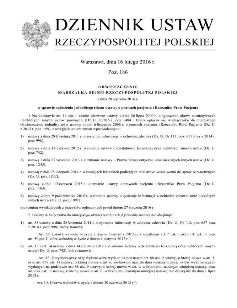 DZIENNIK USTAW RZECZYPOSPOLITEJ POLSKIEJ Warszawa, dnia 16 lutego 2016 r. Poz. 186 O B W IE S ZC ZE N I E M ARS ZA ŁK A S EJ M U R ZE C ZY P O S PO LI T EJ PO L SK I EJ z dnia 28 stycznia 2016 r. w sprawie ogłoszenia jednolitego tekstu ustawy o prawach pacjenta i Rzeczniku Praw Pacjenta 1. Na podstawie art. 16 ust. 1 zdanie pierwsze ustawy z dnia 20 lipca 2000 r. o ogłaszaniu aktów normatywnych i niektórych innych aktów prawnych (Dz. U. z 2015 r. poz. 1484 i 1890) ogłasza się w załączniku do niniejszego obwieszczenia jednolity tekst ustawy z dnia 6 listopada 2008 r. o prawach pacjenta i Rzeczniku Praw Pacjenta (Dz. U. z 2012 r. poz. 159), z uwzględnieniem zmian wprowadzonych: 1) ustawą z dnia 28 kwietnia 2011 r. o systemie informacji w ochronie zdrowia (Dz. U. Nr 113, poz. 657 oraz z 2014 r. poz. 998), 2) ustawą z dnia 14 czerwca 2012 r. o zmianie ustawy o działalności leczniczej oraz niektórych innych ustaw (Dz. U. poz. 742), 3) ustawą z dnia 27 września 2013 r. o zmianie ustawy – Prawo farmaceutyczne oraz niektórych innych ustaw (Dz. U. poz. 1245), 4) ustawą z dnia 28 listopada 2014 r. o komisjach lekarskich podległych ministrowi właściwemu do spraw wewnętrznych (Dz. U. poz. 1822), 5) ustawą z dnia 12 czerwca 2015 r. o zmianie ustawy o prawach pacjenta i Rzeczniku Praw Pacjenta (Dz. U. poz. 1163), 6) ustawą z dnia 9 października 2015 r. o zmianie ustawy o systemie informacji w ochronie zdrowia oraz niektórych innych ustaw (Dz. U. poz. 1991) oraz zmian wynikających z przepisów ogłoszonych przed dniem 27 stycznia 2016 r. 2. Podany w załączniku do niniejszego obwieszczenia tekst jednolity ustawy nie obejmuje: 1) art. 58 ustawy z dnia 28 kwietnia 2011 r. o systemie informacji w ochronie zdrowia (Dz. U. Nr 113, poz. 657 oraz z 2014 r. poz. 998), który stanowi: „Art. 58. Ustawa wchodzi w życie z dniem 1 stycznia 2012 r., z wyjątkiem art. 7 ust. 1 pkt 3 i 4, art. 11 oraz art. 50 pkt 1, które wchodzą w życie z dniem 1 sierpnia 2017 r.”; 2) art. 13 i art. 14 ustawy z dnia 14 czerwca 2012 r. o zmianie ustawy o działalności leczniczej oraz niektórych innych ustaw (Dz. U. poz. 742), które stanowią: „Art. 13. Dotychczasowe akty wykonawcze wydane na podstawie art. 88 ust. 9 ustawy, o której mowa w art. 1, oraz art. 67k ust. 11 ustawy, o której mowa w art. 6, zachowują moc do dnia wejścia w życie aktów wykonawczych wydanych na podstawie art. 88 ust. 9 ustawy, o której mowa w art. 1, w brzmieniu nadanym niniejszą ustawą, oraz art. 67k ust. 11 ustawy, o której mowa w art. 6, w brzmieniu nadanym niniejszą ustawą, nie dłużej niż do dnia 1 lipca 2013 r. Art. 14. Ustawa wchodzi w życie z dniem 30 czerwca 2012 r.”; Dziennik Ustaw 3) –2– Poz. 186 odnośnika nr 1 oraz art. 17 ustawy z dnia 27 września 2013 r. o zmianie ustawy – Prawo farmaceutyczne oraz niektórych innych ustaw (Dz. U. poz. 1245), które stanowią: „1) Niniejsza ustawa w zakresie swojej regulacji wdraża: 1) dyrektywę Parlamentu Europejskiego i Rady 2010/84/UE z dnia 15 grudnia 2010 r. zmieniającą – w zakresie nadzoru nad bezpieczeństwem farmakoterapii – dyrektywę 2001/83/WE w sprawie wspólnotowego kodeksu odnoszącego się do produktów leczniczych stosowanych u ludzi (Dz. Urz. UE L 348 z 31.12.2010, str. 74); 2) częściowo dyrektywę 2001/83/WE Parlamentu Europejskiego i Rady z dnia 6 listopada 2001 r. w sprawie wspólnotowego kodeksu odnoszącego się do produktów leczniczych stosowanych u ludzi (Dz. Urz. WE L 311 z 28.11.2001, str. 67; Dz. Urz. UE Polskie wydanie specjalne rozdz. 13, t. 27, str. 69).” „Art. 17. Ustawa wchodzi w życie po upływie 30 dni od dnia ogłoszenia.”; 4) art. 70 ustawy z dnia 28 listopada 2014 r. o komisjach lekarskich podległych ministrowi właściwemu do spraw wewnętrznych (Dz. U. poz. 1822), który stanowi: „Art. 70. Ustawa wchodzi w życie z dniem 1 stycznia 2015 r., z wyjątkiem art. 60 pkt 6 i art. 63 pkt 5 i 6, które wchodzą w życie po upływie 14 dni od dnia ogłoszenia.”; 5) art. 2 i art. 3 ustawy z dnia 12 czerwca 2015 r. o zmianie ustawy o prawach pacjenta i Rzeczniku Praw Pacjenta (Dz. U. poz. 1163), które stanowią: „Art. 2. Akty wykonawcze wydane na podstawie art. 30 ustawy, o której mowa w art. 1, zachowują moc do dnia wejścia w życie aktów wykonawczych wydanych na podstawie art. 30 ustawy, o której mowa w art. 1, w brzmieniu nadanym niniejszą ustawą, nie dłużej jednak niż przez 6 miesięcy od dnia wejścia w życie niniejszej ustawy. Art. 3. Ustawa wchodzi w życie po upływie 14 dni od dnia ogłoszenia.”; 6) art. 52 ustawy z dnia 9 października 2015 r. o zmianie ustawy o systemie informacji w ochronie zdrowia oraz niektórych innych ustaw (Dz. U. poz. 1991), który stanowi: „Art. 52. Ustawa wchodzi w życie po upływie 14 dni od dnia ogłoszenia, z wyjątkiem: 1) art. 6 pkt 8, który wchodzi w życie z dniem 1 stycznia 2016 r.; 2) art. 6 pkt 7 lit. b i c oraz pkt 13 lit. c i d, które wchodzą w życie z dniem 1 kwietnia 2016 r.; 3) art. 3 pkt 2, art. 4 pkt 2 lit. b, pkt 3–32, art. 5, art. 6 pkt 16, art. 9 pkt 1–4, 10 i 11, art. 15 pkt 8–17 i art. 19–44, które wchodzą w życie z dniem 1 maja 2016 r.; 4) art. 1 pkt 15 w zakresie art. 17a ust. 2 pkt 4 i art. 6 pkt 1, które wchodzą w życie z dniem 1 lipca 2016 r.; 5) art. 1 pkt 28, art. 6 pkt 3 i art. 13 pkt 2–10, które wchodzą w życie z dniem 1 stycznia 2017 r.; 6) art. 7 pkt 23 w zakresie art. 188c ust. 3, ust. 4 pkt 2 i ust. 6, które wchodzą w życie z dniem 1 lipca 2017 r.; 7) art. 9 pkt 7 i 8, które wchodzą w życie z dniem 1 sierpnia 2017 r.”. Marszałek Sejmu: M. Kuchciński Dziennik Ustaw –3– Poz. 186 Załącznik do obwieszczenia Marszałka Sejmu Rzeczypospolitej Polskiej z dnia 28 stycznia 2016 r. (poz. 186) US T AW A z dnia 6 listopada 2008 r. o prawach pacjenta i Rzeczniku Praw Pacjenta Rozdział 1 Przepisy ogólne Art. 1. Ustawa określa: 1) prawa pacjenta; 2) zasady udostępniania dokume
