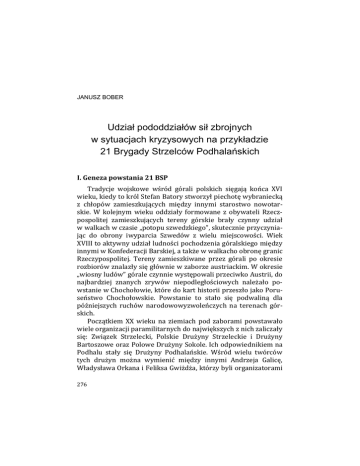 JANUSZ BOBER Udział pododdziałów sił zbrojnych w sytuacjach kryzysowych na przykładzie 21 Brygady Strzelców Podhalańskich I. Geneza powstania 21 BSP Tradycje wojskowe wśród górali polskich sięgają końca XVI wieku, kiedy to król Stefan Batory stworzył piechotę wybraniecką z chłopów zamieszkujących między innymi starostwo nowotarskie. W kolejnym wieku oddziały formowane z obywateli Rzeczpospolitej zamieszkujących tereny górskie brały czynny udział w walkach w czasie „potopu szwedzkiego”, skutecznie przyczyniając do obrony iwyparcia Szwedów z wielu miejscowości. Wiek XVIII to aktywny udział ludności pochodzenia góralskiego między innymi w Konfederacji Barskiej, a także w walkacho obronę granic Rzeczypospolitej. Tereny zamieszkiwane przez górali po okresie rozbiorów znalazły się głównie w zaborze austriackim. W okresie „wiosny ludów” górale czynnie występowali przeciwko Austrii, do najbardziej znanych zrywów niepodległościowych należało powstanie w Chochołowie, które do kart historii przeszło jako Poruseństwo Chochołowskie. Powstanie to stało się podwaliną dla późniejszych ruchów narodowowyzwoleńczych na terenach górskich. Początkiem XX wieku na ziemiach pod zaborami powstawało wiele organizacji paramilitarnych do największych z nich zaliczały się: Związek Strzelecki, Polskie Drużyny Strzeleckie i Drużyny Bartoszowe oraz Polowe Drużyny Sokole. Ich odpowiednikiem na Podhalu stały się Drużyny Podhalańskie. Wśród wielu twórców tych drużyn można wymienić między innymi Andrzeja Galicę, Władysława Orkana i Feliksa Gwiżdża, którzy byli organizatorami 276 Udział pododdziałów sił zbrojnych w sytuacjach kryzysowych na przykładzie… zjazdów Podhalan, na których zapadła decyzjao utworzeniu tej formacji jako zbrojnego pogotowia Podhala na wypadek nadciągającej wojny. Przygotowanie górali do walki o niepodległą Polskę obejmowało ćwiczenia bojowez elementami musztry, orientacji w terenie, służby zwiadowczej, a także udzielania pierwszej pomocy rannym, organizowano też manewry z udziałem kilku drużyn i prowadzono kursy instruktorskie. Drużyny podhalańskie, tworzone w latach 1912–1914, działały na całym Podhalu i skupiły w swoich 76 drużynach około 5 tysięcy członków. Po wybuchu I wojny światowej większość ochotników z drużyn podhalańskich wstąpiła do legionów służąc w II brygadzie, zwanej „Karpacką” lub „Żelazną” zasilając szeregi 3 pułku piechoty. Znaczna też część ochotników z terenów górskich, w tym wielu znanych artystów i literatów z Podhala odbywała służbę w 4 i 6 pułku piechoty, które wchodziły w skład III Brygady Legionów. Odzyskanie niepodległości umożliwiło utworzenie regularnych jednostek Wojska Polskiego, także tych o rodowodzie i charakterze podhalańskim. Pierwszą formacją górską utworzoną na ziemiach polskich był 1 Pułk Strzelców Podhalańskich, który powstał w trzeciej dekadzie listopada 1918 r., na bazie 20 Galicyjskiego Pułku Piechoty Księcia Pruskiego Henryka w Nowym Sączu z inicjatywy płk. Andrzeja Galicy ówczesnego dowódcy Okręgu Wojskowego Podhalańskiego. Drugą jednostki posiadającą charakter formacji górskiej był 3 Pułk Strzelców Podhalańskich wywodzący się z armii gen. Józefa Hallera, który przybył na ziemie polskie jako 2 Pułk Instrukcyjny Grenadierów-Woltyżerów, następnie został przemianowany na 151 pułk piechoty Strzelców Kresowych, a w październiku 1919 r. nadano mu nazwę 3 Pułku Strzelców Podhalańskich i rozlokowano we wsiach okalających Bielsko. Kolejną jednostką górską wywodzącą się z hallerowskich pułków Armii Polskiej we Francji był 4 Pułk Strzelców Podhalańskich, który do kraju przybył w czerwcu 1919 r. Początkowo stacjonował w Skierniewicach jako 143 pułk piechoty Strzelców Kre- 277 Janusz Bober sowych, w marca 1920 r. został przeniesiony do Cieszynie i otrzymał nazwę 4 Pułk Strzelców Podhalańskich. Wszystkie te pułki wraz z 21 pułkiem artylerii lekkiej stacjonującym w Rzeszowie wchodziły w skład 21 Dywizji Piechoty Górskiej w Bielsku, która swoja nazwę otrzymała w 1925 r. Dowódcami tej dywizji byli między innymi gen. Andrzej Galica, a także gen. Józef Kustroń. Drugą dywizją w przedwojennym Wojsku Polskim o charakterze typowo górskim była stacjonująca w Przemyślu 22 Dywizja Piechoty Górskiej, która w swoim składzie posiadała następujące jednostki: 2 Pułk Strzelców Podhalańskich, który powstał na bazie kadry austriackiego 32 Pułku Obrony Krajowej stacjonującego w Bochni. Za datę powstania pułku przyjmuje się grudzień 1918 r., kiedy połączono pluton karabinów maszynowych z kompaniami z Bochni i Nowego Targu, a następnie w grudniu 1920 r. pułk został przeniesiony do Sanoka. Drugim pułkiem wchodzącym w strukturę 22 Dywizji Piechoty Górskiej był 5 Pułk Strzelców Podhalańskich, którego formowanie rozpoczęło się w listopadzie 1918 r. we Włoszech na bazie pułku piechoty. Do kraju przybył w maju 1919 r. jako 46 Pułk Strzelców Kresowych, początkowo stacjonował na Górnym Śląsku, następnie został przemianowany na 5 Pułk Strzelców Podhalańskich i na macierzysty garnizon wyznaczono mu miasto Przemyśl. Kolejną jednostką był utworzony w grudniu 1918 r. jako 5 pułk strzelców polskich na ziemi włoskiej armii gen. Józefa Hallera 6 Pułk Strzelców Podhalańskich, który przybył do Polski w kwietniu 1919 r. Następnie został przemianowany na 47 pułk piechoty Strzelców Kresowych, a swoja nazwę 6 Pułk Strzelców Podhalańskich otrzymał w październiku 1921 r. Do jednostek tej dywizji zaliczał się także stacjonujący w Przemyślu 22 Pułk Artylerii Lekkiej, który powstał we Francji w 1919 r. jako 2 Pułk Artylerii Poloweji w tym samym roku przybył do Polski w składzie armii gen. Józefa Hallera. 278 Udział pododdziałów sił zbrojnych w sytuacjach kryzysow