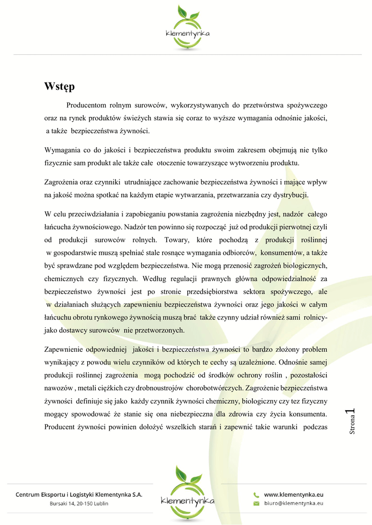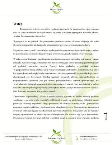 Wstęp Producentom rolnym surowców, wykorzystywanych do przetwórstwa spożywczego oraz na rynek produktów świeżych stawia się coraz to wyższe wymagania odnośnie jakości, a także bezpieczeństwa żywności. Wymagania co do jakości i bezpieczeństwa produktu swoim zakresem obejmują nie tylko fizycznie sam produkt ale także całe otoczenie towarzyszące wytworzeniu produktu. Zagrożenia oraz czynniki utrudniające zachowanie bezpieczeństwa żywności i mające wpływ na jakość można spotkać na każdym etapie wytwarzania, przetwarzania czy dystrybucji. W celu przeciwdziałania i zapobieganiu powstania zagrożenia niezbędny jest, nadzór całego łańcucha żywnościowego. Nadzór ten powinno się rozpocząć już od produkcji pierwotnej czyli od produkcji surowców rolnych. Towary, które pochodzą z produkcji roślinnej w gospodarstwie muszą spełniać stale rosnące wymagania odbiorców, konsumentów, a także być sprawdzane pod względem bezpieczeństwa. Nie mogą przenosić zagrożeń biologicznych, chemicznych czy fizycznych. Według regulacji prawnych główna odpowiedzialność za bezpieczeństwo żywności jest po stronie przedsiębiorstwa sektora spożywczego, ale w działaniach służących zapewnieniu bezpieczeństwa żywności oraz jego jakości w całym łańcuchu obrotu rynkowego żywnością muszą brać także czynny udział również sami rolnicyjako dostawcy surowców nie przetworzonych. Zapewnienie odpowiedniej jakości i bezpieczeństwa żywności to bardzo złożony problem wynikający z powodu wielu czynników od których te cechy są uzależnione. Odnośnie samej produkcji roślinnej zagrożenia mogą pochodzić od środków ochrony roślin , pozostałości nawozów , metali ciężkich czy drobnoustrojów chorobotwórczych. Zagrożenie bezpieczeństwa Producent żywności powinien dołożyć wszelkich starań i zapewnić takie warunki podczas Strona mogący spowodować że stanie się ona niebezpieczna dla zdrowia czy życia konsumenta. 1 żywności definiuje się jako każdy czynnik żywności chemiczny, biologiczny czy tez fizyczny wytwarzania aby wyeliminować lub zredukować zagrożenia do bezpiecznego poziomu i uniemożliwić zwiększenie się jego poziomu i zapobiec zakażeniom wtórnym. Właściciel gospodarstwa musi spełniać warunki oraz zastosować wszelkie możliwe środki niezbędne do zapewnienia bezpieczeństwa i higieny żywności. Osiągnięcie tego celu możliwe jest jedynie przy wdrożeniu uporządkowanego sposobu postępowania opartego na dobrych praktykach określanych jako warunki wstępne czy też programy warunków wstępnych. Podstawowym dokumentem, który określa przepisy higieny odnośnie produkcji pierwotnej (podstawowej) oraz działań powiązanych oraz zaleceń , czy wytycznych w zakresie dobrej praktyki higienicznej określa Załącznik I Rozporządzenia (WE) nr 852/2004 w sprawie higieny środków spożywczych. Zagrożenia mogące pojawić się na etapie produkcji podstawowej Zagrożenia chemiczne Podczas produkcji pierwotnej ich źródłem są wszystkie surowce podstawowe, materiały opakowaniowe, maszyny i urządzenia. Zagrożenia chemiczne są określane jako krytyczne wyróżniki jakości i bezpieczeństwa żywności. Klasyfikuje się ich następująco: naturalnie występujące w surowcach (amigdalina w pestkach wiśni, kwas szczawiowy w rabarbarze) środowiskowe: metale ciężkie, pestycydy, azotany ( III), azotany (V) Podczas produkcji podstawowej najwięcej metali ciężkich dostarczanych jest z żywnością Strona roślinnego obecne są głównie ze względu na stosowanie nawozów mineralnych, natomiast ich 2 pochodzenia roślinnego. Azotany ( III) i azotany (V) w żywności szczególnie pochodzenia obecność w wodach powierzchniowych spowodowana jest zanieczyszczeniami, ściekami komunalnymi i przemysłowymi, odchodami zwierząt. W produkcji roślinnej źródłem zagrożeń mogą być także zabiegi agrotechniczne powiązane z pielęgnacją roślin, zbiorem plonów. Niektóre zagrożenia można wyeliminować już przestrzegając wymagań dobrej praktyki rolniczej i higienicznej. Zmniejszanie ryzyka konsumentów, związanego ze stosowaniem nawozów i pestycydów służą badania monitorowania ich pozostałości. Zagrożenia fizyczne Zagrożenia fizyczne to wszystkie substancje obce i materiały które normalnych warunkach nie występują w żywności, a które mogą spowodować fizyczne uszkodzenie ciała człowieka ich źródłami są: Surowce: piasek , kamyk, pestki, skórki, liście itp. Opakowania: elementy drewniane z palet , plastik szkło, kawałki metalu Elementy maszyn i urządzeń Człowiek: biżuteria , guziki, włosy, paznokcie , wynikające z zaniedbań pracowników Pomieszczenia składowania i przechowywania surowców: szkło okienne, elementy lamp oświetleniowych , kamienie. Zagrożenia mikrobiologiczne Zagrożenia mikrobiologiczne stanowią zagrożenia wywoływane mikroorganizmami patogennymi takimi jak grzyby, wirusy, pierwotniaki czy bakterie, a także organizmy bakterio Strona higieny osobistej, obecność szkodników. 3 podobne. Źródłem zagrożenia może być sam człowiek głównie w wyniku niezachowania Zagrożenia mikrobiologiczne mają wpływ na zdrowie oraz życie człowieka w sposób bezpośredni lub też pośredni. Wpływ bezpośredni polegający na infekcji tkanek wywołanej przez sam drobnoustrój (bakterie, wirusy, pleśnie). Pośrednie oddziaływanie natomiast sprowadza się do wytworzenia przez ten mikroorganizm toksyny, która spowoduje silne zatrucie pokarmowe. Na poziomie produkcji surowców w gospodarstwie wpływ na mikroflorę surowców roślinnym ma gleba, która stanowi spore zbiorowisko wszelkich mikroorganizmów, form wegetatywnych i przetrwalnikowych. Największe zanieczyszczenia gleby występują już w samej warstwie powierzchniowej gdzie dominującymi bakteriami są bakterie z rodzaju Bacillus , Clostridium, Pseudomonas, Proteus, a także drożdże, pleśnie 