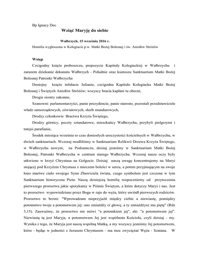 Bp Ignacy Dec Wziąć Maryję do siebie Wałbrzych, 15 września 2016 r. Homilia wygłoszona w Kolegiacie p.w. Matki Bożej Bolesnej i św. Aniołów Stróżów Wstęp Czcigodny księże proboszczu, prepozycie Kapituły Kolegiackiej w Wałbrzychu i zarazem dziekanie dekanatu Wałbrzych - Południe oraz kustoszu Sanktuarium Matki Bożej Bolesnej Patronki Wałbrzycha Dostojny księże infułacie Julianie, czcigodna Kapituło Kolegiacka Matki Bożej Bolesnej i Świętych Aniołów Stróżów; wszyscy bracia kapłani tu obecni, Drogie siostry zakonne, Szanowni: parlamentarzyści, panie prezydencie, panie starosto, pozostali przedstawiciele władz samorządowych, oświatowych, służb mundurowych, Drodzy członkowie Bractwa Krzyża Świętego, Drodzy górnicy, poczty sztandarowe, mieszkańcy Wałbrzycha, przybyli pielgrzymi i tutejsi parafianie, Środek miesiąca września to czas doniosłych uroczystości kościelnych w Wałbrzychu, w dwóch sanktuariach. Wczoraj modliliśmy w Sanktuarium Relikwii Drzewa Krzyża Świętego, w Wałbrzychu nowym, na Podzamczu, dzisiaj jesteśmy w Sanktuarium Matki Bożej Bolesnej, Patronki Wałbrzycha w centrum starego Wałbrzycha. Wczoraj nasze oczy były utkwione w krzyż Chrystusa na Golgocie. Dzisiaj naszą uwagę koncentrujemy na Maryi stojącej pod Krzyżem Chrystusa z mieczem boleści w sercu, a potem przyjmującym na swoje łono martwe ciało swojego Syna Zbawiciela świata, czego symbolem jest czczona w tym Sanktuarium historyczna Pieta. Naszą dzisiejszą homilię rozpoczniemy od przytoczenia pierwszego proroctwa jakie spotykamy w Piśmie Świętym, a które dotyczy Maryi i nas. Jest to proroctwo wypowiedziane przez Boga w raju do węża, który uwiódł pierwszych rodziców. Proroctwo to brzmi: "Wprowadzam nieprzyjaźń między ciebie a niewiastę, pomiędzy potomstwo twoje a potomstwem jej: ono zmiażdży ci głowę, a ty zmiażdżysz mu piętę" (Rdz 3,15). Zauważmy, że proroctwo nie mówi "a potomkiem jej", ale: "a potomstwem jej". Niewiastą tą jest Maryja, a potomstwem Jej jest wspólnota Kościoła, czyli dzisiaj - my. Wynika z tego, że Maryja jest naszą wspólną Matką, a my wszyscy jesteśmy Jej potomstwem, które - będąc w jedności z Jezusem Chrystusem - ma moc zwyciężać Węża - Szatana. W -2świetle tego proroctwa lepiej możemy rozumieć słowa Jezusa wypowiedziane z krzyża do Maryi: "Niewiasto, oto syn Twój" i do ucznia: "Oto Matka twoja" (J 19,26b-27a). W tych słowach Jezus desygnował swoją Matkę na Matkę nas wszystkich. Umiłowany uczeń, tę Matkę, z polecenia Chrystusa, wziął do siebie: "I od tej godziny uczeń wziął Ją do siebie" (J 19,27b). W tegorocznej homilii popatrzmy na Maryję, którą wziął do siebie Kościół powszechny, Kościół w Polsce, miasto Wałbrzych i każdy i każda z nas? 1. Maryja wzięta do wspólnoty Kościoła powszechnego Już wtedy, gdy apostołowie oczekiwali na obiecanego przez Chrystusa Ducha Świętego, Maryja przebywała z nimi na modlitwie. Na soborze w Efezie, w roku 431, Maryja została nazwana Matką Boga, "Theotokos". Maryja była ciągle wspominana w liturgii Kościoła. Kościół układał do Niej w różnych językach świata modlitwy i pieśni, budował pod Jej wezwaniem świątynie i kaplice , a w czasach nowożytnych ogłosił kolejne dwa maryjne dogmaty: w roku 1854- dogmat o Jej Niepokalanym Poczęciu, a w roku 1950 - dogmat o Jej chwalebnym Wniebowzięciu. W ciągu wieków szerzył się kult Maryi w wielu miejscach, które ona sobie sama wybrała i które stały się Jej sanktuariami, gdzie wspomaga swoim wstawiennictwem u Boga swoje dzieci. W jednej z prefacji mszalnych mówimy o Niej: "Wyniesiona do niebieskiej chwały, otacza macierzyńską miłością Kościół pielgrzymujący i wspiera go w dążeniu do wiecznej ojczyzny, aż nadejdzie pełen blasku dzień Pański". Maryja jest uznawana za pierwszą, najdoskonalszą i najświętszą córę Kościoła i jednocześnie za Jego Matkę, Matkę Kościoła, Matkę ludzkości odkupionej przez Jej Syna Jezusa Chrystusa. Kościół powszechny wziął rzeczywiście Maryję do siebie i z Nią przemierza przez ziemię do niebieskiej ojczyny. 2. Maryja wzięta do Kościoła w Polsce Gdy 1050 lat temu nasi praojcowie - Polanie, ze swoim księciem Mieszkiem Pierwszym przyjmowali chrzest, przyjmowali także z Chrystusem i Jego Ewangelią, Maryję Jego Matkę. W naszej diecezji świadczy o tym Figurka Matki Bożej Bardzkiej, która wedle naukowców została wyrzeźbiona z lipowego drzewa kilkadziesiąt lat po przyjęciu chrztu przez Polskę, ok. roku 1010. W roku 1382 na Jasnej Górze przyjęliśmy Ikonę Czarnej Madonny, która w krótkim czasie otrzymała tytuł "Królowa Polski". Od pierwszych wieków chrześcijaństwa w Polsce były wznoszone świątynie pod wezwaniem Maryi. Z czasem powstawały pieśni, modlitwy, bractwa, zakony, organizacje katolickie, które obierały sobie za patronkę Maryję. W ciągu wieków powstało w Polsce wiele sanktuariów maryjnych, -3ogólnokrajowych i regionalnych. Pierwsza koronacja obrazu maryjnego w Kościele powszechnym poza Rzymem miała miejsce na Jasnej Górze, dnia 8 września 1717 roku. Nasza pobożność narodowa ma wyraźnie charakter maryjny. Cała nasza narodowa kultura ma rysy chrześcijańskie , katolickie i maryjne. 3. Maryja wzięta do siebie przez miasto Wałbrzych Maryja, Matka Chrystusa i Matka Kościoła, przywędrowała także do Wałbrzycha. Także Wałbrzych wziął Ją do siebie. Wymownym świadectwem tego jest ta piękna, historyczna Pieta, Matki Bożej Bolesnej, przechowywana i czczona w najstarszym kościele tego miasta, który mieszkańcy od wieków nazywali „Sercem Wałbrzycha”. Dziś, my Polacy, bierzemy Ją na ręce, nosimy ją w procesjach. Chcemy, by z nami była wszędzie, gdzie przeżywamy ważne chwile tego miasta. Stajemy przed nią z naszymi troskami, nadziejami, radościami i bólami. Pochylamy się nad świadectwami historii, by przekonać