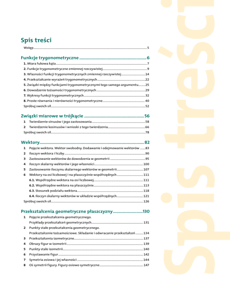 Spis treśc Spis treści Wstęp........................................................................................................................................................ 5 Funkcje trygonometryczne.......................................................6 1. Miara łukowa kąta.......................................................................................................................... 7 2. Funkcje trygonometryczne zmiennej rzeczywistej............................................................ 9 3. Własności funkcji trygonometrycznych zmiennej rzeczywistej.................................14 4. Przekształcanie wyrażeń trygonometrycznych.................................................................22 5. Związki między funkcjami trygonometrycznymi tego samego argumentu..........25 6. Dowodzenie tożsamości trygonometrycznych..................................................................29 7. Wykresy funkcji trygonometrycznych...................................................................................32 8. Proste równania i nierówności trygonometryczne......................................................... 40 Spróbuj swoich sił..............................................................................................................................52 Związki miarowe w trójkącie................................................. 56 1 Twierdzenie sinusów i jego zastosowania........................................................................58 2 Twierdzenie kosinusów i wnioski z tego twierdzenia...................................................66 Spróbuj swoich sił..............................................................................................................................78 Wektory....................................................................................82 1 Pojęcie wektora. Wektor swobodny. Dodawanie i odejmowanie wektorów ........83 2 Iloczyn wektora i liczby.............................................................................................................90 3 Zastosowanie wektorów do dowodzenia w geometrii................................................95 4 Iloczyn skalarny wektorów i jego własności.................................................................. 100 5 Zastosowanie iloczynu skalarnego wektorów w geometrii.................................... 107 6 Wektory na osi liczbowej i na płaszczyźnie współrzędnych.................................... 111 6.1. Współrzędne wektora na osi liczbowej................................................................... 111 6.2. Współrzędne wektora na płaszczyźnie................................................................... 113 6.3. Stosunek podziału wektora......................................................................................... 118 6.4. Iloczyn skalarny wektorów w układzie współrzędnych.................................... 121 Spróbuj swoich sił........................................................................................................................... 126 Przekształcenia geometryczne płaszczyzny.........................130 1 Pojęcie przekształcenia geometrycznego. Przykłady przekształceń geometrycznych..................................................................... 131 2 Punkty stałe przekształcenia geometrycznego. Przekształcenie tożsamościowe. Składanie i odwracanie przekształceń...........134 3 Przekształcenia izometryczne............................................................................................. 137 4 Obrazy figur w izometrii....................................................................................................... 139 5 Punkty stałe izometrii............................................................................................................140 6 Przystawanie figur.................................................................................................................. 142 7 Symetria osiowa i jej własności.........................................................................................144 8 Oś symetrii figury. Figury osiowo symetryczne........................................................... 147 Spis treśc 9 Przystawanie trójkątów........................................................................................................148 10 Zastosowanie cech przystawania trójkątów do dowodzenia twierdzeń........... 152 11 Przesunięcie równoległe....................................................................................................... 155 12 Symetria środkowa i jej własności.................................................................................... 160 13 Środek symetrii figury. Figury środkowo symetryczne.............................................164 14 Obrót płaszczyzny i jego własności.................................................................................. 166 15 Metoda przekształceń geometrycznych w zadaniach .............................................. 173 16 Jednokładność płaszczyzny i jej własności.................................................................... 175 17 Obrazy figur w jednokładności. Figury jednokładne.................................................180 18 Zastosowanie jednokładności w zadaniach..................................................................186 19 Podobieństwo płaszczyzny i jego własności. Podobieństwo figur.......................190 20 Cechy podobieństwa trójkątów......................................................................................... 192 21 Twierdzenie Talesa i jego związek z podobieństwem................................................186 22 Zastosowanie podobieństwa trójkątów do dowodzenia twierdzeń.................... 198 Spróbuj swoich sił..............................................................................................................