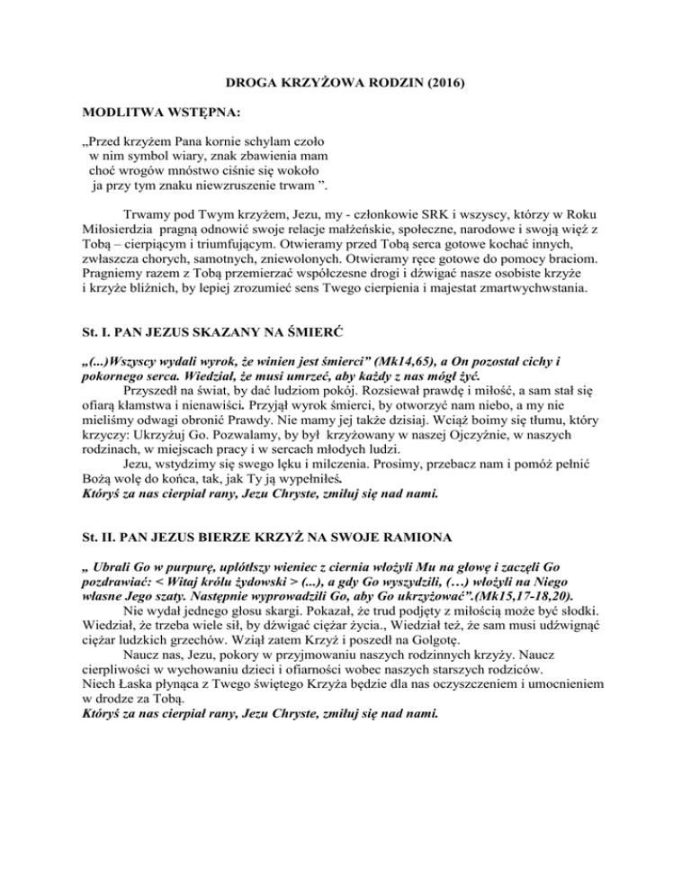 DROGA KRZYŻOWA RODZIN (2016) MODLITWA WSTĘPNA: „Przed krzyżem Pana kornie schylam czoło w nim symbol wiary, znak zbawienia mam choć wrogów mnóstwo ciśnie się wokoło ja przy tym znaku niewzruszenie trwam ”. Trwamy pod Twym krzyżem, Jezu, my - członkowie SRK i wszyscy, którzy w Roku Miłosierdzia pragną odnowić swoje relacje małżeńskie, społeczne, narodowe i swoją więź z Tobą – cierpiącym i triumfującym. Otwieramy przed Tobą serca gotowe kochać innych, zwłaszcza chorych, samotnych, zniewolonych. Otwieramy ręce gotowe do pomocy braciom. Pragniemy razem z Tobą przemierzać współczesne drogi i dźwigać nasze osobiste krzyże i krzyże bliźnich, by lepiej zrozumieć sens Twego cierpienia i majestat zmartwychwstania. St. I. PAN JEZUS SKAZANY NA ŚMIERĆ „(...)Wszyscy wydali wyrok, że winien jest śmierci” (Mk14,65), a On pozostał cichy i pokornego serca. Wiedział, że musi umrzeć, aby każdy z nas mógł żyć. Przyszedł na świat, by dać ludziom pokój. Rozsiewał prawdę i miłość, a sam stał się ofiarą kłamstwa i nienawiści. Przyjął wyrok śmierci, by otworzyć nam niebo, a my nie mieliśmy odwagi obronić Prawdy. Nie mamy jej także dzisiaj. Wciąż boimy się tłumu, który krzyczy: Ukrzyżuj Go. Pozwalamy, by był krzyżowany w naszej Ojczyźnie, w naszych rodzinach, w miejscach pracy i w sercach młodych ludzi. Jezu, wstydzimy się swego lęku i milczenia. Prosimy, przebacz nam i pomóż pełnić Bożą wolę do końca, tak, jak Ty ją wypełniłeś. Któryś za nas cierpiał rany, Jezu Chryste, zmiłuj się nad nami. St. II. PAN JEZUS BIERZE KRZYŻ NA SWOJE RAMIONA „ Ubrali Go w purpurę, uplótłszy wieniec z ciernia włożyli Mu na głowę i zaczęli Go pozdrawiać: < Witaj królu żydowski > (...), a gdy Go wyszydzili, (…) włożyli na Niego własne Jego szaty. Następnie wyprowadzili Go, aby Go ukrzyżować”.(Mk15,17-18,20). Nie wydał jednego głosu skargi. Pokazał, że trud podjęty z miłością może być słodki. Wiedział, że trzeba wiele sił, by dźwigać ciężar życia., Wiedział też, że sam musi udźwignąć ciężar ludzkich grzechów. Wziął zatem Krzyż i poszedł na Golgotę. Naucz nas, Jezu, pokory w przyjmowaniu naszych rodzinnych krzyży. Naucz cierpliwości w wychowaniu dzieci i ofiarności wobec naszych starszych rodziców. Niech Łaska płynąca z Twego świętego Krzyża będzie dla nas oczyszczeniem i umocnieniem w drodze za Tobą. Któryś za nas cierpiał rany, Jezu Chryste, zmiłuj się nad nami. St. III.PAN JEZUS UPADA POD KRZYŻEM Pouczał, że „ Syn Człowieczy musi wiele wycierpieć, że będzie odrzucony ”(Mk8, 31) i tak się stało. Upadł pod ciężarem ludzkich grzechów, by wypełnić wolę Ojca. Bóg, który dał moc i siłę człowiekowi, upadł pod ciężarem ludzkich grzechów. Upadł, ale w imię miłości powstał i poszedł dalej. Zakomunikował światu, że „miłość wszystko przetrzyma”(Kor13,7). Naucz nas, Jezu, takiej miłości. Pokaż, jak w małżeńskim życiu powstawać, mimo ciągłych upadków. Jak do siebie wracać, mimo ciągłych odejść. Jak żyć ze sobą i dla siebie. Otwórz nasze serca na młodych, szukających szczęścia po omacku. Wskaż nam drogę do ich serc i umysłów. Naucz współpracować z Bożą łaską. Któryś za nas cierpiał rany, Jezu Chryste, zmiłuj się nad nami. St. IV. PAN JEZUS SPOTYKA MATKĘ BOLESNĄ „ Twoją duszę miecz przeniknie” ( Łk2,35) – mówił Symeon, lecz Ona wtedy nie rozumiała tych słów. Teraz wszystko stało się jasne. Najukochańsza z niewiast –Matka, choć cierpiała, była szczęśliwa, bo jednym spojrzeniem dodała Synowi sił. A Syn odczytał Jej ból i wlał w serce pewność, że Jego ofiara ma sens. Jezu, naucz nas takiego zawierzenia Bogu i takiej miłości do rodziców. Przytul do Swego miłosiernego serca każdego ojca i każdą matkę. Bądź blisko tych, którzy patrzą na duchową i fizyczną śmierć swoich dzieci. Błogosław młodym małżonkom w ich macierzyństwie i ojcostwie. Wspieraj w dobru małżeństwa niesakramentalne. Oddaj nas w opiekę Swojej Matce. Któryś za nas cierpiał rany, Jezu Chryste, zmiłuj się nad nami. St. V. SZYMON Z CYRENY POMAGA PANU JEZUSOWI DŹWIGAĆ KRZYŻ „ Przymusili niejakiego Szymona z Cyreny, (...) żeby niósł krzyż Jego” (Mk15,21). Wracał właśnie z pola. Mimo zmęczenia nie odmówił. Gdy Jezus rozmnażał chleb i ryby, lgnęły do Niego miliony. Gdy wziął na ramiona zbawienie świata, pozostał sam. Jeden Szymon z Cyreny przyszedł Mu z pomocą, ale… został do tego przymuszony. My także, zapracowani, skoncentrowani na pomnażaniu dóbr osobistych , często pozostajemy obojętni na ludzką krzywdę i nieczuli wobec oczekujących pomocy nawet w najbliższym otoczeniu: w rodzinie, w sąsiedztwie, w parafii. Prosimy, Panie, udoskonal w Roku Miłosierdzia naszą wrażliwość na innych ludzi, zwłaszcza na tych, którzy prócz Ciebie nie mają nikogo. Spraw, byśmy nie z przymusu lecz z dobrej woli, naśladowali w codzienności postawę Cyrenejczyka i każdego dnia służyli Tobie w braciach. Któryś za nas cierpiał rany, Jezu Chryste, zmiłuj się nad nami. St. VI. ŚWIĘTA WERONIKA OCIERA TWARZ PANA JEZUSA „ Do każdego, który przyzna się do Mnie przed ludźmi, przyznam się i Ja przed Ojcem, który jest w niebie” (Mt10,32) Ociekający krwią, ukoronowany cierniem i zlany potem znosił cierpliwie wszystkie szyderstwa i pogardę ludu. I nagle z tego ludu wyszła niewiasta – św. Weronika. Okazując litość Zbawcy, otarła chustą Jego skrwawioną twarz, a On pozostawił na niej swoje oblicze. Jezu, niech wspomnienie tamtego spotkania wzbudzi w nas pamięć o tym, że każdy z nas został stworzony na Twój obraz i podobieństwo. Bądź uwielbiony, Panie, nie tylko w twarzach bohaterskich niewiast, ale także w ich zmęczonych i zapłakanych oczach. Bądź uwielbiony w postawie dzielnych ojców i w cierpieniu mężcz
