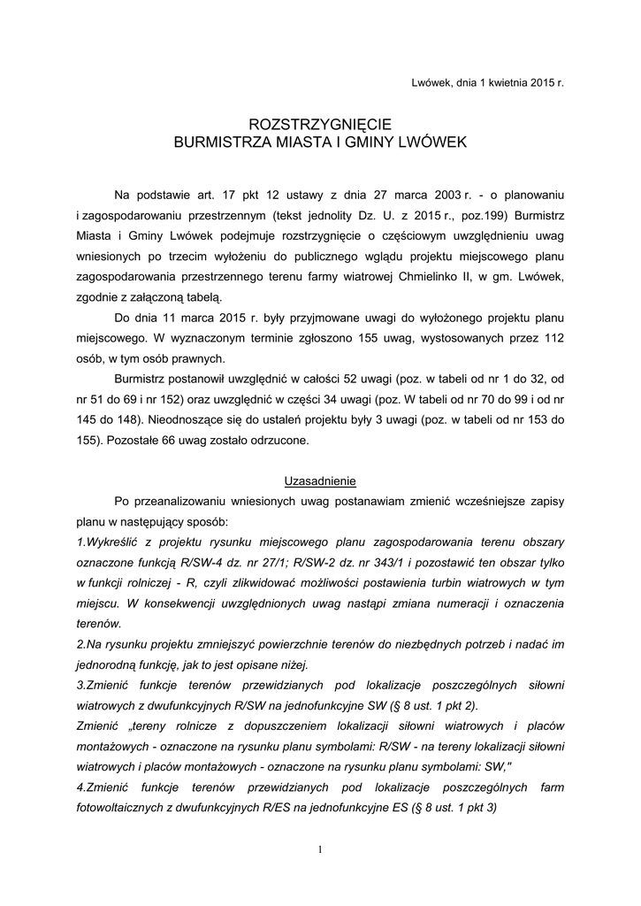 Lwówek, dnia 1 kwietnia 2015 r. ROZSTRZYGNIĘCIE BURMISTRZA MIASTA I GMINY LWÓWEK Na podstawie art. 17 pkt 12 ustawy z dnia 27 marca 2003 r. - o planowaniu i zagospodarowaniu przestrzennym (tekst jednolity Dz. U. z 2015 r., poz.199) Burmistrz Miasta i Gminy Lwówek podejmuje rozstrzygnięcie o częściowym uwzględnieniu uwag wniesionych po trzecim wyłożeniu do publicznego wglądu projektu miejscowego planu zagospodarowania przestrzennego terenu farmy wiatrowej Chmielinko II, w gm. Lwówek, zgodnie z załączoną tabelą. Do dnia 11 marca 2015 r. były przyjmowane uwagi do wyłożonego projektu planu miejscowego. W wyznaczonym terminie zgłoszono 155 uwag, wystosowanych przez 112 osób, w tym osób prawnych. Burmistrz postanowił uwzględnić w całości 52 uwagi (poz. w tabeli od nr 1 do 32, od nr 51 do 69 i nr 152) oraz uwzględnić w części 34 uwagi (poz. W tabeli od nr 70 do 99 i od nr 145 do 148). Nieodnoszące się do ustaleń projektu były 3 uwagi (poz. w tabeli od nr 153 do 155). Pozostałe 66 uwag zostało odrzucone. Uzasadnienie Po przeanalizowaniu wniesionych uwag postanawiam zmienić wcześniejsze zapisy planu w następujący sposób: 1.Wykreślić z projektu rysunku miejscowego planu zagospodarowania terenu obszary oznaczone funkcją R/SW-4 dz. nr 27/1; R/SW-2 dz. nr 343/1 i pozostawić ten obszar tylko w funkcji rolniczej - R, czyli zlikwidować możliwości postawienia turbin wiatrowych w tym miejscu. W konsekwencji uwzględnionych uwag nastąpi zmiana numeracji i oznaczenia terenów. 2.Na rysunku projektu zmniejszyć powierzchnie terenów do niezbędnych potrzeb i nadać im jednorodną funkcję, jak to jest opisane niżej. 3.Zmienić funkcje terenów przewidzianych pod lokalizacje poszczególnych siłowni wiatrowych z dwufunkcyjnych R/SW na jednofunkcyjne SW (§ 8 ust. 1 pkt 2). Zmienić „tereny rolnicze z dopuszczeniem lokalizacji siłowni wiatrowych i placów montażowych - oznaczone na rysunku planu symbolami: R/SW - na tereny lokalizacji siłowni wiatrowych i placów montażowych - oznaczone na rysunku planu symbolami: SW," 4.Zmienić funkcje terenów przewidzianych pod lokalizacje poszczególnych fotowoltaicznych z dwufunkcyjnych R/ES na jednofunkcyjne ES (§ 8 ust. 1 pkt 3) 1 farm Zmienić: „teren rolniczy z dopuszczeniem lokalizacji instalacji fotowoltaicznej - oznaczony na rysunku planu symbolem R/ES - na teren lokalizacji instalacji fotowoltaicznej - oznaczony na rysunku planu symbolem ES". 5.W konsekwencji zmniejszenia powierzchni terenu pod lokalizację siłowni wiatrowych, jak wyżej, wnoszę uwagę do § 26 pkt 1 poprzez zmianę wskaźników zagospodarowania terenu a)intensywność zabudowy: max 0,30 i min. 0,00; b)min. 70% terenów biologicznie czynnych; 6.Zmienić § 42 pkt 1 poprzez dopisanie spójnika oraz, a także usunięcie zapisu o konieczności uzgodnienia z zarządcą drogi. Po zmianie przepis brzmiałby następująco: „Na obszarze objętym planem dopuszcza się budowę oraz rozbudowę lub modernizację istniejącej infrastruktury technicznej, zgodnie z przepisami prawa oraz ustaleniami planu." Powyższe zmiany są zgodne ze stanowiskiem Wojewody Wielkopolskiego. Pozostałe uwagi dotyczyły przede wszystkim terenów R/SW i R/ES - zmiany ich funkcji na teren rolniczy. Ponadto dotyczyły również prognozy oddziaływania na środowisko oraz obawy przed utratą wartości nieruchomości. W poszczególnych kwestiach stwierdzam, co następuje: Odnosząc się do odległości farm wiatrowych od zabudowań w innych krajach a także braku analizy międzynarodowych opracowań informuję, że podane przez wnioskujących wskazane odległości należą do najwyższych, co jest związane z wielkością tych państw (Stany Zjednoczone, Francja), a co za tym idzie, dużymi areałami niezamieszkanymi przez ludzi. Natomiast w krajach, gdzie zabudowa jest gęstsza, te odległości są znacznie mniejsze jak np. w Wielkiej Brytanii, gdzie sąd najwyższy uznał odległość już 350 m za dopuszczalną do lokalizacji turbin wiatrowych, podobnie w Belgii, w Holandii natomiast za minimalną odległość przyjmuje się czterokrotną wysokość masztu. (Źródło: https://www.wind- watch.org/documents/european-setbacks-minimum-distance-between-wind-turbines-and-habitations/” Autor: European Platform Against Windfarms”). Wymienione kraje cechują się pozyskiwaniem energii w znaczącej części z elektrowni wiatrowych od wielu lat. Gdyby zjawiska, takie jak trudne do określenia szkodliwe oddziaływanie infradźwięków miały miejsce, z pewnością na przestrzeni lat pojawiłyby się regulacje prawne chroniące ludzkie zdrowie. Natomiast podawane przez składających uwagi opierają się na opracowaniach będących bardziej spekulacjami, a nie rzetelnymi opracowaniami medycznymi popartymi niezbitymi dowodami. Kwestia hałasu była już wielokrotnie poruszana na kolejnych wyłożeniach, co więcej, na dyskusji publicznej na drugim wyłożeniu uznany akustyk Jacek Szulczyk precyzyjnie wyjaśniał wszystkie zagadnienia związane z tą tematyką. Ponadto projekt planu został uzgodniony z Wojewódzkim Inspektoratem Ochrony Środowiska w Poznaniu, będącym organem właściwym do badaniem poziomu hałasu i mającym na tym polu władzę decyzyjną. WIOŚ jest zarazem organem kontrolującym potencjalne przekroczenia poziomu hałasu, 2 w momencie funkcjonowania farm wiatrowych, a w razie ich wykazania posiada odpowiednie regulacje chroniące obywateli. Zgłaszający uwagi opierali się na opinii Ministerstwa Zdrowia. Departament Zdrowia Publicznego wydał opinię MZ-ZP-Ś- 078-21233- 13/EM/12, z dn. 27 lutego 2012 roku, w której zaleca by turbiny wiatrowe lokować w odległości od 2 do 4 km od najbliższych zabudowań. Przed zajęciem stanowiska, w tak istotnej dla mieszkańców sprawie, Burmistrz wystąpił z zapytaniem do Ministerstwa Zdrowia. Ministerstwo w piśmie, z dnia 01.07.2014 r. (data wpływu do Urzędu 07.07.2014 r.) sygn. MZ-ZP-S-022-29948-2/EM/14 wyja
