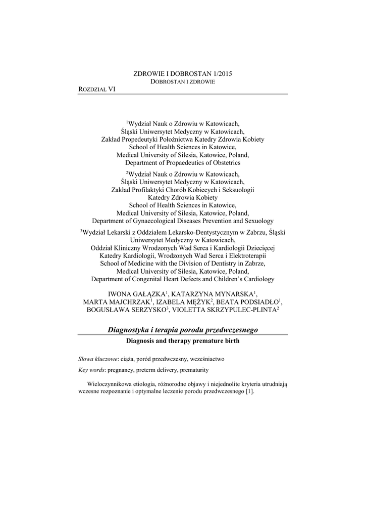ZDROWIE I DOBROSTAN 1/2015 DOBROSTAN I ZDROWIE ROZDZIAŁ VI Wydział Nauk o Zdrowiu w Katowicach, Śląski Uniwersytet Medyczny w Katowicach, Zakład Propedeutyki Położnictwa Katedry Zdrowia Kobiety School of Health Sciences in Katowice, Medical University of Silesia, Katowice, Poland, Department of Propaedeutics of Obstetrics 1 Wydział Nauk o Zdrowiu w Katowicach, Śląski Uniwersytet Medyczny w Katowicach, Zakład Profilaktyki Chorób Kobiecych i Seksuologii Katedry Zdrowia Kobiety School of Health Sciences in Katowice, Medical University of Silesia, Katowice, Poland, Department of Gynaecological Diseases Prevention and Sexuology 2 Wydział Lekarski z Oddziałem Lekarsko-Dentystycznym w Zabrzu, Śląski Uniwersytet Medyczny w Katowicach, Oddział Kliniczny Wrodzonych Wad Serca i Kardiologii Dziecięcej Katedry Kardiologii, Wrodzonych Wad Serca i Elektroterapii School of Medicine with the Division of Dentistry in Zabrze, Medical University of Silesia, Katowice, Poland, Department of Congenital Heart Defects and Children’s Cardiology 3 IWONA GAŁĄZKA1, KATARZYNA MYNARSKA1, MARTA MAJCHRZAK1, IZABELA MĘŻYK2, BEATA PODSIADŁO1, BOGUSŁAWA SERZYSKO3, VIOLETTA SKRZYPULEC-PLINTA2 Diagnostyka i terapia porodu przedwczesnego Diagnosis and therapy premature birth Słowa kluczowe: ciąża, poród przedwczesny, wcześniactwo Key words: pregnancy, preterm delivery, prematurity Wieloczynnikowa etiologia, różnorodne objawy i niejednolite kryteria utrudniają wczesne rozpoznanie i optymalne leczenie porodu przedwczesnego [1]. ZDROWIE I DOBROSTAN 1/2015 Dobrostan i zdrowie Poród przedwczesny coraz częściej uważany jest jako rodzaj zespołu chorobowego składającego się z szeregu czynników biorących udział w patogenezie. Poszczególne czynniki takie jak infekcje w ciąży, niewydolność szyjki macicy, poród przedwczesny w przeszłości, poronienia, ciąża bliźniacza, przedwczesne odpłynięcie płynu owodniowego, czynniki łożyskowe, płodowe i inne czynniki położniczo - ginekologiczne mają kluczowy wpływ na ryzyko wystąpienia porodu przedwczesnego. Istotną role odgrywają ponadto czynniki socjoekonomiczne, demograficzne, a także wiek pacjentki. Zbyt młody wiek matki, rasa, używki znacząco podwyższają ryzyko wystąpienia porodu przedwczesnego [9, 10, 11, 13]. Postęp farmakologii jaki obserwujemy w ostatnim czasie znacząco zwiększa szanse na zahamowanie porodu przedwczesnego i kontynuowanie ciąży, niemniej jednak w dalszym ciągu oscyluje między zwolennikami i przeciwnikami takiej formy terapii. Zarówno w piśmiennictwie, jak i w codziennej praktyce lekarskiej obserwuje się znaczną indywidualizację stosowanych metod terapeutycznych. Właściwe postępowanie jest odzwierciedleniem wieloczynnikowej etiologii porodu przedwczesnego. Problematyka dotycząca optymalizacji postępowania leczniczego w tym powikłaniu opiera się na kilku głównych zagadnieniach. Należą do nich – hamowanie czynności skurczowej mięśnia macicy, stymulacja dojrzewania płuc płodu, sposób ukończenia ciąży w momencie zagrożenia porodem przedwczesnym oraz postępowanie z wcześniakiem [2, 7, 12, 13]. Omawiając znaczenie porodu przedwczesnego i jego etiopatogenezę warto zwrócić uwagę na problem wcześniactwa i wszystkich powikłań związanych z tym okresem [9]. Mimo znaczącego postępu w diagnostyce i leczeniu aż 70-90% zgonów występuje wśród noworodków i niemowląt przedwcześnie urodzonych, dlatego wcześniactwo wciąż jest jednym z wyzwań klinicznych współczesnej medycyny. Wcześniactwo nie jest problemem wyłącznie medycznym. Dotyczy także szeroko rozumianej sfery socjoekonomicznej, dlatego poprawa warunków socjalnych i wzrost statusu ekonomicznego w każdym społeczeństwie może przyczynić się do zmniejszenia częstości występowania wcześniactwa i jego następstw. Każdy wcześniak w mniejszym bądź większym stopniu jest nieprzystosowany do życia, występują u niego zaburzenia adaptacyjne oraz zaburzenia oddychania. Mogą również wystąpić zakażenia, urazy, krwawienia wewnątrzczaszkowe, zapalenia spojówek, a także występująca bardzo często hiperbilirubinemia. W późniejszym okresie życia konsekwencją wcześniactwa mogą być zaburzenia psychoruchowe, intelektualne, a także silne powikłania jak porażenie mózgowe czy zaburzenia wzrokowo – słuchowe [2, 8, 15]. Celem pracy była ocena czynników wpływających na ryzyko wystąpienia porodu przedwczesnego, ze szczególnym uwzględnieniem: oceny wpływu przebytych chorób matki w czasie ciąży na wystąpienie porodu przedwczesnego, oceny wpływu przeszłości położniczej na wystąpienie porodu przedwczesnego, oceny wpływu porodu przedwczesnego na dobrostan noworodka. 92 Iwona Gałązka, Katarzyna Mynarska, Marta Majchrzak, Izabela Mężyk, Beata Podsiadło, Bogusława Serzysko, Violetta Skrzypulec-Plinta Diagnostyka i terapia porodu przedwczesnego MATERIAŁ I METODY Badaniem objęto grupę 90 ciężarnych hospitalizowanych w Prywatnym Szpitalu Położniczo-Ginekologicznym w Katowicach. Zebranie informacji na temat diagnostyki i terapii porodu przedwczesnego umożliwiło stworzenie autorskiego kwestionariusza ankiety. Analizę przeprowadzono na podstawie danych uzyskanych z karty położniczej, historii rozwoju noworodka, a także książki oddziału noworodkowego. We wszystkich analizowanych przypadkach przyczyną przyjęcia na odział było rozpoznanie zagrażającego porodu przedwczesnego. Badaną grupę ciężarnych analizowano w oparciu o następujące dane: wiek matki, wykształcenie, warunki socjoekonomiczne, miejsce zamieszkania, stan cywilny. W badaniu uwzględniono również dane z wywiadu położniczego: wiek ciążowy w dniu przyjęcia, numer kolejny ciąży, obecność w wywiadzie przebytych chorób w czasie ciąży, poronień lub ich brak, przyczynę przyjęcia na odział, powikłania w drugiej połowie ciąży, badania diagnostyczne wykonane w oparciu o zagrożen