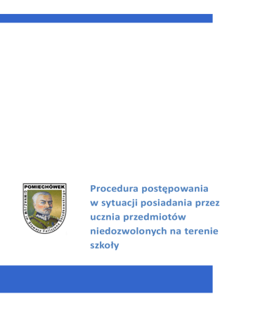 Procedura postępowania w sytuacji posiadania przez ucznia przedmiotów niedozwolonych na terenie szkoły - Gimnazjum im. S. F. Składkowskiego w Pomiechówku – Opracowano na podstawie: Ustawy z dnia 7 września 1991 r. o systemie oświaty (t.j. Dz.U. z 2004 r. Nr 256 poz. 2572 ze zm.), Ustawy z dnia 26 października 1982 r. o postępowaniu w sprawach nieletnich (t.j. Dz.U. z 2014 r. poz. 382), Ustawy z dnia 26 października 1982 r. o wychowaniu w trzeźwości i przeciwdziałaniu alkoholizmowi (t.j. Dz.U. z 2012 r. poz. 1356 ze zm.), Ustawy z dnia 24 kwietnia 1997 r. o przeciwdziałaniu narkomanii (t.j. Dz.U. z 2012 r. poz. 124 ze zm.), Ustawy z dnia 6 kwietnia 1990 r. o Policji (t.j. Dz.U. z 2015 r. poz. 355 ze zm.), Rozporządzenia Ministra Edukacji Narodowej i Sportu z 31 stycznia 2003 r. w sprawie szczegółowych form działalności wychowawczej i zapobiegawczej wśród dzieci i młodzieży zagrożonych uzależnieniem (Dz.U. z 2003 r. Nr 26 poz. 226). §1 Przedmioty, których wnoszenie na teren szkoły jest zabronione, to przedmioty takie, jak: noże, scyzoryki, szpikulce, żyletki, lasery, kije baseballowe, gaz, straszaki broni palnej, petardy, pałki gumowe, kastety, narkotyki, dopalacze, elektroniczne papierosy, przedmioty zagrażające zdrowiu i życiu uczniów, itp. §2 Jeżeli nauczyciel zauważy u ucznia niebezpieczne narzędzie lub uzyska informację, że uczeń posiada niedozwolone narzędzie (z wyjątkiem narkotyków i dopalaczy, których zauważenie stanowi oddzielne zasady postępowania), zobowiązany jest do podjęcia następujących działań: 1) nakłania ucznia do oddania niebezpiecznego przedmiotu (jeżeli uczeń odmawia oddania przedmiotu zabronionego, należy go poinformować, że ma obowiązek oddać przedmiot do depozytu), 2) powiadamia o sytuacji wychowawcę klasy, a w dalszej kolejności pedagoga/psychologa szkolnego oraz dyrektora szkoły, 3) wychowawca/pedagog/psycholog deponuje niebezpieczne narzędzie w gabinecie dyrektora szkoły, 4) wychowawca powiadamia rodziców i wzywa ich do odbioru narzędzia, 2 - Gimnazjum im. S. F. Składkowskiego w Pomiechówku – 5) wychowawca i dyrektor przeprowadzają rozmowę uświadamiająco-dyscyplinującą z uczniem i jego rodzicami (niebezpieczeństwo dla zdrowia i życia uczniów spowodowane posiadaniem i użyciem niebezpiecznego narzędzia na terenie szkoły, konieczność zwiększenia nadzoru rodziców nad uczniem oraz zaniechania podobnych praktyk w przyszłości, konsekwencje prawne), 6) jeśli uczeń odmawia oddania niebezpiecznego narzędzia, nauczyciel odizolowuje go od pozostałych uczniów, korzystając z pomocy innych pracowników szkoły, a dyrektor szkoły decyduje o konieczności zawiadomienia policji, 7) dalsze postępowanie prowadzi policja, 8) powiadomienie kuratora sądowego, jeśli uczeń jest pod jego opieką, 9) kara dostosowana do wagi przewinienia, zgodnie z regulaminem ucznia/statutem szkoły, 10) nauczyciel/wychowawca sporządza notatkę ze zdarzenia i umieszcza w dokumentacji ucznia. §3 Zadania wychowawcy klasy i pedagoga szkolnego: 1) wezwanie rodziców/prawnych opiekunów do szkoły, powiadomienie o konsekwencjach czynu, 2) powiadomienie kuratora sądowego, jeśli uczeń jest pod jego opieką, 3) obecność podczas rewizji przeprowadzonej przez policję w obecności rodziców ucznia lub, jeżeli rodzice odmówią przybycia, w obecności dyrektora szkoły, 4) zastosowanie kary wynikającej z regulaminu ucznia/statutu szkoły, 5) wraz z dyrektorem szkoły przeprowadzenie rozmowy z uczniem i jego rodzicami, ustalenie dalszego działania wychowawczego i poinformowanie o dalszych procedurach postępowania. §4 Zadania dyrektora szkoły: 1) zdeponowanie niedozwolonego narzędzia, 2) wezwanie policji w przypadku, gdy użycie zabronionego przedmiotu może stanowić zagrożenie dla życia lub zdrowia, 3 - Gimnazjum im. S. F. Składkowskiego w Pomiechówku – 3) obecność podczas rewizji przeprowadzonej przez policję w obecności rodziców ucznia lub, jeżeli rodzice odmówią przybycia, w obecności nauczyciela, wychowawcy, pedagoga szkolnego, 4) jeżeli uczeń nie poprawia zachowania – zastosowanie kar wynikających ze statutu szkoły (upomnienie dyrektora, nagana dyrektora), 5) zawiadomienie sądu rodzinnego, 6) jeżeli uczeń w dalszym ciągu nie poprawia zachowania, dyrektor szkoły powiadamia organ nadzoru pedagogicznego i organ prowadzący o demoralizującym wpływie zachowania ucznia na innych uczniów i dotychczasowych działaniach profilaktycznych zastosowanych przez szkołę, a także wszczyna procedury przeniesienia ucznia do innej szkoły, 7) sporządza notatkę służbową z przebiegu sytuacji. §5 W przypadku, gdy nauczyciel znajduje na terenie szkoły substancję przypominającą wyglądem narkotyki lub dopalacze, powinien podjąć następujące kroki: 1) zachowując środki ostrożności, w obecności drugiej osoby zabezpiecza substancję przed dostępem do niej osób niepowołanych oraz ewentualnym jej zniszczeniem lub zabraniem do czasu przyjazdu policji, 2) podejmuje próbę ustalenia, do kogo należy znaleziona substancja, 3) o zaistniałym fakcie informuje dyrektora szkoły, który ma obowiązek wezwać policję, 4) po przyjeździe policji niezwłocznie przekazuje zabezpieczoną substancję oraz informacje dotyczące szczegółów zdarzenia, 5) dalsze postępowanie prowadzi policja, 6) z przebiegu sytuacji nauczyciel sporządza notatkę służbową. §6 W przypadku, gdy nauczyciel podejrzewa, że uczeń posiada przy sobie substancję przypominającą wyglądem narkotyki lub dopalacze, powinien podjąć następujące kroki: 1) powiadamia wychowawcę, a w dalszej kolejności pedagoga/psychologa szkolnego oraz dyrektora szkoły, 2) nauczyciel w obecności wychowawcy lub pedagoga szkolnego żąda, aby uczeń przekazał mu podejrzaną substancję, pokazał zawartość teczki/plecaka (nauczycielowi ani dyrektorowi nie wolno samodzielnie przeszukać rzeczy ucznia), 4 - Gimnazjum im