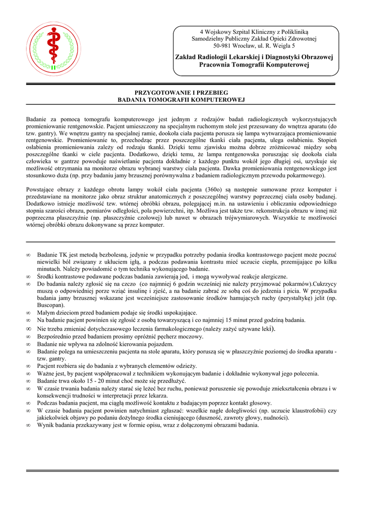 4 Wojskowy Szpital Kliniczny z Polikliniką Samodzielny Publiczny Zakład Opieki Zdrowotnej 50-981 Wrocław, ul. R. Weigla 5 Zakład Radiologii Lekarskiej i Diagnostyki Obrazowej Pracownia Tomografii Komputerowej PRZYGOTOWANIE I PRZEBIEG BADANIA TOMOGRAFII KOMPUTEROWEJ Badanie za pomocą tomografu komputerowego jest jednym z rodzajów badań radiologicznych wykorzystujących promieniowanie rentgenowskie. Pacjent umieszczony na specjalnym ruchomym stole jest przesuwany do wnętrza aparatu (do tzw. gantry). We wnętrzu gantry na specjalnej ramie, dookoła ciała pacjenta porusza się lampa wytwarzająca promieniowanie rentgenowskie. Promieniowanie to, przechodząc przez poszczególne tkanki ciała pacjenta, ulega osłabieniu. Stopień osłabienia promieniowania zależy od rodzaju tkanki. Dzięki temu zjawisku można dobrze zróżnicować między sobą poszczególne tkanki w ciele pacjenta. Dodatkowo, dzięki temu, że lampa rentgenowska poruszając się dookoła ciała człowieka w gantrze powoduje naświetlanie pacjenta dokładnie z każdego punktu wokół jego długiej osi, uzyskuje się możliwość otrzymania na monitorze obrazu wybranej warstwy ciała pacjenta. Dawka promieniowania rentgenowskiego jest stosunkowo duża (np. przy badaniu jamy brzusznej porównywalna z badaniem radiologicznym przewodu pokarmowego). Powstające obrazy z każdego obrotu lampy wokół ciała pacjenta (360o) są następnie sumowane przez komputer i przedstawiane na monitorze jako obraz struktur anatomicznych z poszczególnej warstwy poprzecznej ciała osoby badanej. Dodatkowo istnieje możliwość tzw. wtórnej obróbki obrazu, polegającej m.in. na ustawieniu i obliczaniu odpowiedniego stopnia szarości obrazu, pomiarów odległości, pola powierzchni, itp. Możliwa jest także tzw. rekonstrukcja obrazu w innej niż poprzeczna płaszczyźnie (np. płaszczyźnie czołowej) lub nawet w obrazach trójwymiarowych. Wszystkie te możliwości wtórnej obróbki obrazu dokonywane są przez komputer. • • • • • • • • • • • • • • • • Badanie TK jest metodą bezbolesną, jedynie w przypadku potrzeby podania środka kontrastowego pacjent może poczuć niewielki ból związany z ukłuciem igłą, a podczas podawania kontrastu mieć uczucie ciepła, przemijające po kilku minutach. Należy powiadomić o tym technika wykonującego badanie. Środki kontrastowe podawane podczas badania zawierają jod, i mogą wywoływać reakcje alergiczne. Do badania należy zgłosić się na czczo (co najmniej 6 godzin wcześniej nie należy przyjmować pokarmów).Cukrzycy muszą o odpowiedniej porze wziąć insulinę i zjeść, a na badanie zabrać ze sobą coś do jedzenia i picia. W przypadku badania jamy brzusznej wskazane jest wcześniejsze zastosowanie środków hamujących ruchy (perystaltykę) jelit (np. Buscopan). Małym dzieciom przed badaniem podaje się środki uspokajające. Na badanie pacjent powinien się zgłosić z osobą towarzyszącą i co najmniej 15 minut przed godziną badania. Nie trzeba zmieniać dotychczasowego leczenia farmakologicznego (należy zażyć używane leki). Bezpośrednio przed badaniem prosimy opróżnić pęcherz moczowy. Badanie nie wpływa na zdolność kierowania pojazdem. Badanie polega na umieszczeniu pacjenta na stole aparatu, który poruszą się w płaszczyźnie poziomej do środka aparatu tzw. gantry. Pacjent rozbiera się do badania z wybranych elementów odzieży. Ważne jest, by pacjent współpracował z technikiem wykonującym badanie i dokładnie wykonywał jego polecenia. Badanie trwa około 15 - 20 minut choć może się przedłużyć. W czasie trwania badania należy starać się leżeć bez ruchu, ponieważ poruszenie się powoduje zniekształcenia obrazu i w konsekwencji trudności w interpretacji przez lekarza. Podczas badania pacjent, ma ciągłą możliwość kontaktu z badającym poprzez kontakt głosowy. W czasie badania pacjent powinien natychmiast zgłaszać: wszelkie nagłe dolegliwości (np. uczucie klaustrofobii) czy jakiekolwiek objawy po podaniu dożylnego środka cieniującego (duszność, zawroty głowy, nudności). Wynik badania przekazywany jest w formie opisu, wraz z dołączonymi obrazami badania.