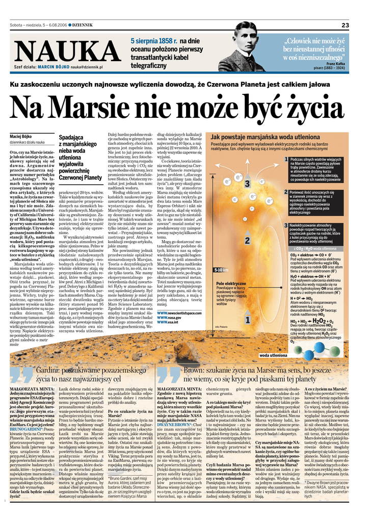 23 Sobota – niedziela, 5 – 6.08.2006 ● DZIENNIK NAUKA Szef działu: MARCIN BÓJKO [email protected] „Człowiek nie może żyć bez nieustannej ufności w coś niezniszczalnego” 5 sierpnia 1858 r. na dnie oceanu położono pierwszy transatlantycki kabel telegraficzny Franz Kafka pisarz (1883 – 1924) CORBIS Ku zaskoczeniu uczonych najnowsze wyliczenia dowodzą, że Czerwona Planeta jest całkiem jałowa Na Marsie nie może być życia Maciej Bójko dziennikarz działu nauka O to, czy na Marsie istnieje lub nie istnieje życie, naukowcy spierają się od d aw n a . A r gu m e n t ów przeciw dostarcza najnowszy numer periodyku „Astrobiology”. Na łamach tego szacownego czasopisma ukazały się dwa artykuły, z których wynika, że życia na czwartej planecie od Słońca nie ma i być nie może. Zdaniem uczonych z University of California i University of Michigan Mars bez przerwy sam starannie się dezynfekuje. Używa do tego znanej nam dobrze substancji: H2O2, nadtlenku wodoru, który pod postacią kilkuprocentowego roztworu kupujemy w aptece w butelce z etykietką „woda utleniona”. Marsjańska woda utleniona według teorii amerykańskich naukowców powstaje dzięki... piaskowi. Otóż trzeba przyznać, że pogoda na Czerwonej Planecie jest wybitnie nieprzyjemna. Wichry, trąby powietrzne, ogromne burze piaskowe wysokie na kilkanaście kilometrów są na porządku dziennym. Taki wzburzony tuman marsjańskiego pyłu to nic innego jak wielki generator elektrostatyczny. Napięcie elektryczne pomiędzy punktami odległymi zaledwie o metr może Spadająca z marsjańskiego nieba woda utleniona wyjałowiła powierzchnię Czerwonej Planety przekroczyć 20 tys. woltów. Takie w każdym razie są wyniki pomiarów przeprowadzonych na ziemskich burzach piaskowych. Marsjańskie są gwałtowniejsze. Założenie, że i tam w trąbie powietrznej elektryczność szaleje, wydaje się uprawnione. W wyniku tej aktywności marsjańska atmosfera jest silnie zjonizowana. Pełno w niej z jednej strony kationów (dodatnie naładowanych cząsteczek), z drugiej – swobodnych elektronów. I te właśnie elektrony stają się przyczynkiem do cyklu reakcji, które według zespołów prof. Atrei z Michigan i prof. Delory’ego z Kalifornii zachodzą w średnich partiach atmosfery Marsa. Cząsteczki dwutlenku węgla (który stanowi ponad 95 proc. marsjańskiego powietrza), i pary wodnej rozpadają się, a z tych mniejszych czynników powstaje między innymi właśnie owa nieszczęsna woda utleniona. Dalej: bardzo podobne reakcje zachodzą w górnych partiach atmosfery, chociaż ich geneza jest zupełnie inna. Nie jest to już proces elektrochemiczny, lecz fotochemiczny: przyczyną rozpadu cząsteczek wody i CO2 nie są swobodne elektrony, lecz promieniowanie ultrafioletowe Słońca. Ostateczny rezultat jest jednak ten sam: nadtlenek wodoru. Według obliczeń amerykańskich naukowców jego zawartość w atmosferze jest wystarczająco duża, by Mars był regularnie zraszany deszczami z wody utlenionej. W takich warunkach życie nie miałoby szans nie tylko istnieć, ale nawet powstać. – Przynajmniej takie, zastrzega prof. Atreya w konkluzji swojego artykułu, jakie znamy. Nie powinniśmy jednak przedwcześnie opłakiwać nienarodzonych Marsjan. Teoria o dezynfekujących deszczach to, no cóż, na razie tylko teoria. Nie mamy eksperymentalnego potwierdzenia dużej zawartości H2O2 w atmosferze naszej sąsiedniej planety. Być może będziemy je mieć już za cztery lata dzięki sondzie Mars Science Laboratory. Zgodnie z planem ma ona między innymi szukać śladów życia na Marsie i badać skład jego atmosfery oraz budowę geochemiczną. We- dług dzisiejszych kalkulacji sonda wyląduje na Marsie najwcześniej 10 lipca, a najpóźniej 22 września 2010. A wtedy wszystko zapewne się wyjaśni. Co ciekawe, teoria istnienia wody utlenionej na Czerwonej Planecie rozwiązuje jeden problem („dlaczego nie znaleźliśmy tam śladu życia”), ale przy okazji gmatwa inny. W atmosferze Marsa znajdują się nieduże ilości metanu (wykryła go dwa lata temu sonda Mars Express Orbiter) i nikt nie ma pojęcia, skąd się wzięły. Jest to gaz na tyle niestabilny, że nie może istnieć „od zawsze”: musiał zostać wyprodukowany czy zaimportowany najwyżej kilkaset lat temu. Mogą go dostarczać metanobakterie podobne do tych, które u nas są odpowiedzialne za ogniki bagienne. Tyle że jeśli atmosfera Marsa jest pełna nadtlenku wodoru, to po pierwsze, zabiłby on bakterie, po drugie, skutecznie usuwał metan. Toteż naukowcy muszą szukać jeszcze wydajniejszego źródła tego gazu, niż do tej pory zakładano, a mają o jedną obiecującą teorię mniej. Jak powstaje marsjańska woda utleniona Powstające pod wpływem wyładowań elektrycznych rodniki są bardzo reaktywne, tzn. chętnie łączą sią z innymi cząsteczkami chemicznymi e- e- Podczas silnych wiatrów wiejących na Marsie często powstają pyłowe trąby powietrzne. Zawieszone w atmosferze drobiny kurzu nieustannie się ze sobą zderzają, co powoduje ich naelektryzowanie 2 Ponieważ ilość unoszacych się w ziarenek zmienia się wraz z wysokością, dochodzi do ogólnego naelektryzowania atmosfery i powstania pola elektrycznego 3 Naelektryzowanie atmosfery powoduje rozpad tworzących ją cząsteczek gazów na rodniki, które z kolei przyczyniają sią do powstawania wody utlenionej e- 3 e- e- 1 e- ee- 2 z CO2 i H2O woda utleniona CO2 + elektron CO + 0Pod wpływem uderzenia elektronu cząsteczka dwutlenku węgla CO2 rozpada się na rodnik CO oraz atom tlenu z wolnym elektronem (0-) H2O + elektron OH + HPod wpływem uderzenia elektronu cząsteczka wody rozpada się na rodnik hydroksylowy OH oraz atom wodoru z wolnym elektronem (H-) 5-10 km Pole elektryczne Powstające w burzy piaskowej napięcia są ogromne i sięgają setek tysięcy woltów WWW.newscientistspace.com WWW.nasa.gov WWW.esa.int H + O2 HO2 Atom wodoru z niesparowanym elektrone