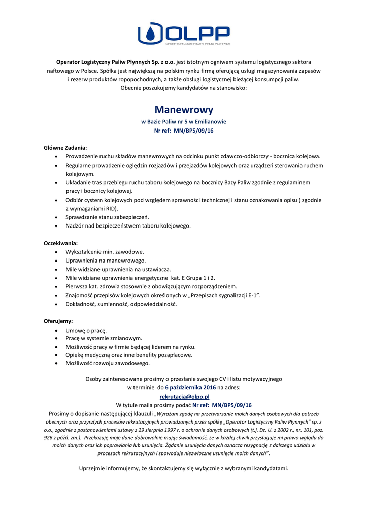 Operator Logistyczny Paliw Płynnych Sp. z o.o. jest istotnym ogniwem systemu logistycznego sektora naftowego w Polsce. Spółka jest największą na polskim rynku firmą oferującą usługi magazynowania zapasów i rezerw produktów ropopochodnych, a także obsługi logistycznej bieżącej konsumpcji paliw. Obecnie poszukujemy kandydatów na stanowisko: Manewrowy w Bazie Paliw nr 5 w Emilianowie Nr ref: MN/BP5/09/16 Główne Zadania: Prowadzenie ruchu składów manewrowych na odcinku punkt zdawczo-odbiorczy - bocznica kolejowa. Regularne prowadzenie oględzin rozjazdów i przejazdów kolejowych oraz urządzeń sterowania ruchem kolejowym. Układanie tras przebiegu ruchu taboru kolejowego na bocznicy Bazy Paliw zgodnie z regulaminem pracy i bocznicy kolejowej. Odbiór cystern kolejowych pod względem sprawności technicznej i stanu oznakowania opisu ( zgodnie z wymaganiami RID). Sprawdzanie stanu zabezpieczeń. Nadzór nad bezpieczeństwem taboru kolejowego. Oczekiwania: Wykształcenie min. zawodowe. Uprawnienia na manewrowego. Mile widziane uprawnienia na ustawiacza. Mile widziane uprawnienia energetyczne kat. E Grupa 1 i 2. Pierwsza kat. zdrowia stosownie z obowiązującym rozporządzeniem. Znajomość przepisów kolejowych określonych w „Przepisach sygnalizacji E-1”. Dokładność, sumienność, odpowiedzialność. Oferujemy: Umowę o pracę. Pracę w systemie zmianowym. Możliwość pracy w firmie będącej liderem na rynku. Opiekę medyczną oraz inne benefity pozapłacowe. Możliwość rozwoju zawodowego. Osoby zainteresowane prosimy o przesłanie swojego CV i listu motywacyjnego w terminie do 6 października 2016 na adres: [email protected] W tytule maila prosimy podać Nr ref: MN/BP5/09/16 Prosimy o dopisanie następującej klauzuli „Wyrażam zgodę na przetwarzanie moich danych osobowych dla potrzeb obecnych oraz przyszłych procesów rekrutacyjnych prowadzonych przez spółkę „Operator Logistyczny Paliw Płynnych” sp. z o.o., zgodnie z postanowieniami ustawy z 29 sierpnia 1997 r. o ochronie danych osobowych (t.j. Dz. U. z 2002 r., nr. 101, poz. 926 z późń. zm.). Przekazuję moje dane dobrowolnie mając świadomość, że w każdej chwili przysługuje mi prawo wglądu do moich danych oraz ich poprawiania lub usunięcia. Żądanie usunięcia danych oznacza rezygnację z dalszego udziału w procesach rekrutacyjnych i spowoduje niezwłoczne usunięcie moich danych”. Uprzejmie informujemy, że skontaktujemy się wyłącznie z wybranymi kandydatami.