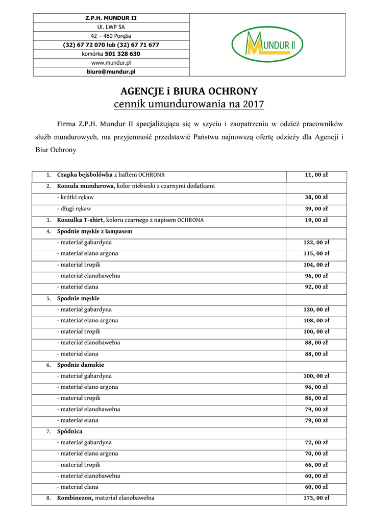 AGENCJE i BIURA OCHRONY cennik umundurowania na 2017