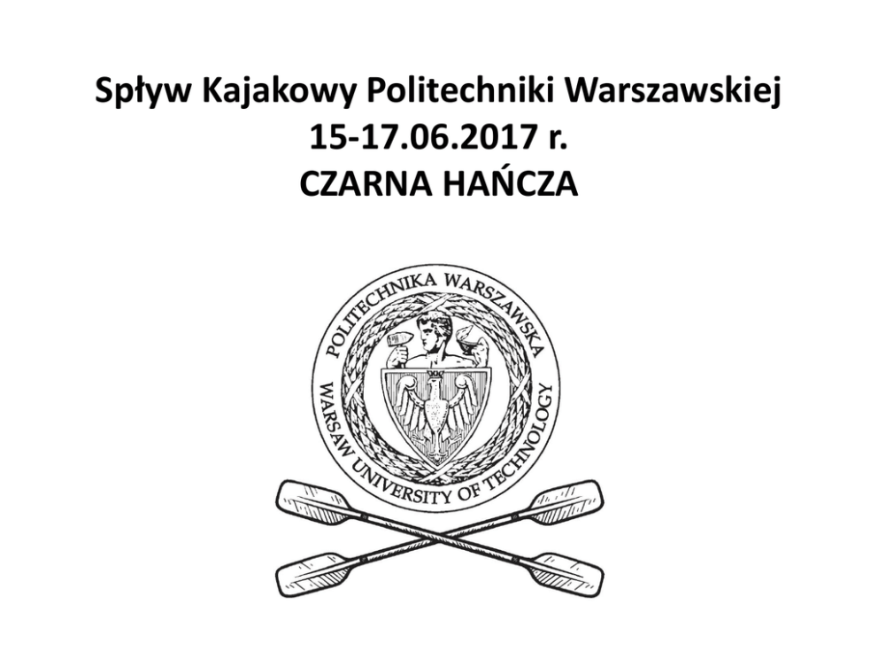Spływ Kajakowy Politechniki Warszawskiej 15-17.06.2017 r. CZARNA HAŃCZA Termin i koszty Spływ jest organizowany przez Studium Wychowania i Sportu Politechniki Warszawskiej dla studentów w ramach zajęć wychowania fizycznego. W spływie mogą wziąć udział studenci zaliczający bieżący semestr WF, odrabiający zaległości oraz studenci, którzy zakończyli już zajęcia sportowe. Termin: 15-17 czerwca 2017 r. Koszt spływu: 160 zł Cena zawiera: o o o o o o o wypożyczenie kajaków, wioseł, kamizelek asekuracyjnych na 3 dni, 2 noclegi na polach namiotowych, transport kajaków, pamiątkową koszulkę, ubezpieczenie NW i KL, opiekę instruktorów, inne atrakcje. W cenie nie są zawarte: o o o dojazd na miejsce zbiórki i powrót, wyżywienie, namioty. Trasa CZARNA HAŃCZA 1 dzień: Maćkowa Ruda – Frącki 2 dzień: Frącki – Jałowy Róg 3 dzień: Jałowy Róg – Śluza Paniewo Jak się przygotować Co zabieramy Czego nie zabieramy o Namiot (jeden na dwie lub trzy osoby), o o Matę do spania, Laptopów, notebooków, i innych urządzeń, które źle znoszą kontakt z wodą lub dużą wilgocią, o Śpiwór, o Plecaków ze stelażem, walizek, o Duże mocne worki foliowe lub specjalne worki kajakowe (wodoodporne), o Kosmetyczek typu „kuferek“, o Zbędnych ubrań lub rzeczy osobistych. o Scyzoryk, o Taśma typu „power tape“, o Wodoodporna saszetka lub pojemnik na telefon, dokumenty, pieniądze etc., o Ręcznik, o Klapki, o Kurtka przeciw deszczowa, o Czapka, o Strój kąpielowy, o Ciepła bluza (polar, softshell), o Latarka/ czołówka. Pamiętajcie że wszystkie rzeczy, które zabierzecie ze sobą, codziennie musicie spakować, zabezpieczyć przed wodą i transportować ze sobą w kajaku. Jak dojechać i wrócić • POCIĄGIEM • Samochodem Dojazd 7.36 - TLK Z W-Wa zachodnia. Dojeżdżacie do Suwałk gdzie o 12.17 będzie czekał na Was autokar którym pojedziecie do Maćkowej Rudy gdzie rozpoczynamy spływ. Zbiórka w Maćkowej Rudzie o 13.00. Na podróż z Warszawy zarezerwujcie ok 4,5 godziny. Samochody zostawiacie na parkingu (nie odpłatnie). Po spływie busy którymi będą wracać kajaki przewiozą kierowców do Maćkowej Rudy po samochody. Możecie również przyjechać dzień wcześniej i zanocować na polu namiotowym. Powrót Przy śluzie Paniewo będzie czekał autokar który zawiezie Was do Augustowa skąd macie kilka połączeń do Warszawy. Zapisy Zapisujemy się wysyłając email o treści: W tytule: Spływ kajakowy czerwiec 2017 r. (imię i nazwisko studenta), W treści: 1.Imię i Nazwisko 2.Wydział i semestr studiów (ten semestr, który będziemy zaliczali spływem) lub nie zaliczam WF 3.Grupa dziekańska 4.Nr telefonu kontaktowego 5.Numer albumu 6.Rozmiar koszulki: S, M, L, XL, XXL. Panie podają rozmiar koszulki damskiej a panowie męskiej. Zgłoszenie wysyłamy na adres : [email protected] Ilość miejsc na spływie jest ograniczona, o zakwalifikowaniu się do grupy decyduje kolejność zgłoszeń. Wpłaty Opłatę za spływ - 160 zł należy wpłacić między 1 a 30 kwietnia 2017 r. Wpłatę należy dokonać na konto: Studium Wychowania Fizycznego i Sportu Politechniki Warszawskiej ul. Waryńskiego 12a 00-631 Warszawa Nr konta: 20124010535111643000100091 W tytule: Spływ Kajakowy czerwiec 2017, imię i nazwisko (studenta)