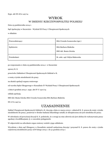 Sygn. akt III AUa 142/14 WYROK W IMIENIU RZECZYPOSPOLITEJ POLSKIEJ Dnia 23 października 2014 r. Sąd Apelacyjny w Szczecinie - Wydział III Pracy i Ubezpieczeń Społecznych w składzie: Przewodniczący: SSA Urszula Iwanowska (spr.) Sędziowie: SSA Barbara Białecka SSO del. Beata Górska Protokolant: St. sekr. sąd. Edyta Rakowska po rozpoznaniu w dniu 23 października 2014 r. w Szczecinie sprawy K. S. przeciwko Zakładowi Ubezpieczeń Społecznych Oddział w K. o rentę z tytułu niezdolności do pracy na skutek apelacji organu rentowego od wyroku Sądu Okręgowego w Koszalinie IV Wydział Pracy i Ubezpieczeń Społecznych z dnia 6 grudnia 2013 r. sygn. akt IV U 1517/13 oddala apelację. SSO del. Beata Górska SSA Urszula Iwanowska SSA Barbara Białecka III A Ua 142/14 UZASADNIENIE Zakład Ubezpieczeń Społecznych Oddział w K. decyzją z dnia 21 marca 2013 r. odmówił K. S. prawa do renty z tytułu niezdolności do pracy, ponieważ w drodze badania lekarskiego ustalił, że ubezpieczona nie jest niezdolna do pracy. W odwołaniu od powyższej decyzji K. S. podniosła, że z uwagi na stan zdrowia nie jest zdolna do wykonywania pracy zgodnej z kwalifikacjami, tj. w zawodzie pielęgniarki. W odpowiedzi na odwołanie organ rentowy wniósł o jego oddalenie. Wyrokiem z dnia sąd Okręgowy w Koszalinie zmienił zaskarżoną decyzję i przyznał K. S. prawo do renty z tytułu częściowej niezdolności pracy od 8 lutego 2013 r. do 31 grudnia 2013 r. Powyższe orzeczenie Sąd Okręgowy oparł o następujące ustalenia faktyczne i rozważania prawne: K. S. dnia 15 stycznia 2013 r. zgłosiła wniosek o przyznanie prawa do renty z tytułu niezdolności do pracy. Posiada wymagany okres składkowy i nieskładkowy w dziesięcioleciu przed datą zgłoszenia wniosku. Do 7 lutego 2013 r. była uprawniona do świadczenia rehabilitacyjnego. Lekarz orzecznik ZUS orzeczeniem z dnia 13 lutego 2013 r. uznał, że ubezpieczona nie jest niezdolna do pracy. Rozpatrując sprzeciw ubezpieczonej od tego orzeczenia, komisja lekarska ZUS orzeczeniem z dnia 11 marca 2013 r. uznała, że ubezpieczona nie jest niezdolna do pracy. W poparciu o to orzeczenie organ rentowy zaskarżoną decyzją odmówił ubezpieczonej prawa do renty z tytułu niezdolności do pracy. Ubezpieczona jest częściowo niezdolna do pracy po zakończeniu pobierania świadczenia rehabilitacyjnego do 31 grudnia 2013 r. Po ustaleniu powyższego stanu faktycznego oraz na podstawie art. 57 w związku z art. 12 i 13 ustawy z dnia 17 grudnia 1998 r. o emeryturach i rentach z Funduszu Ubezpieczeń Społecznych (j. t. Dz. U. z 2009 r., nr 153, poz. 1227 ze zm.; powoływana dalej jako: ustawa emerytalno-rentowa) Sąd Okręgowy uznał odwołanie za zasadne. W celu oceny stanu zdrowia ubezpieczonej sąd pierwszej instancji dopuścił dowód z opinii biegłych z zakresu medycyny. Biegli lekarze specjaliści: ortopeda A. K., neurolog dr n. med. B. M. i psychiatra dr n. med. M. Ś. w wydanej dnia 10 sierpnia 2013 r. opinii rozpoznali u ubezpieczonej: 1. zespół bólowy kręgosłupa w wywiadzie na podłożu zmian zwyrodnieniowo dyskopatycznych, bez cech neuropatii szyjnej oraz cech podrażnienia układu nerwowego; 2. zaburzenia depresyjne i lękowe mieszane; zaburzenia adaptacyjne - reakcja depresyjna przedłużona; 3. zespół zależności alkoholowej do weryfikacji; szkodliwe picie alkoholu. Zdaniem biegłych ubezpieczona jest częściowo okresowo niezdolna do pracy po zakończeniu świadczenia rehabilitacyjnego tj. od 7 lutego 2013 r. nadal do grudnia 2013 r. W uzasadnieniu opinii biegli w zakresie neurologii i ortopedii wskazali, że aktualny stan zdrowia zezwala na podjęcie pracy zarobkowej w zawodzie pielęgniarki, gdyż nie stwierdzili cech podrażnienia układu nerwowego, niedowładów lub podrażnień oraz upośledzenia funkcji narządu ruchu. Dalej sąd pierwszej instancji podniósł, że w ocenie biegłej psychiatry ubezpieczona po ustaniu świadczenia rehabilitacyjnego w lutym 2013 r. nie odzyskała zdolności do pracy w wyuczonym i dotychczas wykonywanym zawodzie pielęgniarki z powodu naruszenia sprawności zdrowia psychicznego: zaburzeń depresyjnych z objawami somatycznymi oraz szkodliwego picia alkoholu pogłębiającego destrukcję i przebieg leczenia. Ubezpieczona ma silne mechanizmy zaprzeczania, stąd nie można jednoznacznie na podstawie kryteriów (...) rozpoznać uzależnienia od alkoholu pomimo tak znaczących objawów jak utrata pracy (dysfunkcja społeczna) i picie pomimo wyraźnej szkodliwości (łączenie z lekami). Ubezpieczona jest okresowo niezdolna do pracy pielęgniarki (nasilenie objawów mimo terapeutycznych dawek leków), ale powinna odbyć leczenie stacjonarne psychiatryczne z odwykowym i psychoterapią. W opinii uzupełniającej z dnia 19 października 2013 r. biegła psychiatra ustosunkowując się do zarzutów organu rentowego do opinii uznała je za błędne i nie merytoryczne. Wyjaśniła nadto, że w ramach kryteriów uzależnienia od alkoholu według (...)(...) mieści się, między innymi, zmiana linii życiowej, w tym zawodowej (utrata pracy), związków itp. świadczących o dysfunkcyjności we wskazanych obszarach, i psychodegradacji. Łącznie alkoholu z lekami potwierdza zmniejszenie krytycyzmu, głębokie uzależnienie, utratę kontroli (zwłaszcza przy wykonywaniu zawodu pielęgniarki mającej wiedze w tym zakresie). Biegła wskazała, że podstawą stanowiska biegłej uzasadniającym częściową niezdolność do pracy nie był ZZA, ale manifestacja pod postacią zaburzeń depresyjno- lękowych z behawioralną maską utraty kontroli picia alkoholu. W aktualnym stanie zdrowia ubezpieczona nie jest zdolna do wykonywania zawodu pielęgniarki. Sąd Okręgowy zaznaczył, że wszechstronnie rozważył opinie biegłych wydane w przedmiotowej sprawie w świetle zebranego w sprawie materiału dowodowego, uznając je za rzetelne, miarodajne i przydatne dla sprawy. Biegli jasno i zrozumiale wypowiedzieli się w kwe