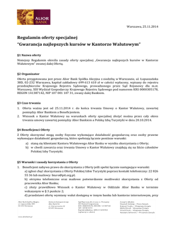 Warszawa, 25.11.2014 Regulamin oferty specjalnej “Gwarancja najlepszych kursów w Kantorze Walutowym” §1 Nazwa oferty Niniejszy Regulamin określa zasady oferty specjalnej „Gwarancja najlepszych kursów w Kantorze Walutowym” zwanej dalej Ofertą. §2 Organizator Oferta przygotowana jest przez Alior Bank Spółka Akcyjna z siedzibą w Warszawie, ul. Łopuszańska 38D, 02-232 Warszawa, kapitał zakładowy 699 613 610 zł w całości wpłacony, wpisany do rejestru przedsiębiorców Krajowego Rejestru Sądowego, prowadzonego przez Sąd Rejonowy dla m.st. Warszawy, XIII Wydział Gospodarczy Krajowego Rejestru Sądowego pod numerem KRS 0000305178, REGON 141387142, NIP 107 001 107 31, zwany dalej Bankiem. §3 Czas trwania 1. Oferta ważna jest od 25.11.2014 r. do końca trwania Umowy o Kantor Walutowy, zawartej pomiędzy Alior Bankiem a Beneficjentem. 2. Wniosek o Kantor Walutowy na warunkach oferty specjalnej złożyć można przez cały okres trwania umowy zawartej pomiędzy Alior Bankiem a Polską Izbą Turystyki w dniu 20.10.2014. §4 Beneficjenci Oferty Z Oferty skorzystać mogą osoby fizyczne wykonujące działalność gospodarczą oraz osoby prawne wykonujące działalność gospodarczą, które spełniają łącznie poniższe warunki: a) staną się klientami Kantoru Walutowego Alior Banku w wyniku skorzystania z Oferty; b) w chwili zawarcia oraz trwania Umowy o Kantor Walutowy znajdują się na liście członków Polskiej Izby Turystyki. §5 Warunki i zasady korzystania z Oferty 1. Beneficjent nabywa prawo do skorzystania z Oferty jeśli spełni łącznie następujące warunki: a) zgłosi chęć skorzystania z Oferty Polskiej Izbie Turystyki poprzez kontakt telefoniczny: 22 826 55 36 lub mailowy: [email protected]; b) otrzyma telefoniczne oraz mailowe potwierdzenie możliwości skorzystania z Oferty od pracownika Alior Banku; c) złoży prawidłowo Wniosek o Kantor Walutowy w Oddziale Alior Banku w terminie wskazanym w § 3 punkcie 2; d) przedstawi ofertę wymiany walut dostępną w innym banku lub kantorze internetowym, przy czym przedstawiona oferta: I. musi być w postaci zrzutu ekranu z platformy internetowej innego banku lub kantoru internetowego lub potwierdzenia wygenerowanego z systemu bankowości internetowej innego banku; II. zawierać musi niżej wymienione informacje: para walutowa, transakcyjny kurs walutowy, dokładny czas oferowanego kursu (dzień, godzina, minuta), źródło (nazwa banku lub kantoru) 2. Alior Bank może wymagać podpisania przez Beneficjenta Oferty oświadczenia o treści: "Oświadczam, iż przedstawione przeze mnie dane są zgodne z otrzymaną ofertą w innym banku/kantorze internetowym". 3. Alior Bank zastrzega sobie możliwość wycofania się z Oferty w sytuacji, gdy Beneficjent przedstawi ofertę innego banku lub kantoru internetowego, w której spread będzie niższy bądź równy co spread rynkowy (różnica pomiędzy ceną sprzedaży a ceną kupna, oferowaną przez Alior Bank pomniejszona o marżę Banku), powiększony o minimalną jednostkę marży, nakładaną przez Bank. 4. W przypadku, gdy Beneficjent nie udokumentuje oferty innego banku lub kantoru internetowego, otrzymuje warunki preferencyjne w postaci spreadu niższego o 40% od spreadu oferowanego w standardowej ofercie Kantoru Walutowego Alior Banku, widocznej na stronie www.kantor.aliorbank.pl. §6 Odpowiedzialność Alior Banku i Beneficjenta Oferty 1. Warunki cenowe ustalone pomiędzy Alior Bankiem a Beneficjentem zostaną aktywowane niezwłocznie, ale nie później niż 7 dni roboczych od momentu prawidłowo złożonego Wniosku o Kantor Walutowy. 2. Alior Bank oświadcza, że dołoży wszelkich starań, by przez cały okres trwania Promocji oferta cenowa Kantoru Walutowego ustalona w ramach Oferty była lepsza od oferty innego banku lub kantoru internetowego, przedstawionej przez Beneficjenta. 3. Z uwagi na poniższe: a) każdorazowo przed zawarciem transakcji wymiany walut w Alior Banku, Beneficjent informowany jest o kursie, po którym nastąpi przewalutowanie, b) transakcja wymiany walut zawarta w Kantorze Walutowym Alior Banku ma charakter nieodwołalny, c) sytuacja, w której Beneficjent zawrze transakcję w Kantorze Walutowym po kursie gorszym niż był wówczas dostępny dla niego w ofercie innego banku lub kantoru internetowego, nie jest podstawą do reklamacji. 4. Sytuacja opisana powyżej w punkcie 3. ppkt c), może być podstawą do dalszych negocjacji warunków oferowanych w Kantorze Walutowym Alior Banku. §7 Reklamacje 1. W przypadku stwierdzenia niezgodności operacji Posiadacz zobowiązany jest do złożenia reklamacji nie zwłocznie, nie później niż w terminie 14 dni kalendarzowych od zakończenia oferty specjalnej. 2. Reklamacja może być zgłoszona przez Beneficjenta: a) telefonicznie w Contact Center; b) przez formularz kontaktowy dostępny na stronie kantor.aliorbank.pl; c) listownie – na adres korespondencyjny Banku; d) poprzez Bankowość Internetową (dla Klienta zalogowanego w przypadku jednoczesnego posiadania produktów Alior Bank lub T-Mobile Usługi Bankowe dostarczane przez Alior Bank). 3. Reklamacja jest rozpatrywana niezwłocznie, jednakże termin może ulec przedłużeniu w przypadku ważnych przyczyn niezależnych od Banku. Klient zostanie poinformowany o przedłużającym się ponad 30 dni roboczych terminie rozpatrywania reklamacji nie wymagającej kontaktu z innymi podmiotami oraz o ponad 60 dni roboczych w przypadku reklamacji wymagającej kontaktu z innymi podmiotami. 4. Klient zobowiązany jest dostarczyć Bankowi wszelkie informacje oraz dokumentację dot. reklamacji i współpracować z Bankiem do czasu zakończenia rozpatrywania reklamacji 5. Odpowiedź na reklamację może być udzielona poprzez: a) bankowość internetową (dla Klienta zalogowanego w przypadku jednoczesnego posiadania produktów Alior Bank lub T-Mobile Usługi Bankowe dostarczane przez Alior Bank) b) telefonicznie c) listownie d) poprzez wiadomość SMS e)