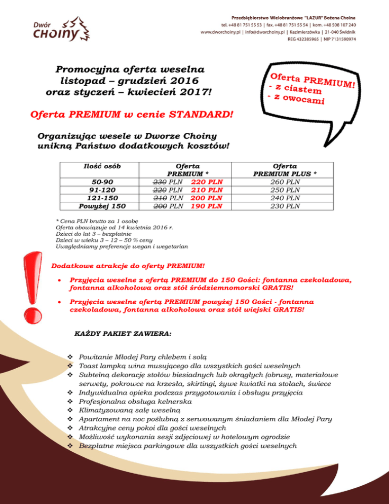 Promocyjna oferta weselna listopad – grudzień 2016 oraz styczeń – kwiecień 2017! Oferta PREMIUM w cenie STANDARD! Organizując wesele w Dworze Choiny unikną Państwo dodatkowych kosztów! Ilość osób 50-90 91-120 121-150 Powyżej 150 Oferta PREMIUM * 230 PLN 220 PLN 220 PLN 210 PLN 210 PLN 200 PLN 200 PLN 190 PLN Oferta PREMIUM PLUS * 260 PLN 250 PLN 240 PLN 230 PLN * Cena PLN brutto za 1 osobę Oferta obowiązuje od 14 kwietnia 2016 r. Dzieci do lat 3 – bezpłatnie Dzieci w wieku 3 – 12 – 50 % ceny Uwzględniamy preferencje wegan i wegetarian Dodatkowe atrakcje do oferty PREMIUM! Przyjęcia weselne z ofertą PREMIUM do 150 Gości: fontanna czekoladowa, fontanna alkoholowa oraz stół śródziemnomorski GRATIS! Przyjęcia weselne ofertą PREMIUM powyżej 150 Gości - fontanna czekoladowa, fontanna alkoholowa oraz stół wiejski GRATIS! KAŻDY PAKIET ZAWIERA: Powitanie Młodej Pary chlebem i solą Toast lampką wina musującego dla wszystkich gości weselnych Subtelną dekorację stołów biesiadnych lub okrągłych (obrusy, materiałowe serwety, pokrowce na krzesła, skirtingi, żywe kwiatki na stołach, świece Indywidualna opieka podczas przygotowania i obsługu przyjęcia Profesjonalna obsługa kelnerska Klimatyzowaną salę weselną Apartament na noc poślubną z serwowanym śniadaniem dla Młodej Pary Atrakcyjne ceny pokoi dla gości weselnych Możliwość wykonania sesji zdjęciowej w hotelowym ogrodzie Bezpłatne miejsca parkingowe dla wszystkich gości weselnych PAKIET PREMIUM: Zupa Danie główne Deser 4 przekąski gorące 15 rodzajów przekąsek zimnych w tym sałatki – bez limitu Owoce – bez limitu Różnorodne ciasto– bez limitu Napoje gorące (kawa, herbata) – bez limitu Napoje zimne gazowane (Pepsi, Mirinda, 7-up) – bez limitu Soki owocowe (pomarańcza, grapefruit, jabłko) – bez limitu Woda mineralna (gazowana, niegazowana) – bez limitu Apartament na noc poślubną z serwowanym śniadaniem dla Młodej Pary PAKIET PREMIUM PLUS: Zupa Danie główne Deser 4 przekąski gorące 15 rodzajów przekąsek zimnych w tym sałatki – bez limitu Owoce – bez limitu Różnorodne ciasto– bez limitu Fontanna czekolady – bez limitu Fontanna ponczu – bez limitu Tort z dekoracją śmietanową, czekoladową lub marcepanową Alkohol na przyjęcie weselne (do wyboru: „Pan Tadeusz”, „Wyborowa” „Żołądkowa gorzka” lub do ustalenia indywidualnego wg sugestii Młodej Pary) Napoje gorące (kawa, herbata) – bez limitu Napoje zimne gazowane (Pepsi, Mirinda, 7-up) – bez limitu Soki owocowe (pomarańcza, grapefruit, jabłko) – bez limitu Woda mineralna (gazowana, niegazowana) – bez limitu USŁUGI DODATKOWO PŁATNE: Koktajl powitalny lub mini przekąski dla gości oczekujących na Młodą Parę (cena do uzgodnienia indywidualnego) Dekoracje kwiatowe stołów (cena do uzgodnienia indywidualnego) Gościńce (6 rodzajów ciasta); cena: 10 PLN / szt. Wiejski stół (udziec wieprzowy pieczony lub indyk faszerowany; szynka wieprzowa, boczek pieczony lub wędzony, żeberka wędzone, kiełbasa, salcesony, pasztet domowy, kaszanka z kaszą gryczaną, smalec domowy, ogórki kiszone, pikle, chrzan, musztarda, chleby i bułki); cena: 100-120 os. – 1200 PLN, 120-200 os. – 1800 PLN Stół rybny (zawiera: ryba faszerowana do wyboru: sum, jesiotr, szczupak, łosoś; rolady rybne: karp, pstrąg; ryba wędzona, surimi, raki, krewetki, tymbaliki rybne, żabnica); cena: do 120 os. 1800 PLN, powyżej 120 osób 2300 PLN Stół śródziemnomorski (oryginalne sery, szynki i wędliny dojrzewające, oliwki, karczochy, voulevanty, koreczki, suszone pomidory, sosy słodko-pikantne, winogrona, orzechy) cena: do 50 osób – 650 PLN Pieczone prosię (do 120 osób cena: 1500 PLN; powyżej 120 os. 1800 PLN) Udziec wieprzowy pieczony; cena: 10 PLN / os. Kozina pieczona (cena do uzgodnienia indywidualnego) Dzik pieczony (cena do uzgodnienia indywidualnego) Fontanna czekolady (czekolada, owoce, mini ciasteczka); cena: 10 PLN / os. Fontanna alkoholowa (kolorowy poncz); cena 1000 PLN Przygotowanie i obsługa open baru; cena: 1000 PLN Piwo beczkowe 30 l; cena: 300 PLN Piwo beczkowe 50l; cena: 500 PLN Beczka wina domowego 3 l (białe, czerwone); cena: 120 PLN Pokazy sztucznych ogni; ok. 5 min. cena od 1800 PLN