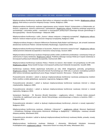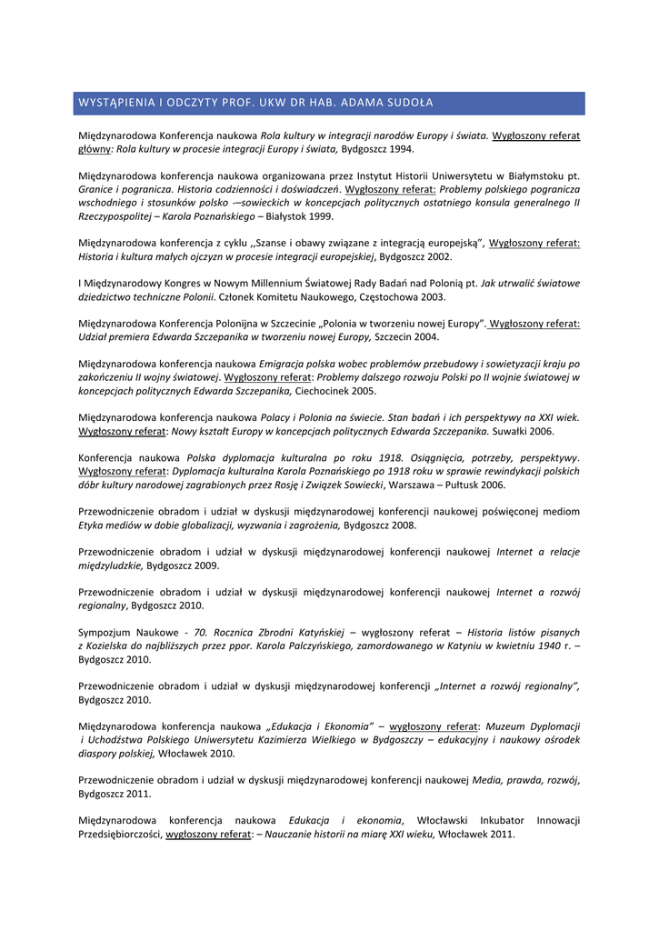 WYSTĄPIENIA I ODCZYTY PROF. UKW DR HAB. ADAMA SUDOŁA Międzynarodowa Konferencja naukowa Rola kultury w integracji narodów Europy i świata. Wygłoszony referat główny: Rola kultury w procesie integracji Europy i świata, Bydgoszcz 1994. Międzynarodowa konferencja naukowa organizowana przez Instytut Historii Uniwersytetu w Białymstoku pt. Granice i pogranicza. Historia codzienności i doświadczeń. Wygłoszony referat: Problemy polskiego pogranicza wschodniego i stosunków polsko -–sowieckich w koncepcjach politycznych ostatniego konsula generalnego II Rzeczypospolitej – Karola Poznańskiego – Białystok 1999. Międzynarodowa konferencja z cyklu ,,Szanse i obawy związane z integracją europejską”, Wygłoszony referat: Historia i kultura małych ojczyzn w procesie integracji europejskiej, Bydgoszcz 2002. I Międzynarodowy Kongres w Nowym Millennium Światowej Rady Badań nad Polonią pt. Jak utrwalić światowe dziedzictwo techniczne Polonii. Członek Komitetu Naukowego, Częstochowa 2003. Międzynarodowa Konferencja Polonijna w Szczecinie „Polonia w tworzeniu nowej Europy”. Wygłoszony referat: Udział premiera Edwarda Szczepanika w tworzeniu nowej Europy, Szczecin 2004. Międzynarodowa konferencja naukowa Emigracja polska wobec problemów przebudowy i sowietyzacji kraju po zakończeniu II wojny światowej. Wygłoszony referat: Problemy dalszego rozwoju Polski po II wojnie światowej w koncepcjach politycznych Edwarda Szczepanika, Ciechocinek 2005. Międzynarodowa konferencja naukowa Polacy i Polonia na świecie. Stan badań i ich perspektywy na XXI wiek. Wygłoszony referat: Nowy kształt Europy w koncepcjach politycznych Edwarda Szczepanika. Suwałki 2006. Konferencja naukowa Polska dyplomacja kulturalna po roku 1918. Osiągnięcia, potrzeby, perspektywy. Wygłoszony referat: Dyplomacja kulturalna Karola Poznańskiego po 1918 roku w sprawie rewindykacji polskich dóbr kultury narodowej zagrabionych przez Rosję i Związek Sowiecki, Warszawa – Pułtusk 2006. Przewodniczenie obradom i udział w dyskusji międzynarodowej konferencji naukowej poświęconej mediom Etyka mediów w dobie globalizacji, wyzwania i zagrożenia, Bydgoszcz 2008. Przewodniczenie obradom i udział w dyskusji międzynarodowej konferencji naukowej Internet a relacje międzyludzkie, Bydgoszcz 2009. Przewodniczenie obradom i udział w dyskusji międzynarodowej konferencji naukowej Internet a rozwój regionalny, Bydgoszcz 2010. Sympozjum Naukowe - 70. Rocznica Zbrodni Katyńskiej – wygłoszony referat – Historia listów pisanych z Kozielska do najbliższych przez ppor. Karola Palczyńskiego, zamordowanego w Katyniu w kwietniu 1940 r. – Bydgoszcz 2010. Przewodniczenie obradom i udział w dyskusji międzynarodowej konferencji „Internet a rozwój regionalny”, Bydgoszcz 2010. Międzynarodowa konferencja naukowa „Edukacja i Ekonomia” – wygłoszony referat: Muzeum Dyplomacji i Uchodźstwa Polskiego Uniwersytetu Kazimierza Wielkiego w Bydgoszczy – edukacyjny i naukowy ośrodek diaspory polskiej, Włocławek 2010. Przewodniczenie obradom i udział w dyskusji międzynarodowej konferencji naukowej Media, prawda, rozwój, Bydgoszcz 2011. Międzynarodowa konferencja naukowa Edukacja i ekonomia, Włocławski Inkubator Przedsiębiorczości, wygłoszony referat: – Nauczanie historii na miarę XXI wieku, Włocławek 2011. Innowacji Współorganizator pobytu przedstawicieli państw Unii Europejskiej (Litwa) i państw pozaeuropejskich (Kazachstan, Kongo) oraz grupa dyplomatów, wśród nich dr Dariusz Wiśniewski, Ambasador Paweł Cieplak, dr Krzysztof Szczepanik, Radca – minister dr Bogdan Wrzochalski. Grupie dyplomatów towarzyszyły osoby uczestniczące w doskonaleniu, prowadzonym przez Centrum Rozwoju Zawodowego Ministerstwa Spraw Zagranicznych RP. Wygłoszenie referatu „Upominki w świecie dyplomacji”, luty 2012 Udział w Konferencji Międzynarodowej Prezydenci i Rządy Rzeczypospolitej na Uchodźstwie w walce o niepodległą Polskę w latach 1939-1990, organizowanej przez Polski Uniwersytet na Obczyźnie i Uniwersytet Jagielloński. Wygłoszony referat pt. Wkład rządu RP na uchodźstwie do procesu podtrzymywania i utrwalania tożsamości narodowej Polaków (1939-1990) – Londyn 2012 Konflikt – kryzys – wojna. Bezpieczeństwo w perspektywie globalnej i regionalnej, wygłoszony referat: Ochrona i bezpieczeństwo zasobów muzealnych w Polsce, Runowo 9-10.04.2013 r. Społeczne oblicza Europy XXI wieku. Międzynarodowe sympozjum naukowe, wygłoszony referat Polska służba i dyplomacja konsularna na rzecz migrantów polskich w państwach Europy, Piła 20-21.11.2014 Wojskowość na przełomie XX i XXI wieku. Znaczenie czynnika militarnego w środowisku międzynarodowym", wygłoszony referat Wojskowość w życiu i działalności Edwarda Szczepanika – dyplomaty, ostatniego premiera Rządu RP na Uchodźstwie, Ostromecko 20-21 października 2015 r.