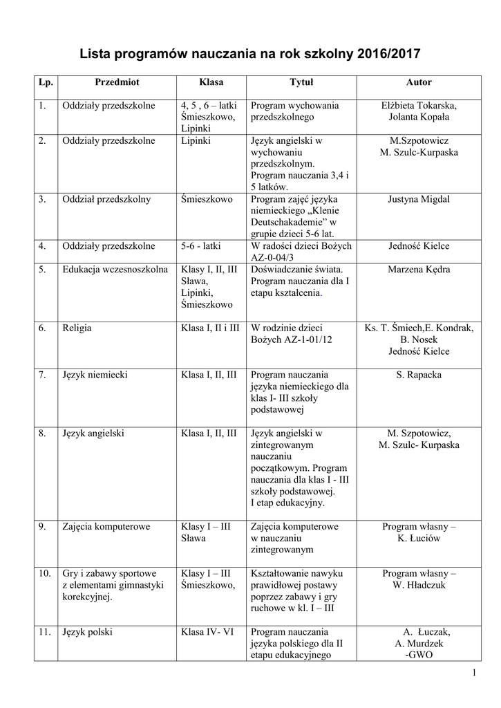 Lista programów nauczania na rok szkolny 2016/2017 Lp. Przedmiot Klasa Tytuł Autor 1. Oddziały przedszkolne 2. Oddziały przedszkolne 4, 5 , 6 – latki Śmieszkowo, Lipinki Lipinki Program wychowania przedszkolnego Elżbieta Tokarska, Jolanta Kopała Język angielski w wychowaniu przedszkolnym. Program nauczania 3,4 i 5 latków. Program zajęć języka niemieckiego „Klenie Deutschakademie” w grupie dzieci 5-6 lat. W radości dzieci Bożych AZ-0-04/3 Doświadczanie świata. Program nauczania dla I etapu kształcenia. M.Szpotowicz M. Szulc-Kurpaska 3. Oddział przedszkolny Śmieszkowo 4. Oddziały przedszkolne 5-6 - latki 5. Edukacja wczesnoszkolna Klasy I, II, III Sława, Lipinki, Śmieszkowo 6. Religia Klasa I, II i III W rodzinie dzieci Bożych AZ-1-01/12 7. Język niemiecki Klasa I, II, III Program nauczania języka niemieckiego dla klas I- III szkoły podstawowej S. Rapacka 8. Język angielski Klasa I, II, III Język angielski w zintegrowanym nauczaniu początkowym. Program nauczania dla klas I - III szkoły podstawowej. I etap edukacyjny. M. Szpotowicz, M. Szulc- Kurpaska 9. Zajęcia komputerowe Klasy I – III Sława Zajęcia komputerowe w nauczaniu zintegrowanym Program własny – K. Łuciów 10. Gry i zabawy sportowe z elementami gimnastyki korekcyjnej. Klasy I – III Śmieszkowo, Kształtowanie nawyku prawidłowej postawy poprzez zabawy i gry ruchowe w kl. I – III Program własny – W. Hładczuk 11. Język polski Klasa IV- VI Program nauczania języka polskiego dla II etapu edukacyjnego Justyna Migdal Jedność Kielce Marzena Kędra Ks. T. Śmiech,E. Kondrak, B. Nosek Jedność Kielce A. Łuczak, A. Murdzek -GWO 1 „Między nami”. 12. Plastyka Klasa IV-V Do dzieła! 13. Plastyka Klasy VI Plastyka- program do kl. IV-VI 14. Etyka Klasy I - VI Ludzkie ścieżki – kompleksowy program nauczania etyki. 15. Historia Klasa IV-VI Program nauczania ogólnego historii i społeczeństwa. 16. Język angielski Klasa IV-VI Program nauczania języka angielskiego. Kurs dla klas 4 – 6 szkoły podstawowej. II etap edukacyjny Melanie Ellis, Anna Rak - Oxford 17. Język niemiecki Klasa IV-VI Program nauczania dla klas IV – VI szkoły podstawowej. Kurs dla początkujących. A. Potapowicz - WSiP 18. Przyroda Klasa IV-VI Program nauczania przyrody w klasach IVVI „Przyrodo witaj!” E. Gromek, E. Kłos, W. Kofta, E. Laskowska, A. Melson - WSiP 19. Religia Klasa IV-VI Program nauczania religii „Poznaję Boga i Niego wierzę”; Nr AZ-2-01/10 z 09.06.2010 r. 20. Zajęcia komputerowe Klasy IV - VI Informatyka Europejczyka. Program nauczania informatyki w szkole podstawowej, kl. IV-VI. DKOS-5002-38/05 21. Wychowanie fizyczne Klasa IV-VI Koncepcja edukacji fizycznej. Zdrowie. Sport. Rekreacja. Szkoła podstawowa klasy IV-VI. Urszula Kierczak Impuls 22. Muzyka Klasy IV-VI Program nauczania muzyki do nowej I. Pisarkiewicz - WSiP Nowa Era Beata Mikulik -WSiP Anna Ziemska, Łukasz Malinowski Tomasz Maćkowski -Nowa Era Ks. J. Szpet, P. Jackowiak - Księgarnia Św. Wojciecha Poznań Wyd. Helion Edukacja 2 podstawy programowej M. Jucewicz, M. Karpiński, Jacek Lech - Gdańskie Wydawnictwo Oświatowe 23. Matematyka Klasy IV-VI Matematyka z plusem. Program nauczania matematyki dla drugiego etapu edukacyjnego (klasy IV- VI szkoły podstawowej) 24. Zajęcia techniczne Klasy IV-VI Nauczanie techniki w szkole podstawowej W. Czyżewski 25. Wychowanie do życia w rodzinie Klasy V-VI Wędrując ku dorosłości T. Król, K. Maśnik, G. Węglarczyk 26. Zajęcia korekcyjnokompensacyjne Oddział przedszkolny Program zajęć korekcyjnokompensacyjnych dla dzieci z oddziału przedszkolnego. Program własny – Halina Nowak 27. Zajęcia korekcyjno -kompensacyjne Klasy I - III Program zajęć korekcyjnokompensacyjnych dla klas I – III Program własny – Halina Nowak 28. Zajęcia korekcyjnokompensacyjne Klasy IV-VI Program zajęć korekcyjnokompensacyjnych dla klas IV-VI Program własny – Halina Nowak 29. Zajęcia korekcyjnokompensacyjne Klasy I-VI Program zajęć korekcyjnokompensacyjnych dla uczniów z upośledzonych w stopniu lekkim Program własny – Halina Nowak 30. Zajęcia logopedyczne Klasy I - VI Terapia dziecka z zaburzoną artykulacją głosek. Program własny Ewa Chojnacka Szkolna lista programów została pozytywnie zaopiniowana przez Radę Pedagogiczną .06. 2016 r. 3