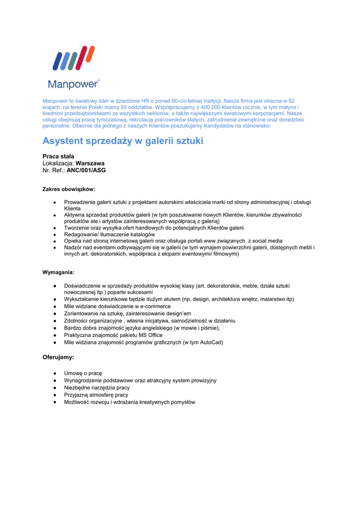 Manpower to światowy lider w dziedzinie HR o ponad 60-cio letniej tradycji. Nasza firma jest obecna w 82 krajach, na terenie Polski mamy 50 oddziałów. Współpracujemy z 400 000 klientów rocznie, w tym małymi i średnimi przedsiębiorstwami ze wszystkich sektorów, a także największymi światowymi korporacjami. Nasze usługi obejmują pracę tymczasową, rekrutację pracowników stałych, zatrudnienie zewnętrzne oraz doradztwo personalne. Obecnie dla jednego z naszych Klientów poszukujemy Kandydatów na stanowisko: Asystent sprzedaży w galerii sztuki Praca stała Lokalizacja: Warszawa Nr. Ref.: ANC/001/ASG Zakres obowiązków: Prowadzenie galerii sztuki z projektami autorskimi właściciela marki od strony administracyjnej i obsługi Klienta Aktywna sprzedaż produktów galerii (w tym poszukiwanie nowych Klientów, kierunków zbywalności produktów ale i artystów zainteresowanych współpracą z galerią) Tworzenie oraz wysyłka ofert handlowych do potencjalnych Klientów galerii Redagowanie/ tłumaczenie katalogów Opieka nad stroną internetową galerii oraz obsługa portali www związanych z social media Nadzór nad eventami odbywającymi się w galerii (w tym wynajem powierzchni galerii, dostępnych mebli i innych art. dekoratorskich, współpraca z ekipami eventowymi/ filmowymi) Wymagania: Doświadczenie w sprzedaży produktów wysokiej klasy (art. dekoratorskie, meble, działa sztuki nowoczesnej itp.) poparte sukcesami Wykształcenie kierunkowe będzie dużym atutem (np. design, architektura wnętrz, malarstwo itp) Mile widziane doświadczenie w e-commerce Zorientowanie na sztukę, zainteresowanie design’em Zdolności organizacyjne , własna inicjatywa, samodzielność w działaniu Bardzo dobra znajomość języka angielskiego (w mowie i piśmie), Praktyczna znajomość pakietu MS Office Mile widziana znajomość programów graficznych (w tym AutoCad) Oferujemy: Umowę o pracę Wynagrodzenie podstawowe oraz atrakcyjny system prowizyjny Niezbędne narzędzia pracy Przyjazną atmosferę pracy Możliwość rozwoju i wdrażania kreatywnych pomysłów