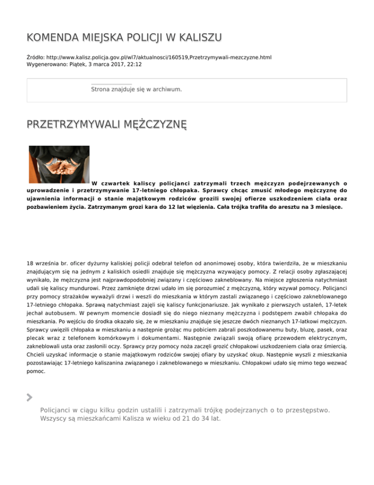 KOMENDA MIEJSKA POLICJI W KALISZU Źródło: http://www.kalisz.policja.gov.pl/wl7/aktualnosci/160519,Przetrzymywali-mezczyzne.html Wygenerowano: Piątek, 3 marca 2017, 22:12 Strona znajduje się w archiwum. PRZETRZYMYWALI MĘŻCZYZNĘ W czwartek kaliscy policjanci zatrzymali trzech mężczyzn podejrzewanych o uprowadzenie i przetrzymywanie 17-letniego chłopaka. Sprawcy chcąc zmusić młodego mężczyznę do ujawnienia informacji o stanie majątkowym rodziców grozili swojej ofierze uszkodzeniem ciała oraz pozbawieniem życia. Zatrzymanym grozi kara do 12 lat więzienia. Cała trójka trafiła do aresztu na 3 miesiące. 18 września br. oficer dyżurny kaliskiej policji odebrał telefon od anonimowej osoby, która twierdziła, że w mieszkaniu znajdującym się na jednym z kaliskich osiedli znajduje się mężczyzna wzywający pomocy. Z relacji osoby zgłaszającej wynikało, że mężczyzna jest najprawdopodobniej związany i częściowo zakneblowany. Na miejsce zgłoszenia natychmiast udali się kaliscy mundurowi. Przez zamknięte drzwi udało im się porozumieć z mężczyzną, który wzywał pomocy. Policjanci przy pomocy strażaków wyważyli drzwi i weszli do mieszkania w którym zastali związanego i częściowo zakneblowanego 17-letniego chłopaka. Sprawą natychmiast zajęli się kaliscy funkcjonariusze. Jak wynikało z pierwszych ustaleń, 17-letek jechał autobusem. W pewnym momencie dosiadł się do niego nieznany mężczyzna i podstępem zwabił chłopaka do mieszkania. Po wejściu do środka okazało się, że w mieszkaniu znajduje się jeszcze dwóch nieznanych 17-latkowi mężczyzn. Sprawcy uwięzili chłopaka w mieszkaniu a następnie grożąc mu pobiciem zabrali poszkodowanemu buty, bluzę, pasek, oraz plecak wraz z telefonem komórkowym i dokumentami. Następnie związali swoją ofiarę przewodem elektrycznym, zakneblowali usta oraz zasłonili oczy. Sprawcy przy pomocy noża zaczęli grozić chłopakowi uszkodzeniem ciała oraz śmiercią. Chcieli uzyskać informacje o stanie majątkowym rodziców swojej ofiary by uzyskać okup. Następnie wyszli z mieszkania pozostawiając 17-letniego kaliszanina związanego i zakneblowanego w mieszkaniu. Chłopakowi udało się mimo tego wezwać pomoc. Policjanci w ciągu kilku godzin ustalili i zatrzymali trójkę podejrzanych o to przestępstwo. Wszyscy są mieszkańcami Kalisza w wieku od 21 do 34 lat. Następnego dnia podejrzani usłyszeli zarzuty m.in. pozbawienia wolności ze szczególnym udręczeniem. Sąd Rejonowy w Kaliszu zastosował wobec całej trójki środek zapobiegawczy w postaci tymczasowego aresztu. Mogą trafić za kratki nawet na 12 lat. Śledztwo w tej sprawie prowadzi Komenda Miejska Policji w Kaliszu pod nadzorem Prokuratury Rejonowej w Kaliszu. Ocena: 0/5 (0) Tweetnij
