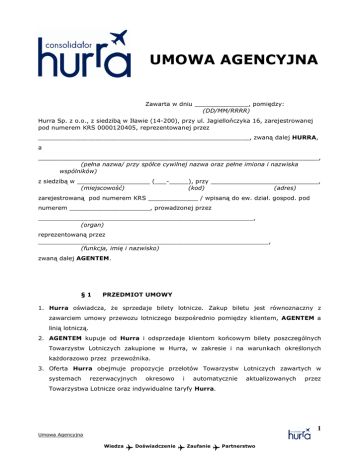 UMOWA AGENCYJNA Zawarta w dniu ______________, pomiędzy: (DD/MM/RRRR) Hurra Sp. z o.o., z siedzibą w Iławie (14-200), przy ul. Jagiellończyka 16, zarejestrowanej pod numerem KRS 0000120405, reprezentowanej przez _______________________________________________________, zwaną dalej HURRA, a _________________________________________________________________________, (pełna nazwa/ przy spółce cywilnej nazwa oraz pełne imiona i nazwiska wspólników) z siedzibą w ___________________ (___-_____), przy ____________________________, (miejscowość) (kod) (adres) zarejestrowaną pod numerem KRS _____________ / wpisaną do ew. dział. gospod. pod numerem _____________________, prowadzonej przez ________________________________________________________, (organ) reprezentowaną przez ____________________________________________________________, (funkcja, imię i nazwisko) zwaną dalej AGENTEM. §1 PRZEDMIOT UMOWY 1. Hurra oświadcza, że sprzedaje bilety lotnicze. Zakup biletu jest równoznaczny z zawarciem umowy przewozu lotniczego bezpośrednio pomiędzy klientem, AGENTEM a linią lotniczą. 2. AGENTEM kupuje od Hurra i odsprzedaje klientom końcowym bilety poszczególnych Towarzystw Lotniczych zakupione w Hurra, w zakresie i na warunkach określonych każdorazowo przez przewoźnika. 3. Oferta Hurra obejmuje propozycje przelotów Towarzystw Lotniczych zawartych w systemach rezerwacyjnych okresowo i automatycznie aktualizowanych przez Towarzystwa Lotnicze oraz indywidualne taryfy Hurra. 1 Umowa Agencyjna Wiedza Doświadczenie Zaufanie Partnerstwo §2 OBOWIĄZKI HURRA 1. Hurra świadczy na rzecz Agenta usługę sprzedaży biletów lotniczch klientom pozyskanym przez Agenta. 2. Hurra będzie informowała Agenta o zmianach dotyczących ofert oraz o wszelkich promocjach mailem na adres ……………………………………………….. 3. Hurra zobowiązuje się dokonywać swoich działań ze starannością dobrego kupca, strzec interesów Agenta i zachować w poufności swoją współpracę z nim. 4. Hurra zastrzega sobie prawo do wystawiania biletów lotniczych pod różnymi numerami IATA, w szczególności na wyloty z innych krajów niż Polska, zawsze z korzyścią dla Agenta. §3 OBOWIĄZKI AGENTA 1. Agent zobowiązuje się dokonywać swoich działań ze starannością dobrego kupca, strzec interesów Hurra i zachować w poufności swoją współpracę z nim. 2. Agent ponosi pełną odpowiedzialność za dokonane rezerwacje oraz za sprzedaż biletów lotniczych po stosownym potwierdzeniu. 3. Agent zobowiązuje się do należytego przestrzegania warunków dokonywania rezerwacji, zgłaszania ich do wystawienia w terminie zgodnym z warunkami taryfy oraz sprzedaży biletów lotniczych zgodnie z warunkami określonymi przez przewoźnika. 4. Agent w żaden sposób nie zmieni ani nie zmodyfikuje warunków ustalonych w jakimkolwiek dokumencie przewozowym Przewoźnika. 5. Wszelkie roszczenia oraz reklamacje pochodzące od Agenta lub jego klienta będą bezpośrednio kierowane do odpowiedniego Towarzystwa Lotniczego, chyba, że będą one dotyczyły zaniedbań lub niedopełnienia umowy ze strony Hurra. 6. Agent zobowiązuje się nie podejmować żadnych działań powodujących lub mogących powodować powstanie zobowiązań finansowych po stronie Hurra, czy też narażających Hurra na odpowiedzialność cywilną, karno – skarbową czy karną. 7. Agent zobowiązuje się niezwłocznie informować Hurra o wszelkich zmianach struktury własnościowej, formy prawnej w prowadzonej przez niego działalności, wszczęciu w stosunku do niego postępowania upadłościowego lub postawienia w stan likwidacji. §4 DOKONYWANIE REZERWACJI 1. W celu dokonania rezerwacji, sprawdzenia cen, dostępności oraz zakupu biletu Agent korzystać będzie z systemów rezerwacji i sprzedaży biletów lotniczych (np. Systemy CRS, IBE lub inne). 2. Agent może zlecić dokonanie rezerwacji drogą mailowa, faxem lub telefonicznie za dodatkową opłatą, podając wymagane dane do jej założenia. Rezerwacje będą potwierdzone systemowo pocztą elektroniczną. 3. Publikowana lista cen i taryf linii lotniczych dostępna po zalogowaniu traktowana jest jako poufny element współpracy Agenta z Hurra. 2 Umowa Agencyjna Wiedza Doświadczenie Zaufanie Partnerstwo 4. Agent może również dokonywać rezerwacji poprzez systemy rezerwacyjne (Amadeus, Galileo, Sabre) zgodnie z obowiązującymi przepisami Towarzystw Lotniczych i przesłać ją do wystawienia na adres Hurra: Amadeus: QYOPQ2104 - QE 29 Galileo: 3AX5 - QE 30 Sabre: DM57 – QE 10 5. Agent ma obowiązek zgłosić zlecenie wystawienia biletu lub jego anulację drogą mailową lub faxem zgodnie z terminem Ticketingu, widocznym w systemach CRS a w przypadku rezerwacji dokonywanej w IBE, majlem, faksem lub telefonicznie - w potwierdzeniu rezerwacji przesłanym przez Hurra w godzinach pracy Hurra, to jest w dni powszednie w godzinach od 9 do 18:45, a w soboty w godzinach od 10 do 13:45. 6. W przypadku wystawienia biletu Agent ma obowiązek potwierdzić informację o cenie biletu wraz ze wszystkimi opłatami dodatkowymi. 7. Zarezerwowany bilet należy wykupić w terminie określonym w taryfach i warunkach zakupu biletu. W przypadku gdy wystawienie biletu elektronicznego nie będzie możliwe, to odbiór biletu może nastąpić na lotnisku wylotowym na terenie Polski lub innego kraju za dodatkową opłatą pobieraną przez przewoźnika tzw. PTA. 8. Agent zobowiązany jest dostarczyć każdemu pasażerowi „Warunki przewozu i inne ważne postanowienia” („Conditions of Contract”) ustalone przez IATA do biletów i MPD, w przypadku gdy teksty nie są zawarte w drukach biletowych (ETIX). Treść dokumentu w języku polskim i angielskim znajduje się na stronie www.hurra.pl oraz na oficjalnej stronie internetowej IATA (Customer Portal Europe - wybor: "Document Form Center" wybor kategorii: Resolutions & other useful information ). W przypadku nie dołączenia przez Agent „Con