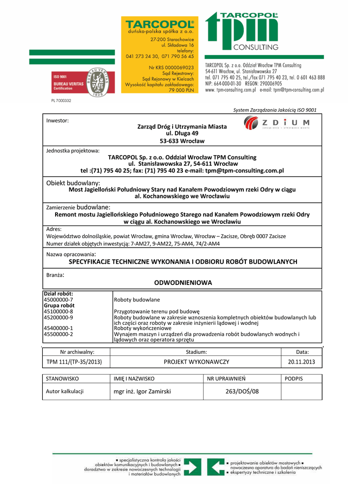 Obiekt budowlany: : SPECYFIKACJE TECHNICZNE WYKONANIA I