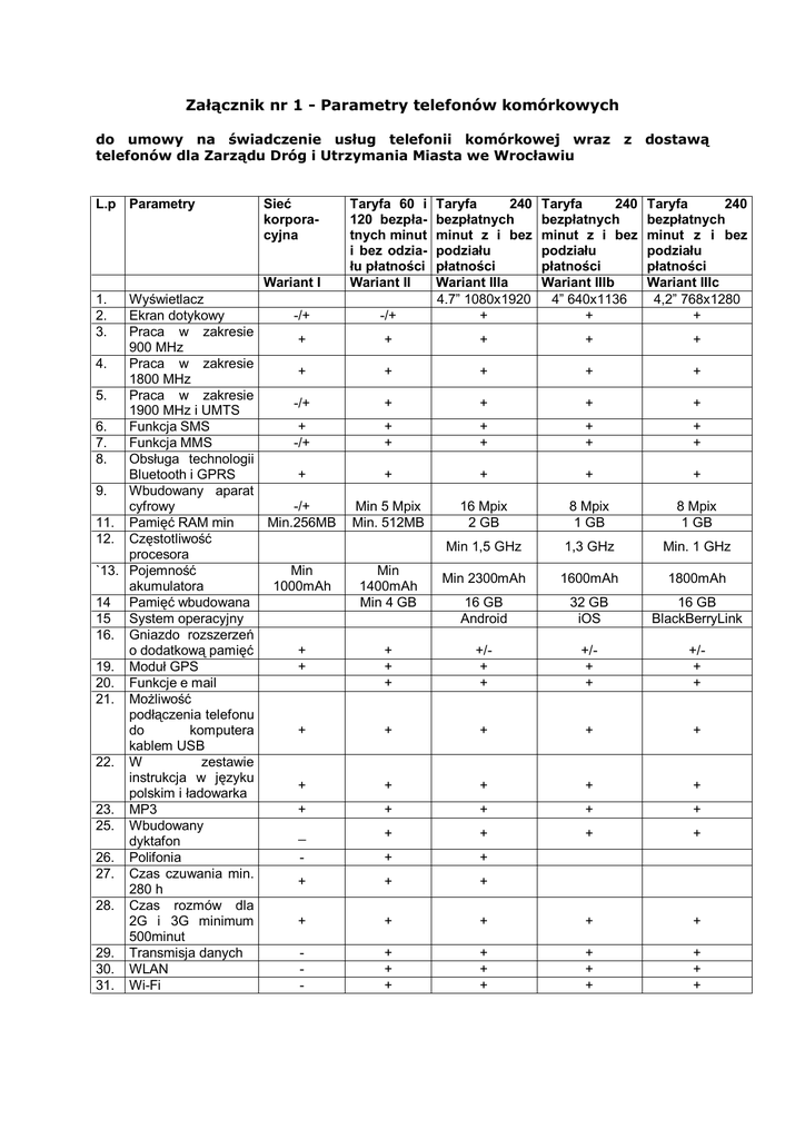 Załącznik nr 1 - Parametry telefonów komórkowych do umowy na świadczenie usług telefonii komórkowej wraz z dostawą telefonów dla Zarządu Dróg i Utrzymania Miasta we Wrocławiu L.p Parametry Sieć korporacyjna Wariant I Wyświetlacz Ekran dotykowy -/+ Praca w zakresie + 900 MHz 4. Praca w zakresie + 1800 MHz 5. Praca w zakresie -/+ 1900 MHz i UMTS 6. Funkcja SMS + 7. Funkcja MMS -/+ 8. Obsługa technologii Bluetooth i GPRS + 9. Wbudowany aparat cyfrowy -/+ 11. Pamięć RAM min Min.256MB 12. Częstotliwość procesora `13. Pojemność Min akumulatora 1000mAh 14 Pamięć wbudowana 15 System operacyjny 16. Gniazdo rozszerzeń o dodatkową pamięć + 19. Moduł GPS + 20. Funkcje e mail 21. Możliwość podłączenia telefonu do komputera + kablem USB 22. W zestawie instrukcja w języku + polskim i ładowarka 23. MP3 + 25. Wbudowany _ dyktafon 26. Polifonia 27. Czas czuwania min. + 280 h 28. Czas rozmów dla 2G i 3G minimum + 500minut 29. Transmisja danych 30. WLAN 31. Wi-Fi 1. 2. 3. Taryfa 60 i 120 bezpłatnych minut i bez odziału płatności Wariant II -/+ Taryfa 240 bezpłatnych minut z i bez podziału płatności Wariant IIIa 4.7” 1080x1920 + Taryfa 240 bezpłatnych minut z i bez podziału płatności Wariant IIIb 4” 640x1136 + Taryfa 240 bezpłatnych minut z i bez podziału płatności Wariant IIIc 4,2” 768x1280 + + + + + + + + + + + + + + + + + + + + + + + + + Min 5 Mpix Min. 512MB 16 Mpix 2 GB 8 Mpix 1 GB 8 Mpix 1 GB Min 1,5 GHz 1,3 GHz Min. 1 GHz Min 2300mAh 1600mAh 1800mAh 16 GB Android 32 GB iOS 16 GB BlackBerryLink + + + +/+ + +/+ + +/+ + + + + + + + + + + + + + + + + + + + + + + + + + + + + + + + + + + + + + Min 1400mAh Min 4 GB