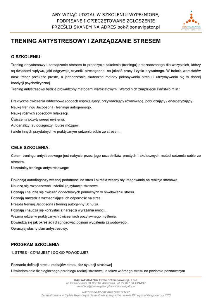 TRENING ANTYSTRESOWY I ZARZĄDZANIE STRESEM O SZKOLENIU: Trening antystresowy i zarządzanie stresem to propozycja szkolenia (treningu) przeznaczonego dla wszystkich, którzy są świadomi wpływu, jaki odgrywają czynniki stresogenne, na jakość pracy i życia prywatnego. W trakcie warsztatów nasz trener przekaże proste, a jednocześnie skuteczne metody pokonywania stresu i utrzymywania się w dobrej kondycji psychofizycznej. Trening antystresowy będzie prowadzony metodami warsztatowymi. Wśród nich znajdziecie Państwo m.in.: Praktyczne ćwiczenia oddechowe (oddech uspokajający, przywracający równowagę, pobudzający / energetyzujący. Naukę treningu Jacobsona i treningu autogennego. Naukę różnych sposobów relaksacji. Ćwiczenia pozytywnego myślenia. Autoanalizy, autodiagnozy i burze mózgów. i wiele innych przydatnych w praktycznym radzeniu sobie ze stresem. CELE SZKOLENIA: Celem treningu antystresowego jest nabycie przez jego uczestników prostych i skutecznych metod radzenia sobie ze stresem. Uczestnicy treningu antystresowego: Dokonają autodiagnozy własnej podatności na stres i określą własny styl reagowania na reakcje stresowe. Nauczą się rozpoznawać i zdefiniują sytuacje stresowe. Poznają i nauczą się ćwiczeń oddechowych pomocnych w niwelowaniu stresu. Poznają narzędzia wzmacniające ich odporność na stres. Przejdą trening Jacobsona i trening autogenny Schulza. Poznają i nauczą się korzystać z narzędzi wyrażania emocji. Wezmą udział w praktycznych ćwiczeniach pozytywnego myślenia. Dowiedzą się jak określać i diagnozować poziom wypalenia zawodowego. Opracują własny plan antystresowy. PROGRAM SZKOLENIA: 1. STRES - CZYM JEST I CO GO POWODUJE? Poznanie definicji stresu, rodzajów stresu, faz sytuacji stresowej Uświadomienie fizjologicznego przebiegu reakcji stresowej, a także wtórnego stresu na poziomie poznawczym B&O NAVIGATOR Firma Szkoleniowa Sp. z o.o. ul. Czarnocińska 31 03-110 Warszawa, tel. 22 877 38 43/44/47 email:[email protected] www.bonavigator.pl NIP:527-24-12-682 KRS:0000171497 Zarejestrowana w Sądzie Rejonowym dla m.st Warszawy w Warszawie XIII wydział Gospodarczy KRS Poznanie własnego stylu reagowania w sytuacji stresowej - kwestionariusz postaw Poznanie różnych strategii radzenia sobie ze stresem Nabycie umiejętności rozpoznawania symptomów stresu Autodiagnoza podatności na stres Uświadomienie sobie roli własnej postawy wobec stresu na poziom dbania o siebie w stresie 2. MOJA OSOBISTA POSTAWA WOBEC STRESU Umiejętność rozpoznawania różnych sytuacji stresowych Osobista odpowiedzialność za reakcję w stresie - krąg wpływu i krąg zainteresowania 3. CZTERY WYMIARY PRACY ZE STRESEM Poznanie czterech sfer pracy ze stresem (1. Ciało, 2. Myślenie, 3. Emocje. 4. Wartości – równowaga i styl życia) 4. RADZENIE SOBIE ZE STRESEM W STRESIE Oddech: Uświadomienie sobie roli oddechu w regulacji własnej reakcji stresowej Poznanie fizjologicznej funkcji oddechu w stresie Koncentracja: Poznanie procesu kierowania uwagą i koncentracji Filary odporności psychicznej: Autodiagnoza filarów odporności psychicznej Poznanie filarów odporności psychicznej Poznanie technik i przekonań wspierających odporność psychiczną 5. RADZENIE SOBIE ZE SKUTKAMI STRESU Odreagowanie: Poznanie praktycznych ćwiczeń i technik obniżających napięcie powstałe w wyniku stresu (trening Jacobsona, techniki odreagowania) Odpoczywanie: B&O NAVIGATOR Firma Szkoleniowa Sp. z o.o. ul. Czarnocińska 31 03-110 Warszawa, tel. 22 877 38 43/44/47 email:[email protected] www.bonavigator.pl NIP:527-24-12-682 KRS:0000171497 Zarejestrowana w Sądzie Rejonowym dla m.st Warszawy w Warszawie XIII wydział Gospodarczy KRS Poznanie technik relaksacji Analiza własnej postawy wobec odpoczynku Trening autogenny Schulza 6. EMOCJE I INTELIGENCJA EMOCJONALNA Poznanie definicji i natury emocji Poznanie podstawowych emocji i ich funkcji Poznanie różnych stylów reagowania w sytuacjach budzących emocje Uświadomienie sobie skutków każdej ze strategii radzenia sobie z emocjami Poznanie narzędzi umożliwiających wyrażanie emocji 7. POZNAWCZA DEFINICJA STRESU Poznanie poznawczego aspektu stresu Nauka pracy z przekonaniami Poznanie technik blokujących powracające, negatywne myśli Poznanie definicji i funkcji pozytywnego nastawienia 8. WARTOŚCI A STRES Refleksja nad wartościami w życiu i ich funkcją w radzeniu sobie ze stresem Poznanie narzędzi pomagających osiągać równowagę w życiu Styl życia a stres 9. WYPALENIE ZAWODOWE Poznanie definicji wypalenia zawodowego Poznanie czynników narażających na wypalenie zawodowe Poznanie kryteriów diagnozowania wypalenia zawodowego Świadomość roli menedżera w zarządzaniem stresem jego pracowników Autorefleksja nad narzędziami menedżera mogącymi obniżać poziom stresu 10. PODSUMOWANIE Zebranie refleksji i opracowanie własnego planu antystresowego TRENER: Joanna Szeluga B&O NAVIGATOR Firma Szkoleniowa Sp. z o.o. ul. Czarnocińska 31 03-110 Warszawa, tel. 22 877 38 43/44/47 email:[email protected] www.bonavigator.pl NIP:527-24-12-682 KRS:0000171497 Zarejestrowana w Sądzie Rejonowym dla m.st Warszawy w Warszawie XIII wydział Gospodarczy KRS Trener – Praktyk. Psycholog, specjalistka w zakresie problematyki stresu, zachowań asertywnych, radzenia sobie z wypaleniem zawodowym, rozwiązywania konfliktów, inteligencji emocjonalnej. W latach 2001 – 2009 zawodowo związana z PGE Energia Odnawialna SA gdzie była odpowiedzialna między innymi za planowanie i monitoring systemu wynagrodzeń, system motywacji pozapłacowej, politykę szkoleniową oraz rekrutację i selekcję pracowników. Równolegle od 2006 roku prowadzi szkolenia dla kadry menedżerskiej i specjalistów. Pracowała jako trener dla Novo Nordisk, Berlin Chemie, Gadu – Gadu S.A., Kredyt Bank S.A. NIK. Jest zwolenniczką prowadzenia szkoleń i treningów metodami aktywnymi, angażującymi uczestników (ćwiczenia w par