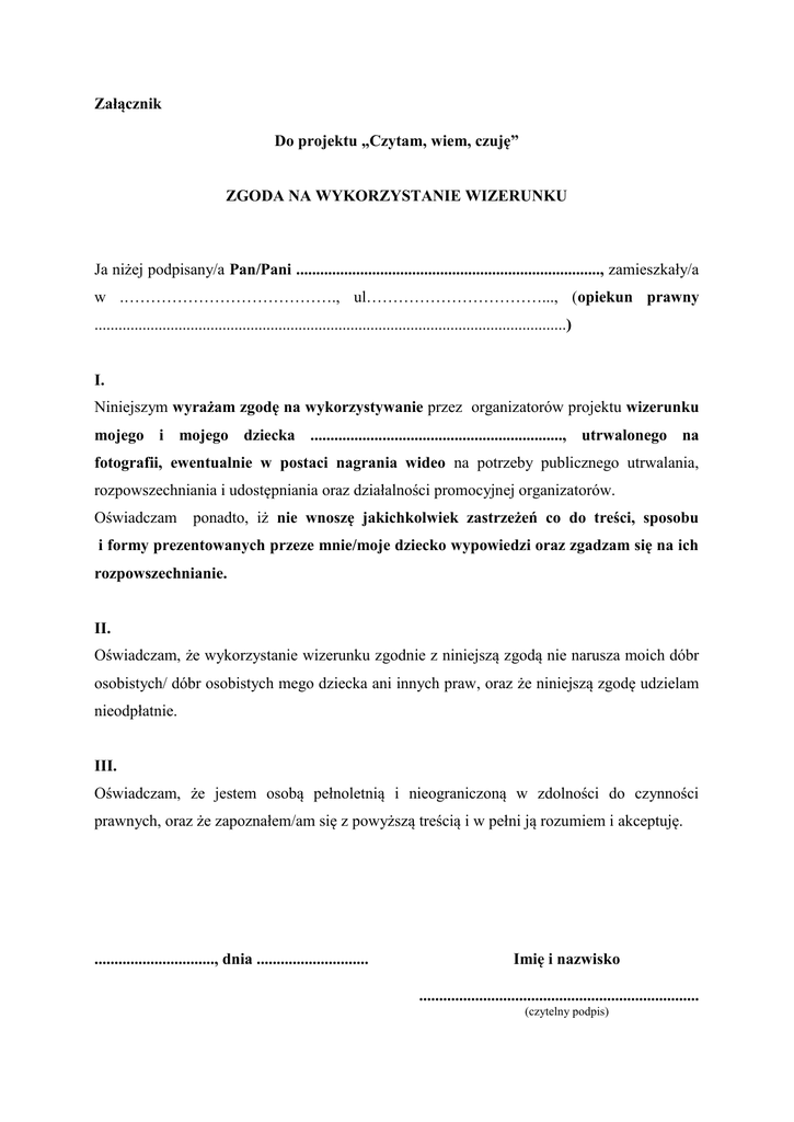 Załącznik Do projektu „Czytam, wiem, czuję” ZGODA NA WYKORZYSTANIE WIZERUNKU Ja niżej podpisany/a Pan/Pani ............................................................................, zamieszkały/a w .…………………………………., ul……………………………..., (opiekun prawny ......................................................................................................................) I. Niniejszym wyrażam zgodę na wykorzystywanie przez organizatorów projektu wizerunku mojego i mojego dziecka ..............................................................., utrwalonego na fotografii, ewentualnie w postaci nagrania wideo na potrzeby publicznego utrwalania, rozpowszechniania i udostępniania oraz działalności promocyjnej organizatorów. Oświadczam ponadto, iż nie wnoszę jakichkolwiek zastrzeżeń co do treści, sposobu i formy prezentowanych przeze mnie/moje dziecko wypowiedzi oraz zgadzam się na ich rozpowszechnianie. II. Oświadczam, że wykorzystanie wizerunku zgodnie z niniejszą zgodą nie narusza moich dóbr osobistych/ dóbr osobistych mego dziecka ani innych praw, oraz że niniejszą zgodę udzielam nieodpłatnie. III. Oświadczam, że jestem osobą pełnoletnią i nieograniczoną w zdolności do czynności prawnych, oraz że zapoznałem/am się z powyższą treścią i w pełni ją rozumiem i akceptuję. .............................., dnia ............................ Imię i nazwisko ...................................................................... (czytelny podpis)