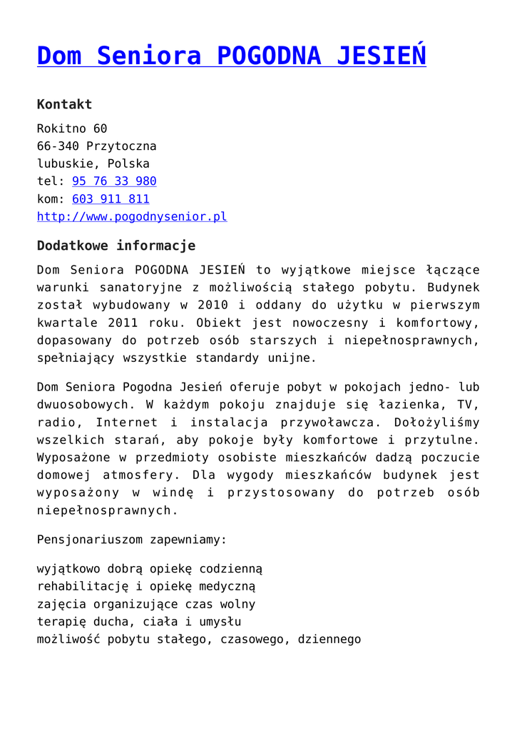 Dom Seniora POGODNA JESIEŃ Kontakt Rokitno 60 66-340 Przytoczna lubuskie, Polska tel: 95 76 33 980 kom: 603 911 811 http://www.pogodnysenior.pl Dodatkowe informacje Dom Seniora POGODNA JESIEŃ to wyjątkowe miejsce łączące warunki sanatoryjne z możliwością stałego pobytu. Budynek został wybudowany w 2010 i oddany do użytku w pierwszym kwartale 2011 roku. Obiekt jest nowoczesny i komfortowy, dopasowany do potrzeb osób starszych i niepełnosprawnych, spełniający wszystkie standardy unijne. Dom Seniora Pogodna Jesień oferuje pobyt w pokojach jedno- lub dwuosobowych. W każdym pokoju znajduje się łazienka, TV, radio, Internet i instalacja przywoławcza. Dołożyliśmy wszelkich starań, aby pokoje były komfortowe i przytulne. Wyposażone w przedmioty osobiste mieszkańców dadzą poczucie domowej atmosfery. Dla wygody mieszkańców budynek jest wyposażony w windę i przystosowany do potrzeb osób niepełnosprawnych. Pensjonariuszom zapewniamy: wyjątkowo dobrą opiekę codzienną rehabilitację i opiekę medyczną zajęcia organizujące czas wolny terapię ducha, ciała i umysłu możliwość pobytu stałego, czasowego, dziennego