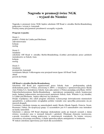 Nagroda w promocji świec NGK - wyjazd do Niemiec Nagrodą w promocji świec NGK będzie szkolenie Off Road w ośrodku Berlin-Brandenburg połączone z wizytą w Autostadt. PoniŜej mamy przyjemność przedstawić szczegóły wyjazdu. Program wyjazdu: Dzień 1: podróŜ z Polski do Linthe pod Berlinem zakwaterowanie kolacja nocleg Dzień 2: śniadanie szkolenie Off Road w ośrodku Berlin-Brandenburg (Linthe) prowadzone przez polskich instruktorów ze Szkoły Auto. kolacja nocleg Dzień 3: śniadanie przejazd do Autostadt zwiedzanie fabryki Volkswagena oraz przejazd torem Iguan All Road Track obiad powrót do Polski Off Road w ośrodku Berlin-Brandenburg Szkolenie Off Road jest organizowane przez Szkołę Auto – profesjonalną szkołę doskonalenia jazdy w Polsce, utworzoną w 2004 r. z inicjatywy i sponsorowaną przez Skoda Auto Polska S.A. Instruktorzy Szkoły Auto jako jedyni w Polsce posiadają certyfikaty ADAC Fahrsicherheitszentrum Berlin-Brandenburg – największej europejskiej szkoły bezpiecznej jazdy, będącej jednocześnie merytorycznym partnerem Szkoły Auto. Właśnie w jej ośrodku, w Linthe pod Berlinem, będzie odbywać się szkolenie. Dzięki współpracy obu szkół program szkolenia wykorzystuje doświadczenia niemieckich specjalistów, a jednocześnie uwzględnia polskie warunki oraz specyfikę poruszania się po naszych drogach. Uczestnicy szkolenia trenują na samochodach marki Skoda (Skoda Superb, Octavia, Scout, Roomster, Fabia). Do dyspozycji grupy 12 uczestników jest 4-5 samochodów oraz instruktor na kaŜdy samochód. Szkolenie z zakresu Off Road obejmuje doskonalenie jazdy po krętych szosach o duŜej róŜnicy wysokości oraz w terenach leśnych i górskich. Obejmuje elementy teoretyczne, a przede wszystkim trening praktyczny w omawianych warunkach. Na koniec wszyscy uczestniczy otrzymają certyfikaty, a chętni sprawdzą nabyte umiejętności w konkursie. W trakcie szkolenia zapewniony jest lunch dla uczestników. 1 Wizyta w Autostadt Autostadt w Wolfsburgu to jeden z najbardziej atrakcyjnych i znaczących parków tematycznych w Niemczech, który uczestnicy zwiedzą pod opieką przewodnika. Na odwaŜnych czeka teŜ przejaŜdŜka po torze przeszkód Iguan All Road Track. Po wspólnym obiedzie uczestniczy ruszą w podróŜ powrotną do Polski. 2