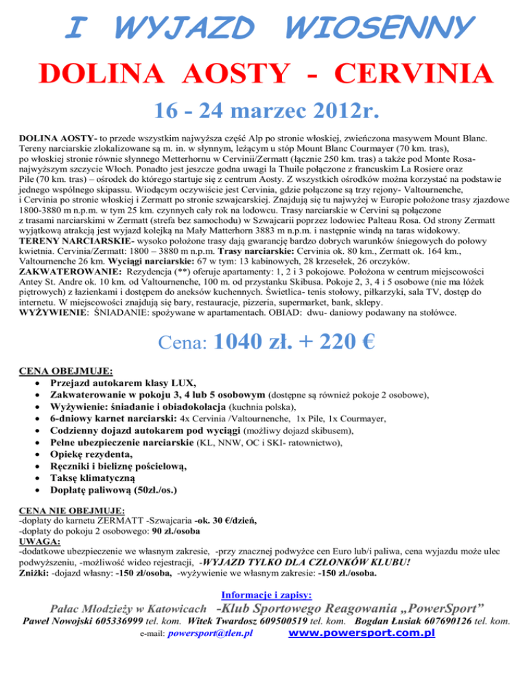 I WYJAZD WIOSENNY DOLINA AOSTY - CERVINIA 16 - 24 marzec 2012r. DOLINA AOSTY- to przede wszystkim najwyższa część Alp po stronie włoskiej, zwieńczona masywem Mount Blanc. Tereny narciarskie zlokalizowane są m. in. w słynnym, leżącym u stóp Mount Blanc Courmayer (70 km. tras), po włoskiej stronie równie słynnego Metterhornu w Cervinii/Zermatt (łącznie 250 km. tras) a także pod Monte Rosanajwyższym szczycie Włoch. Ponadto jest jeszcze godna uwagi la Thuile połączone z francuskim La Rosiere oraz Pile (70 km. tras) – ośrodek do którego startuje się z centrum Aosty. Z wszystkich ośrodków można korzystać na podstawie jednego wspólnego skipassu. Wiodącym oczywiście jest Cervinia, gdzie połączone są trzy rejony- Valtournenche, i Cervinia po stronie włoskiej i Zermatt po stronie szwajcarskiej. Znajdują się tu najwyżej w Europie położone trasy zjazdowe 1800-3880 m n.p.m. w tym 25 km. czynnych cały rok na lodowcu. Trasy narciarskie w Cervini są połączone z trasami narciarskimi w Zermatt (strefa bez samochodu) w Szwajcarii poprzez lodowiec Palteau Rosa. Od strony Zermatt wyjątkową atrakcją jest wyjazd kolejką na Mały Matterhorn 3883 m n.p.m. i następnie windą na taras widokowy. TERENY NARCIARSKIE- wysoko położone trasy dają gwarancję bardzo dobrych warunków śniegowych do połowy kwietnia. Cervinia/Zermatt: 1800 – 3880 m n.p.m. Trasy narciarskie: Cervinia ok. 80 km., Zermatt ok. 164 km., Valtournenche 26 km. Wyciągi narciarskie: 67 w tym: 13 kabinowych, 28 krzesełek, 26 orczyków. ZAKWATEROWANIE: Rezydencja (**) oferuje apartamenty: 1, 2 i 3 pokojowe. Położona w centrum miejscowości Antey St. Andre ok. 10 km. od Valtournenche, 100 m. od przystanku Skibusa. Pokoje 2, 3, 4 i 5 osobowe (nie ma łóżek piętrowych) z łazienkami i dostępem do aneksów kuchennych. Świetlica- tenis stołowy, piłkarzyki, sala TV, dostęp do internetu. W miejscowości znajdują się bary, restauracje, pizzeria, supermarket, bank, sklepy. WYŻYWIENIE: ŚNIADANIE: spożywane w apartamentach. OBIAD: dwu- daniowy podawany na stołówce. Cena: 1040 zł. + 220 € CENA OBEJMUJE: Przejazd autokarem klasy LUX, Zakwaterowanie w pokoju 3, 4 lub 5 osobowym (dostępne są również pokoje 2 osobowe), Wyżywienie: śniadanie i obiadokolacja (kuchnia polska), 6-dniowy karnet narciarski: 4x Cervinia /Valtournenche, 1x Pile, 1x Courmayer, Codzienny dojazd autokarem pod wyciągi (możliwy dojazd skibusem), Pełne ubezpieczenie narciarskie (KL, NNW, OC i SKI- ratownictwo), Opiekę rezydenta, Ręczniki i bieliznę pościelową, Taksę klimatyczną Dopłatę paliwową (50zł./os.) CENA NIE OBEJMUJE: -dopłaty do karnetu ZERMATT -Szwajcaria -ok. 30 €/dzień, -dopłaty do pokoju 2 osobowego: 90 zł./osoba UWAGA: -dodatkowe ubezpieczenie we własnym zakresie, -przy znacznej podwyżce cen Euro lub/i paliwa, cena wyjazdu może ulec podwyższeniu, -możliwość wideo rejestracji, -WYJAZD TYLKO DLA CZŁONKÓW KLUBU! Zniżki: -dojazd własny: -150 zł/osoba, -wyżywienie we własnym zakresie: -150 zł./osoba. Informacje i zapisy: Pałac Młodzieży w Katowicach -Klub Sportowego Reagowania „PowerSport” Paweł Nowojski 605336999 tel. kom. Witek Twardosz 609500519 tel. kom. Bogdan Łusiak 607690126 tel. kom. e-mail: [email protected] www.powersport.com.pl