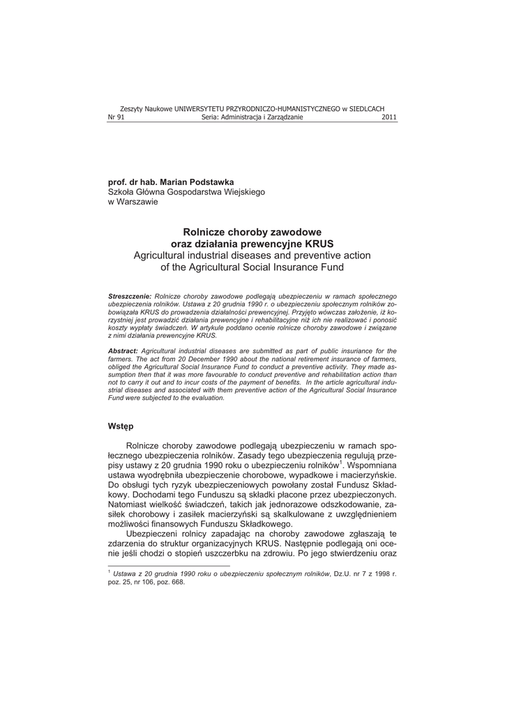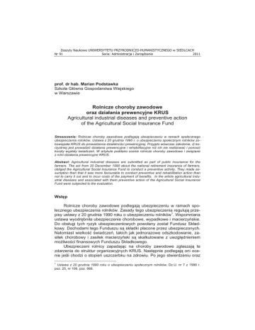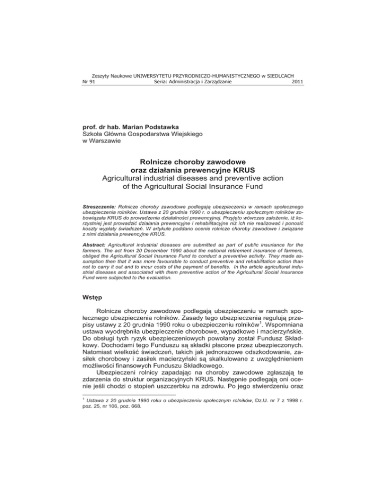 Zeszyty Naukowe UNIWERSYTETU PRZYRODNICZO-HUMANISTYCZNEGO w SIEDLCACH Nr 91 Seria: Administracja i Zarz dzanie 2011 prof. dr hab. Marian Podstawka Szko a G ówna Gospodarstwa Wiejskiego w Warszawie Rolnicze choroby zawodowe oraz dzia ania prewencyjne KRUS Agricultural industrial diseases and preventive action of the Agricultural Social Insurance Fund Streszczenie: Rolnicze choroby zawodowe podlegaj ubezpieczeniu w ramach spo!ecznego ubezpieczenia rolników. Ustawa z 20 grudnia 1990 r. o ubezpieczeniu spo!ecznym rolników zobowi za!a KRUS do prowadzenia dzia!alno"ci prewencyjnej. Przyj#to wówczas za!o$enie, i$ korzystniej jest prowadzi% dzia!ania prewencyjne i rehabilitacyjne ni$ ich nie realizowa% i ponosi% koszty wyp!aty "wiadcze&. W artykule poddano ocenie rolnicze choroby zawodowe i zwi zane z nimi dzia!ania prewencyjne KRUS. Abstract: Agricultural industrial diseases are submitted as part of public insuriance for the farmers. The act from 20 December 1990 about the national retirement insurance of farmers, obliged the Agricultural Social Insurance Fund to conduct a preventive activity. They made assumption then that it was more favourable to conduct preventive and rehabilitation action than not to carry it out and to incur costs of the payment of benefits. In the article agricultural industrial diseases and associated with them preventive action of the Agricultural Social Insurance Fund were subjected to the evaluation. Wst!p Rolnicze choroby zawodowe podlegaj! ubezpieczeniu w ramach spoecznego ubezpieczenia rolników. Zasady tego ubezpieczenia reguluj! przepisy ustawy z 20 grudnia 1990 roku o ubezpieczeniu rolników1. Wspomniana ustawa wyodr"bni a ubezpieczenie chorobowe, wypadkowe i macierzy#skie. Do obs ugi tych ryzyk ubezpieczeniowych powo any zosta Fundusz Sk adkowy. Dochodami tego Funduszu s! sk adki p acone przez ubezpieczonych. Natomiast wielko$% $wiadcze#, takich jak jednorazowe odszkodowanie, zasi ek chorobowy i zasi ek macierzy#ski s! skalkulowane z uwzgl"dnieniem mo&liwo$ci finansowych Funduszu Sk adkowego. Ubezpieczeni rolnicy zapadaj!c na choroby zawodowe zg aszaj! te zdarzenia do struktur organizacyjnych KRUS. Nast"pnie podlegaj! oni ocenie je$li chodzi o stopie# uszczerbku na zdrowiu. Po jego stwierdzeniu oraz 1 Ustawa z 20 grudnia 1990 roku o ubezpieczeniu spo!ecznym rolników, Dz.U. nr 7 z 1998 r. poz. 25, nr 106, poz. 668. 10 M. Podstawka po uznaniu okoliczno$ci obj"tych ubezpieczeniem nast"puje wyp ata jednorazowego odszkodowania. Rolnicze choroby zawodowe W 2010 roku z tytu u rolniczych chorób zawodowych do oddzia ów regionalnych i placówek terenowych KRUS zg oszono !cznie 199 wniosków o jednorazowe odszkodowanie. KRUS przyzna 170 jednorazowych odszkodowa# z tytu u uszczerbku na zdrowiu, w tym jedno z tytu u $mierci wskutek rolniczej choroby zawodowej. Jak przedstawia si" struktura chorób zawodowych w rolnictwie na przestrzeni ostatnich lat prezentuje tabela 1. Tabela 1. Struktura rolniczych chorób zawodowych w latach 2006-2010 Table 1. Structure of agricultural industrial diseases between 2006-2010 Rodzaj choroby Choroby skóry Choroby uk adu oddechowego Choroby zaka'ne Choroby pozosta e Razem 2006 8 35 59 5 107 2007 9 19 70 7 105 2008 11 28 88 3 130 2009 5 19 146 4 174 2010 8 25 134 3 170 (ród o: Wypadki przy pracy i choroby zawodowe rolników oraz dzia!ania prewencyjne KRUS w 2010 r. Source: Accident at work and industrial diseases of farmers and preventive action Agricultural Social Insurance Fund in 2010 W strukturze chorób zawodowych rolników najmniejsz! grup" stanowi! choroby zaka'ne i choroby uk adu oddechowego. Choroby skóry oraz pozosta e choroby wyst"puj! bardzo rzadko. W latach 2006-2010 zauwa&y% mo&na tendencj" wzrostu ogó u rolniczych chorób zawodowych. Jednak&e w stosunku do ponad 26 tys. wypadków przy pracy rolniczej liczba 170 przypadków chorób zawodowych jest znikoma. Rolnicze choroby zawodowe podobne jak wypadki przy pracy rolniczej s! zró&nicowane przestrzennie. Informuje o tym tabela 2. Tabela 2. Liczba chorób zawodowych w latach 2006-2010 wed ug województw Table 2. The number of industrial diseases between 2006-2010 according to the provinces Lp. 1. 2. 3. 4. 5. 6. Województwo dolno$l!skie kujawsko-pomorskie lubelskie lubuskie ódzkie ma opolskie 2006 2007 2008 2009 2010 3 3 17 2 6 9 5 7 18 1 3 10 1 5 33 0 3 6 8 1 33 1 1 3 5 3 18 3 0 8 Seria: Administracja i Zarz dzanie (18)2011 2010-2009 -3 2 -15 2 -1 5 ZN nr 91 Rolnicze choroby zawodowe oraz dzia!ania prewencyjne KRUS 7. 8. 9. 10. 11. 12. 13. 14. 15. 16. mazowieckie opolskie podkarpackie podlaskie pomorskie $l!skie $wi"tokrzyskie warmi#sko-mazurskie wielkopolskie zachodniopomorskie Ogó em 1 0 2 39 3 1 3 11 4 3 107 8 2 1 38 0 0 0 7 1 4 105 10 0 3 46 2 0 3 13 4 1 130 11 9 0 2 61 5 4 1 37 5 3 174 35 2 1 58 6 0 1 19 6 5 170 26 2 -1 -3 1 -4 0 -18 1 2 -4 (ród o: jak w tab. 1. Source: like in tbl. 1. Najwi"cej rolniczych chorób zawodowych ma miejsce w województwach lubelskim i województwie podlaskim raz warmi#sko-mazurskim. W tych województwach odnotowano prawie 50% ogó u rolniczych chorób zawodowych. Zwi!zane jest to, podobnie jak w przypadku wypadków, z kultur! roln!. W tych województwach jest ona na do$% niskim poziomie. Interesuj!cym zagadnieniem jest struktura procentowego uszczerbku na zdrowiu ubezpieczonych spowodowana ró&nymi rodzajami rolniczych chorób zawodowych. Odpowiednie informacje zawiera tabela 3. % uszczerbek na zdrowiu Astma oskrzelowa Zewnatrzpochodne zapalenie p!cherzyków p ucnych Alergiczny nie"yt nosa Choroby skóry Choroby obwodowego uk adu nerwowego wywo ane sposobem wykonywania pracy Obustronny trwa y ubytek s uchu typu #limakowego Choroby zaka$ne Borelioza Kleszczowe zapalenie opon mózgowych Toksokaroza Tabela 3. Struktura procentowego uszczerbku na zdrowiu na tle rolniczych chorób zawodowych Table 3. Structure of the percentage of damage to health relating to agricultural industrial diseases do 5% 6-10% 11-30% 31-60% powy&ej 60% Suma 2 