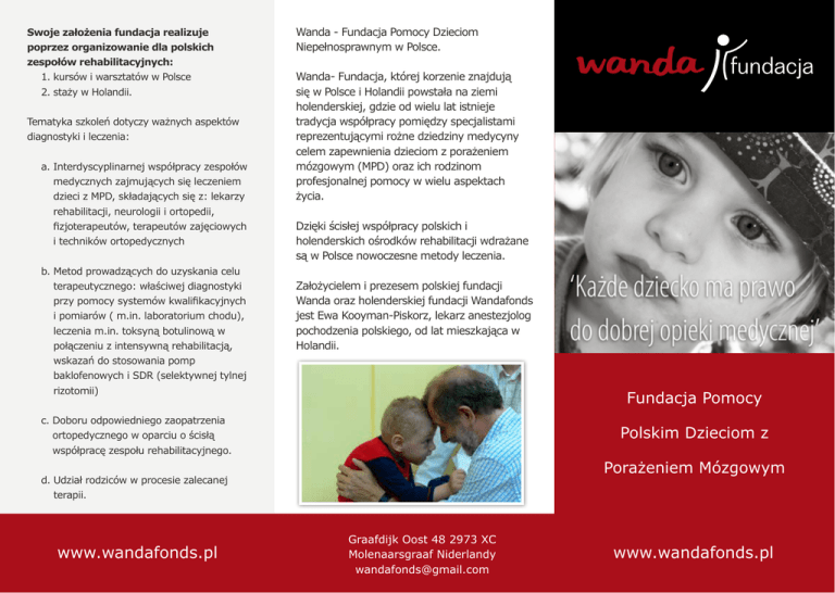 Swoje założenia fundacja realizuje poprzez organizowanie dla polskich zespołów rehabilitacyjnych: 1. kursów i warsztatów w Polsce 2. s taży w Holandii. Tematyka szkoleń dotyczy ważnych aspektów diagnostyki i leczenia: a. Interdyscyplinarnej współpracy zespołów medycznych zajmujących się leczeniem dzieci z MPD, składających się z: lekarzy rehabilitacji, neurologii i ortopedii, fizjoterapeutów, terapeutów zajęciowych i techników ortopedycznych b. Metod prowadzących do uzyskania celu terapeutycznego: właściwej diagnostyki przy pomocy systemów kwalifikacyjnych i pomiarów ( m.in. laboratorium chodu), leczenia m.in. toksyną botulinową w połączeniu z intensywną rehabilitacją, wskazań do stosowania pomp baklofenowych i SDR (selektywnej tylnej rizotomii) c. Doboru odpowiedniego zaopatrzenia ortopedycznego w oparciu o ścisłą współpracę zespołu rehabilitacyjnego. d. U dział rodziców w procesie zalecanej terapii. www.wandafonds.pl Wanda - Fundacja Pomocy Dzieciom Niepełnosprawnym w Polsce. Wanda- Fundacja, której korzenie znajdują się w Polsce i Holandii powstała na ziemi holenderskiej, gdzie od wielu lat istnieje tradycja współpracy pomiędzy specjalistami reprezentującymi rożne dziedziny medycyny celem zapewnienia dzieciom z porażeniem mózgowym (MPD) oraz ich rodzinom profesjonalnej pomocy w wielu aspektach życia. Dzięki ścisłej współpracy polskich i holenderskich ośrodków rehabilitacji wdrażane są w Polsce nowoczesne metody leczenia. Założycielem i prezesem polskiej fundacji Wanda oraz holenderskiej fundacji Wandafonds jest Ewa Kooyman-Piskorz, lekarz anestezjolog pochodzenia polskiego, od lat mieszkająca w Holandii. Fundacja Pomocy Polskim Dzieciom z Porażeniem Mózgowym Graafdijk Oost 48 2973 XC Molenaarsgraaf Niderlandy [email protected] www.wandafonds.pl W dniach 20-22 listopada 2014 roku w Lublinie organizowane są kursy: Podstawowy pt. „Interdyscyplinarne leczenie dzieci z mózgowym porażeniem dziecięcym” oraz dla Zaawansowanych pt. „Poprawa funkcjonowania dzieci z mózgowym porażeniem dziecięcym w życiu codziennym”. Kurs podstawowy i warsztaty pt. „Interdyscyplinarne leczenie dzieci z mózgowym porażeniem dziecięcym” Kurs dla zaawansowanych pt „Najnowsze osiągnięcia w interdyscyplinarnym leczeniu dzieci z porażeniem mózgowym” Tematy główne: Tematy główne: • Pojęciowy model ICF • Potrzeby funkcjonalne dziecka •Przyczyny ograniczeń oraz możliwości rozwoju • Klasyfikacja GMFCS oraz MACS • Formułowanie celów: SMART • Zaopatrzenie ortopedyczne •Plan leczenia (dziecko – czynność – środowisko) •Terapia funkcjonalna – diagnoza i leczenie •Obserwacja i analiza i poprawa funkcji dnia codziennego. •Samoobsługa. Obserwacja i analiza i poprawa. Wykorzystanie pomp bakolofenowych (ITB) •Siedzenie. Obserwacja i analiza. Główne zasady siedzenia i ustawiania pozycji. Terapia. •Chód. Kinetyka. Obserwacja i klasyfikacja chodu. Terapia. Korekcja chodu za pomocą ortez typu AFO. • Projekty specjalne: ankle 7 i neuroswing. • Ustalenie planu leczenia. • Ewaluacja AFO: DYNAMIC Kierownik naukowy kursu: Prof. Jules Becher Podczas kursów zaprezentowane zostaną aktualne metody terapii z udziałem najwybitniejszych polskich i holenderskich specjalistów. Kurs podstawowy jest prowadzony przez polskich specjalistów, kurs dla zaawansowanych jest prowadzony przez zespół polsko-holenderski. Kursy uzyskały patronat honorowy konsultanta krajowego ds. rehabilitacji medycznej – P. prof. Krystyny Księżopolskiej-Orłowskiej Kierownik Naukowy kursu: dr med. Jolanta Taczała Kursy uzyskały akredytacje Polskiego Towarzystwa Rehabilitacji, Polskiego Towarzystwa Neurologów Dziecięcych i Polskiego Towarzystwa Ortopedii i Traumatologii Narządu Ruchu Szczegółowe informacje o kursie dostępne są na stronie internetowej: www.wandafonds.pl