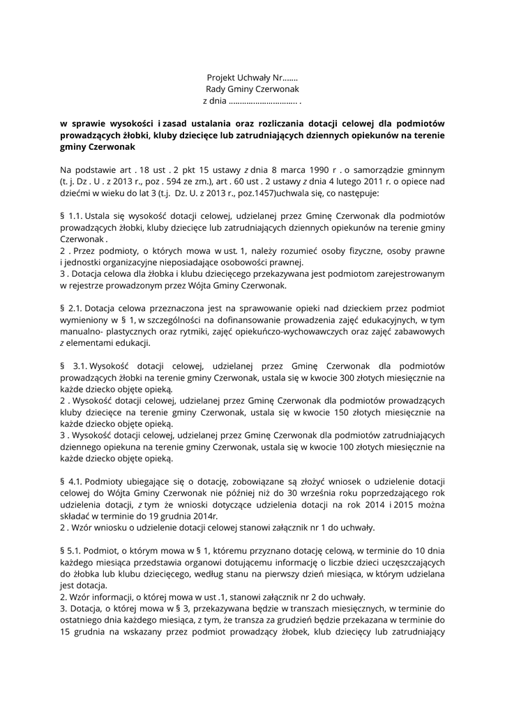 Projekt Uchwały Nr……. Rady Gminy Czerwonak z dnia …………………………. . w sprawie wysokości i zasad ustalania oraz rozliczania dotacji celowej dla podmiotów prowadzących żłobki, kluby dziecięce lub zatrudniających dziennych opiekunów na terenie gminy Czerwonak Na podstawie art . 18 ust . 2 pkt 15 ustawy z dnia 8 marca 1990 r . o samorządzie gminnym (t. j. Dz . U . z 2013 r., poz . 594 ze zm.), art . 60 ust . 2 ustawy z dnia 4 lutego 2011 r. o opiece nad dziećmi w wieku do lat 3 (t.j. Dz. U. z 2013 r., poz.1457)uchwala się, co następuje: § 1.1. Ustala się wysokość dotacji celowej, udzielanej przez Gminę Czerwonak dla podmiotów prowadzących żłobki, kluby dziecięce lub zatrudniających dziennych opiekunów na terenie gminy Czerwonak . 2 . Przez podmioty, o których mowa w ust. 1, należy rozumieć osoby fizyczne, osoby prawne i jednostki organizacyjne nieposiadające osobowości prawnej. 3 . Dotacja celowa dla żłobka i klubu dziecięcego przekazywana jest podmiotom zarejestrowanym w rejestrze prowadzonym przez Wójta Gminy Czerwonak. § 2.1. Dotacja celowa przeznaczona jest na sprawowanie opieki nad dzieckiem przez podmiot wymieniony w § 1, w szczególności na dofinansowanie prowadzenia zajęć edukacyjnych, w tym manualno- plastycznych oraz rytmiki, zajęć opiekuńczo-wychowawczych oraz zajęć zabawowych z elementami edukacji. § 3.1. Wysokość dotacji celowej, udzielanej przez Gminę Czerwonak dla podmiotów prowadzących żłobki na terenie gminy Czerwonak, ustala się w kwocie 300 złotych miesięcznie na każde dziecko objęte opieką. 2 . Wysokość dotacji celowej, udzielanej przez Gminę Czerwonak dla podmiotów prowadzących kluby dziecięce na terenie gminy Czerwonak, ustala się w kwocie 150 złotych miesięcznie na każde dziecko objęte opieką. 3 . Wysokość dotacji celowej, udzielanej przez Gminę Czerwonak dla podmiotów zatrudniających dziennego opiekuna na terenie gminy Czerwonak, ustala się w kwocie 100 złotych miesięcznie na każde dziecko objęte opieką. § 4.1. Podmioty ubiegające się o dotację, zobowiązane są złożyć wniosek o udzielenie dotacji celowej do Wójta Gminy Czerwonak nie później niż do 30 września roku poprzedzającego rok udzielenia dotacji, z tym że wnioski dotyczące udzielenia dotacji na rok 2014 i 2015 można składać w terminie do 19 grudnia 2014r. 2 . Wzór wniosku o udzielenie dotacji celowej stanowi załącznik nr 1 do uchwały. § 5.1. Podmiot, o którym mowa w § 1, któremu przyznano dotację celową, w terminie do 10 dnia każdego miesiąca przedstawia organowi dotującemu informację o liczbie dzieci uczęszczających do żłobka lub klubu dziecięcego, według stanu na pierwszy dzień miesiąca, w którym udzielana jest dotacja. 2. Wzór informacji, o której mowa w ust .1, stanowi załącznik nr 2 do uchwały. 3. Dotacja, o której mowa w § 3, przekazywana będzie w transzach miesięcznych, w terminie do ostatniego dnia każdego miesiąca, z tym, że transza za grudzień będzie przekazana w terminie do 15 grudnia na wskazany przez podmiot prowadzący żłobek, klub dziecięcy lub zatrudniający dziennych opiekunów rachunek bankowy, po uprzednim złożeniu informacji o faktycznej liczbie dzieci objętych opieką. § 6.1. Podmiot prowadzący żłobek, klub dziecięcy lub zatrudniający dziennych opiekunów sporządza roczne rozliczenie wykorzystanej dotacji, ujęte w zbiorczym zestawieniu, obejmujące informację o kwocie otrzymanej dotacji oraz faktycznej liczbie dzieci, z wyszczególnieniem kwot na poszczególne rodzaje wydatków bieżących związanych z zapewnieniem opieki nad dziećmi poniesionymi w danym roku, według wzoru stanowiącego załącznik nr 3 do uchwały. 2. Rozliczenie wykorzystania dotacji podlega przekazaniu do Wójta Gminy Czerwonak do 20 stycznia roku następnego po roku udzielenia dotacji lub w przypadku, gdy podmiot kończy działalność, w trakcie roku budżetowego, w terminie 30 dni po otrzymaniu ostatniej transzy dotacji. 3 . Podmioty, o których mowa w § 1 uchwały, zobowiązane są wykorzystać przyznaną dotację do 31 grudnia roku, w którym jej udzielono, a kwotę dotacji niewykorzystanej w tym terminie zwrócić do budżetu Gminy Czerwonak - w trybie i na zasadach określonych ustawą z dnia 27 sierpnia 2009 r. o finansach publicznych (t . j . Dz . U . z 2013 r., poz . 885 z późn. zm.). § 7. Wykonanie uchwały powierza się Wójtowi Gminy Czerwonak. § 8. Uchwała wchodzi w życie po upływie 14 dni od dnia ogłoszenia w Dzienniku Urzędowym Województwa Wielkopolskiego. Uzasadnienie Projektu Uchwały Nr …. Rady Gminy Czerwonak z dnia ………………. w sprawie wysokości i zasad ustalania oraz rozliczania dotacji celowej dla podmiotów prowadzących żłobki, kluby dziecięce lub zatrudniających dziennych opiekunów na terenie gminy Czerwonak Zgodnie z art.60 ust.1 ustawy z dnia 4 lutego 2011r . o opiece nad dziećmi do lat 3 (Dz . U . z 2013r., poz. 1457 j.t.) podmioty prowadzące żłobki i kluby dziecięce (osoby fizyczne, osoby prawne i jednostki organizacyjne nieposiadające osobowości prawnej) mogą otrzymywać, na każde dziecko objęte, opieką dotację celową z budżetu gminy. Udzielanie dotacji wymaga zabezpieczenia w budżecie gminy odpowiednich środków finansowych na ten cel. Wysokość i zasady ustalania dotacji celowej określa Rada Gminy w drodze uchwały. Środki te są przeznaczone jako dotacja celowa z budżetu gminy dla podmiotów prowadzących żłobki na terenie gminy, liczone na każde dziecko objęte opieką. W istniejących obecnie w gminie żłobkach stworzono łącznie 94 miejsca do opieki nad dziećmi. Podjęcie niniejszej uchwały rodzi skutki finansowe dla budżetu gminy na przyszłość, nie tylko na kolejny jeden rok, obligując wójta do wydzielenia środków na ten cel w każdym projekcie budżetu na kolejny rok. W związku z tym, że na terenie Gminy Czerwonak istnieją żłobki opiekujące si