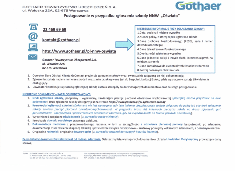 ..•• I\ • ..". UBEZPIEczeŃ Postępowanie w przypadku zgłoszenia szkody NNW "Oświata" B' @ - NIEZBĘDNE INFORMAQE PRZY ZGŁASZANIU SZKODy: 224696969 l.Data, godzina I miejsce wypadku 2.Numer polisy, z której będzie zgłaszana szkoda konta [email protected] http://www.gothaer.pl/pl-n Gothaer Towarzystwo ul. Wołoska 22A 02-675 Warszawa 3.Dane osobowe Poszkodowanego dowodu osobistego) nw ..oswiata Ubezpieczeń S.A. 4.Dane teleadresowe (PESEL, seria I numer Poszkodowanego S.Okollcznoścl zaistnienia wypadku 6.Dane jednostki policji i innych służb, Interweniujących miejscu zdarzenia 7.Dane kontaktowe do ewentualnych S.Rodzaj doznanych obrażeń ciała. świadków zdarzenia 1. 2. Operator Biura Obsługi Klienta GoContact przyjmuje zgłoszenie szkody wraz ewentualnie załączoną do niej dokumentacją. Zgłoszeniu zostaje nadany numerze szkody I wraz z nim przekazywane jest do Zespołu Likwidacji Szkód, gdzie wyznaczony zostaje Likwidator je obsługujący. 3. Likwidator kontaktuje się z osobą zgłaszającą szkodę I ustala szczegóły co do wymaganych dokumentów na oraz dalszego postępowania. NIEZB~DNE DOKUMENTY - KATALOG PODSTAWOWY: 1. 2. 3. Druk zgłoszenia szkody, podpisany i wypełniony, zawierający pieczęć placówki oświatowo wychowawczej (pieczątkę można przystawić na dole dokumentu). Druk zgłoszenia szkody dostępny jest na stronie http://www.gothaer.pl/pl-zgloszenle-szkody Kserokopia legitymacji szkolnej (Dokument nie jest wymagany, gdy lista imienna ubezpieczonych została dołączona do polisy lub gdy druk zgłoszenIa szkody zawiera pieczęć placówki oświatowo-wychowawczej. W przypadku braku list imiennych pieczątka szkoły na druku zgłoszenia jest potwierdzeniem ubezpieczenia i potwierdzeniem okoliczności zdarzenia, gdy do wypadku doszło na terenie placówki oświatowej). Wypełnione I podpisane oświadczenie (w przypadku osoby nle/etniej). 4. Kserokopia dowodu osobistego S. Dokumentacja medyczna z przeprowadzonego leczenia, w tym w szczególności z udzielenia pierwszej pomocy bezpośrednio po zdarzeniu; dokumentacja musi zawierać diagnozę lekarską I potwierdzać związek przyczynowo - skutkowy pomiędzy wskazanym zdarzeniem, a doznanym urazem. Oryginalne rachunki I oryginalne dowody opłat (w przypadku roszczeń dotyczących kosztów leczenia). 6. Pełen katalog dokumentów prawnego opiekuna. zależny lest od rodzalu zdarzenia. Ostateczną listę wymaganych dokumentów sprawę. IIU'pl określa likwidator Merytoryczny prowadzący daną